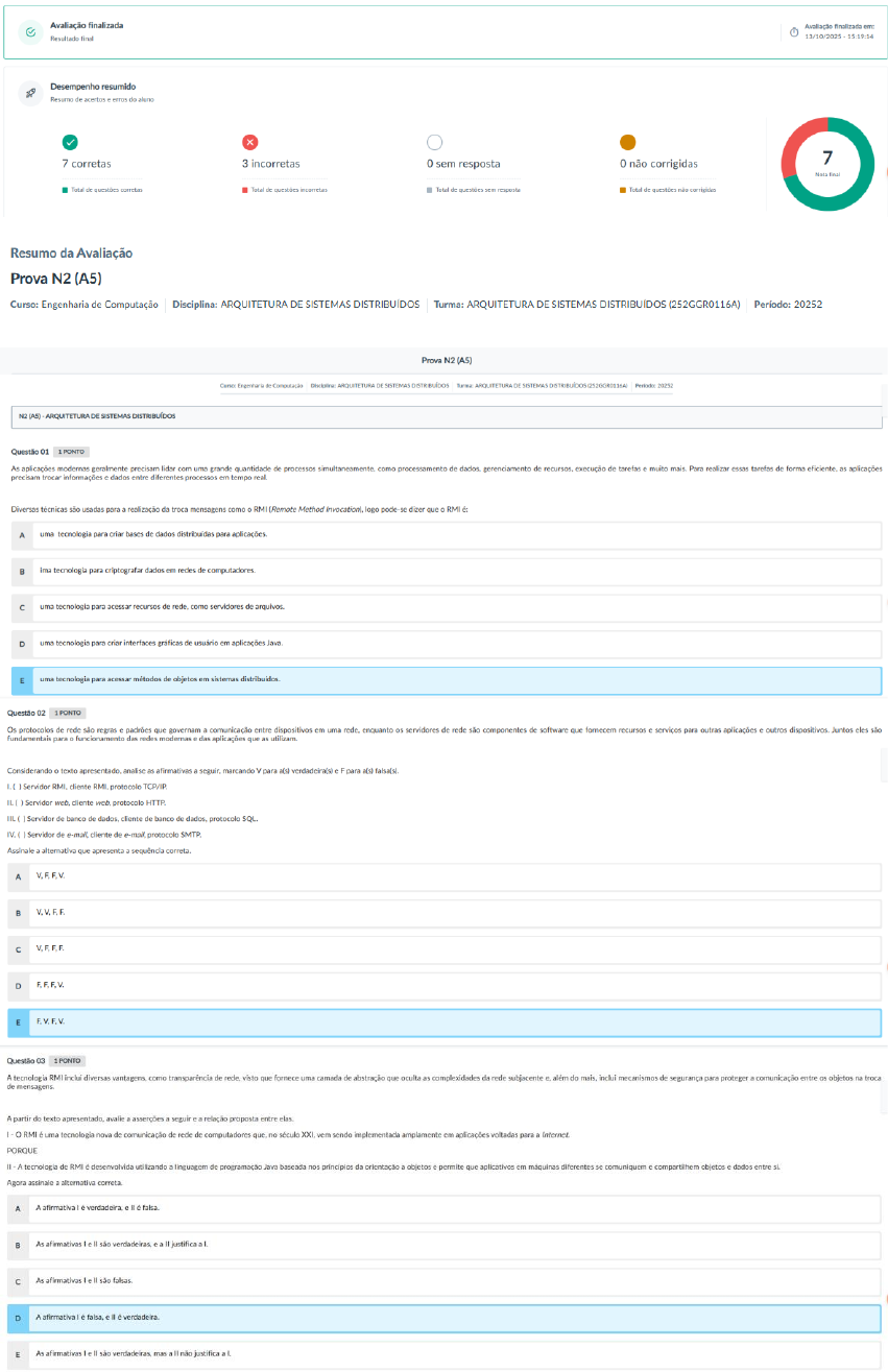 Avaliação finalizada Avaliação finalizada em: Resultado final 13/10/2025 15:19:14 Desempenho resumido Resumo de acertos erros do aluno 7 corretas 3 incorretas 0 sem resposta 0 não corrigidas 7 Total corretas Total questões incorretas Total questões resposta Total questões corrigidas Resumo da Avaliação Prova N2 (A5) Curso: Engenharia de Computação Disciplina: ARQUITETURA DE SISTEMAS DISTRIBUÍDOS Turma: ARQUITETURA DE SISTEMAS DISTRIBUÍDOS (252GGR0116A) Período: 20252 Prova (A5) Engenharia Computação ARQUITETURA DE SISTEMAS DISTRIBUÍDOS ARQUITETURA DE SISTEMAS DISTRIBUÍDOS (252GGR0116A) 20252 N2 (A5) ARQUITETURA DE SISTEMAS DISTRIBUÍDOS Questão 01 PONTO As aplicações modernas geralmente precisam lidar com uma grande quantidade de processos simultaneamente, como processamento de dados, gerenciamento de execução de tarefas muito mais. Para realizar essas tarefas de forma as aplicações precisam trocar informações dados entre diferentes processos em tempo real. Diversas técnicas são usadas para realização da troca mensagens como RMI (Remote Method logo pode se dizer que RMI A uma tecnologia para criar bases de dados distribuídas para aplicações. B ima tecnologia para criptografar dados em redes de uma tecnologia para acessar recursos de rede. como servidores de arquivos. D uma tecnologia para criar interfaces gráficas de usuário em aplicações Java. E uma tecnologia para acessar métodos de objetos em sistemas Questão 02 PONTO Os protocolos de rede são regras e padrões que governam comunicação entre dispositivos em uma rede, enquanto os servidores de rede são componentes de software que fornecem recursos serviços para outras aplicações outros Juntos eles são fundamentais para o funcionamento das redes modernas das aplicações que as utilizam. Considerando texto apresentado, analise as afirmativas seguir, marcando V para a(s) verdadeira(s) para a(s) falsa(s). Servidor cliente protocolo TCP/IP. Servidor cliente protocolo HTTP. III. Servidor de banco de dados, cliente de banco de dados, protocolo Servidor de e-mail, cliente de -mail, protocolo SMTP. Assinale alternativa que apresenta sequência A V.F.F.V. D E F.V.F.V. Questão 03 PONTO A tecnologia RMI inclui diversas vantagens, como de visto que fornece uma camada de abstração que oculta as complexidades da rede subjacente além do mais, inclui mecanismos de segurança para proteger comunicação entre os objetos na troca de A partir do texto avalie asserções seguir relação proposta entre elas. RMI é uma tecnologia nova de comunicação de rede de computadores que, no século vem sendo implementada amplamente em aplicações voltadas para PORQUE tecnologia de RMI desenvolvida utilizando linguagem de programação Java baseada nos principios da orientação objetos permite que aplicativos em máquinas diferentes se comuniquem compartilhem objetos dados entre si. Agora assinale alternativa A afirmativa As afirmativas e são justifica As afirmativas são D afirmativa falsa, E As afirmativas são mas não justificaQuestão 04 Essas tecnologias oferecem diferentes recursos como a interoperabilidade com plataformas dispositivos eficiência na comunicação, escalabilidade segurança com REST, SOAP. A escolha da tecnologia mais adequada depende das necessidades da aplicação das limitações técnicas de cada tecnologia. A partir do texto avalie asserções seguir relação proposta entre elas. tecnologia embora utilizada na Internet por aplicações de sistema se gradativamente ultrapassada por ser uma tecnologia criada nos meados da década de 1970. PORQUE Na as aplicações do século XXI precisam trocar mensagens entre nesse tecnologia RMI ainda persiste com uma das diversas formas de troca de mensagem entre aplicações para sistema Agora assinale alternativa correta. A As afirmativas são verdadeiras, mas all não justifica al. As afirmativas são afirmativa verdadeira, falsa. D A afirmativa E As afirmativas são verdadeiras, justifica Leia trecho seguir. API de socket um conjunto de protocolos padrões utilizados para criação, configuração comunicação com sockets em um ambiente de rede. de socket pode ser implementada em diversas linguagens de programação sistemas operacionais, incluindo C/C entre outras. Após leitura do texto anterior, considerando sistemas que implementam API de analise as alternativas seguir assinale para a(s) verdadeiras para as Falsa(s). Sistema de arquivos Sistema de gerenciamento de banco de dados. III. Sistema de criptografia de dados. IV. Sistema de compressão de arquivos. Assinale alternativa que apresenta sequência correta. A V.F.F.V. F.V.F.V. D V.V.F.V. E Questão 06 1 PONTO P2P são redes muito populares para compartilhamento de como músicas, filmes, programas de computador outros conteúdos digitais, pois permitem que os usuários baixem arquivos de outros usuários conectados rede, de forma rápida fácil. Diversas aplicações fazem uso do tipo P2P para download de arquivos, como arquivos de som, imagem Sobre rede podemos dizer que: A uma arquitetura centralizada que utiliza servidores cliente servidor. é uma arquitetura que utiliza servidores dedicados. é uma arquitetura descentralizada que utiliza servidores dedicados. D uma arquitetura descentralizada que não utiliza servidores dedicados. E uma arquitetura centralizada que utiliza servidores dedicados. Questão 07 PONTO Uma das grandes vantagens de usar uma rede de arquitetura P2P descentralização. Isso porque rede P2P não controlada que significa que não há um único ponto de falha na que torna rede mais robusta menos vulnerável ataques ou falhas de hardware. Entretanto a rede P2P para aplicações de Internet apresenta algumas desvantagens. Sobre as desvantagens da arquitetura analise as afirmativas seguir. Permite redução da latência da rede. Permite maior segurança da rede. III Permite maior escalabilidade da rede. IV Permite maior consumo de recursos de rede. É correto qu