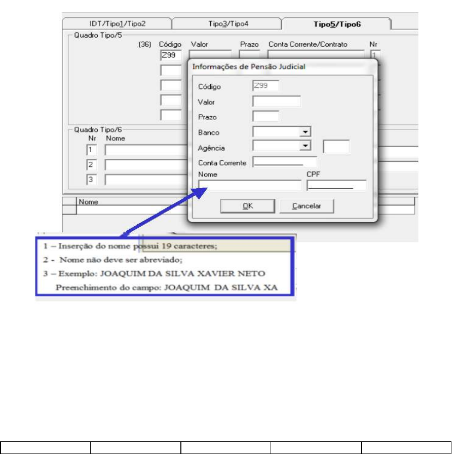 Visto: ________ Manual M.A. Anexo: 6 Assunto: P.1 Pag: 1 Data: 01/2023 PENSÃO ALIMENTICIA P.1.1. FINALIDADE Orientar os Ordenadores de Despesas (OD) das Unidades Gestoras (UG), quanto aos procedimentos a serem adotados no que diz respeito ao assunto: Pensão Judicial,( Art 734 Código de Processo Civil) Pensão Extrajudicial (Lei 11.441 de 4 janeiro de 2007). P.1.2. OBJETIVO Estabelecer os procedimentos para operacionalização do desconto de Pensão Alimentícia para MILITAR DA ATIVA, INATIVO E PENSIONISTA MILITAR. P.1.3. PREENCHIMENTO DO FORMULÁRIO DE IMPLANTAÇÃO DE PAGAMENTO(FIP) P.1.3.1. Quadro “TIPO 5/ TIPO 6 a. CODIGO: preenchido com Z99 ou ZJA Visto: ________ Manual M.A. Anexo: 6 Assunto: P.1 Pag: 2 Data: 01/2023 b. VALOR : Valor da Pensão Judicial ( Conforme sentença judicial) c. PRAZO : - Se o desconto for por prazo indeterminado, o campo deve ser preenchido com zeros (ØØØØ); - Se o desconto ocorrer apenas no mês da implantação, o campo deve ser preenchido com o mês e o ano da implantação; E - Se o desconto ocorrer em prazo determinado, o campo deve ser preenchido, com mês e ano do ultimo desconto. d. CONTA- CORRENTE: Deve ser preenchido com o código do Banco, com o código da Agência e com o número da conta-corrente do beneficiário da Pensão Judicial (Z99), ou Pensão Extrajudicial ( ZJA). CÓDIGO DO BANCO: Constante da TAB PAG AGÊNCIA: Cadastrada na TAB PAG CONTA- CORRENTE: Seguir observações abaixo OBSERVAÇÃO EXEMPLO CEF (Caixa Econômica Federal), preencher a conta corrente com tipo: 013, 023, 001 ou 002(lembrando que só a CEF aceita conta poupança, e que o tipo 023 só aceita proventos até R$ 1.000,00). CEF = 104 AGENCIA=0404(Sistema gera o DV da agência automaticamente); CONTA CORRENTE = Tipo 013 c/c 52788 - Preencher com zeros entre o tipo e a conta- corrente, para completar os 12 dígitos 10404040013000052788 Demais estabelecimentos bancários, a OM deverá BANCO DO BRASIL = 001 Visto: ________ Manual M.A. Anexo: 6 Assunto: P.1 Pag: 3 Data: 01/2023 lançar direto o n° da C/C AGENCIA = 0496 (Sistema gera o DV da agência) CONTA = 6886789 (sistema vai preencher com zeros para completar 10 dígitos). e. NOME: Preencher com o nome da pensionista sem abreviar, observando que esse campo possui 19 caracteres. Exemplo: JOAQUIM DA SILVA XAVIER NETO Preenchimento do campo: P.1.4. PREENCHIMENTO DO FORMULÁRIO DE ALTERAÇÃO DE PAGAMENTO (FAP) P.1.4.1. Implantação da Pensão Judicial ( Z99) ou Pensão Extrajudicial( ZJA) a) Campos utilizados no FAP: MILITAR DA ATIVA E INATIVO PENSIONISTA MILITAR 36XX 41XX b) Implantação de uma pensão judicial: MILITAR DA ATIVA E INATIVO PENSIONISTA MILITAR ALT 1 Prec CP campo 3601 ALT 1 Prec CP campo 4101 c) A tela do FAP ,no momento da implantação da pensão alimentícia, será da seguinte forma: Visto: ________ Manual M.A. Anexo: 6 Assunto: P.1 Pag: 4 Data: 01/2023 d) Implantação de mais de uma pensão (judicial ou extrajudicial), para militar no mesmo mês, na mesma corrida de pagamento. Visto: ________ Manual M.A. Anexo: 6 Assunto: P.1 Pag: 5 Data: 01/2023 MILITAR DA ATIVA E INATIVO PENSIONISTA MILITAR ALT 1 Prec CP campo 3601 para 1ª pensão ALT 1 Prec CP campo 3603 para 2ª pensão ALT 1 Prec CP campo 3605 para 3ª pensão ALT 1 Prec CP campo 3607 para 4ª pensão ALT 1 Prec CP campo 4101 para 1ª pensão ALT 1 Prec CP campo 4103 para 2ª pensão ALT 1 Prec CP campo 4105 para 3ª pensão ALT 1 Prec CP campo 4107 para 4ª pensão INFORMAÇÃO IMPORTANTE: independentemente, se o militar ou pensionista possuir 5 pensões já implantadas,e quando for necessário implantar nova pensão, utilizar sempre 3601 e ou 4101( Z99 ou ZJA), ou pois quando o sistema receber essa informação, vai disponibilizar a nova pensão, respeitando a seqüência já existente na ficha cadastro. e) Caso em que a OM tenha que implantar uma PJ com valor atrasado e prazo determinado. (Os valores atrasados deverão ser efetuados por meio da implantação de uma nova pensão (judicial ou extrajudicial), seguindo orientação dos tópicos anteriores, com a diferença no prazo). Exemplo : Militar já possui pensão implantada em nome de Maria Augusta(ZJA), e será implantada uma nova pensão em nome de Joana Moreira( Z99), e também tem que implantar uma pensão atrasada para Maria Augusta( ZJA) no valor de R$ 150,00 no pagamento do mês de 07/09. FAP DIGITAL MÊS 07/09 MILITAR DA ATIVA OU INATIVO FAP DIGITAL MÊS 07/09 PENSIONISTA MILITAR ALT 1 Prec CP campo 3601 Z99 valor , prazo ,banco,agencia e conta corrente Joana Moreira ALT 1 Prec CP campo 3603 ZJA valor, prazo , banco,agencia e conta corrente Maria Augusta ALT 1 Prec CP campo 4101 Z99 valor , prazo, banco,agencia e conta corrente Joana Moreira ALT 1 Prec CP campo 4103 ZJA valor, prazo, banco,agencia e conta corrente Maria Augusta As pensões serão disponibilizadas da seguinte forma na ficha cadastro: MILITAR ATIVA E INATIVO PENSIONISTA MILITAR ZJA 4 215,00 S/PR 001 00019 9251027 MARIA AUGUSTA ( Já cadastrada) Z99 4 325,00 S/PR 001 00089 6912004 JOANA MOREIRA ( Nova implantação) ZJA 4 150,00 0609 001 00019 9251027 MARIA AUGUSTA ( pensão atrasada) ZJA 4 215,00 S/PR 001 00019 9251027 MARIA AUGUSTA ( Já cadastrada) Z99 4 325,00 S/PR 001 00089 6912004 JOANA MOREIRA ( Nova implantação) ZJA 4 150,00 0609 001 00019 9251027 MARIA AUGUSTA ( pensão atrasada Os campos das pensões para alterações ou exclusões futuras serão os seguintes: Visto: ________ Manual M.A. Anexo: 6 Assunto: P.1 Pag: 6 Data: 01/2023 ZJA 4 215,00 S/PR 001 00019 9251027 MARIA AUGUSTA 3601 ou 4101 (para efeito de alterações ou exclusões) Z99 4 325,00 S/PR 001 00089 6912004 JOANA MOREIRA 3602 ou 4102 (para efeito de alterações ou exclusões) ZJA 4 150,00 0109 001 00019 9251027 MARIA AUGUSTA 3603 ou 4103 (para efeito de alterações ou exclusões) OBS: para eventual alteração ou exclusão da pensão, sempre obedecer à seqüência que o sistema disponibilizou as pensões na ficha cadastro do militar