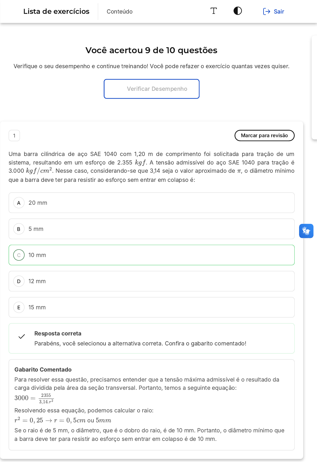 06/09/25, 12:18 estacio.saladeavaliacoes.com.br/exercicio/68bc4f3757e88db34d773a18/gabarito/ https://estacio.saladeavaliacoes.com.br/exercicio/68bc4f3757e88db34d773a18/gabarito/ 1/11 Você acertou 9 de 10 questões Verifique o seu desempenho e continue treinando! Você pode refazer o exercício quantas vezes quiser. Verificar Desempenho A B C D E 1 Marcar para revisão Uma barra cilíndrica de aço SAE 1040 com 1,20 m de comprimento foi solicitada para tração de um sistema, resultando em um esforço de 2.355 . A tensão admissível do aço SAE 1040 para tração é 3.000 . Nesse caso, considerando-se que 3,14 seja o valor aproximado de , o diâmetro mínimo que a barra deve ter para resistir ao esforço sem entrar em colapso é: kgf kgf/cm2 π 20 mm 5 mm 10 mm 12 mm 15 mm Resposta correta Parabéns, você selecionou a alternativa correta. Confira o gabarito comentado! Gabarito Comentado Para resolver essa questão, precisamos entender que a tensão máxima admissível é o resultado da carga dividida pela área da seção transversal. Portanto, temos a seguinte equação: Resolvendo essa equação, podemos calcular o raio: ou Se o raio é de 5 mm, o diâmetro, que é o dobro do raio, é de 10 mm. Portanto, o diâmetro mínimo que a barra deve ter para resistir ao esforço sem entrar em colapso é de 10 mm. 3000 = 2355 3,14.r2 r2 = 0, 25 → r = 0, 5cm 5mm Lista de exercícios Conteúdo Sair 06/09/25, 12:18 estacio.saladeavaliacoes.com.br/exercicio/68bc4f3757e88db34d773a18/gabarito/ https://estacio.saladeavaliacoes.com.br/exercicio/68bc4f3757e88db34d773a18/gabarito/ 2/11 A B C D E 2 Marcar para revisão A tensão e a deformação também desempenham um papel fundamental na análise de elementos estruturais como vigas e pilares. Através de cálculos de tensão e deformação, é possível determinar se uma estrutura é capaz de suportar as cargas aplicadas sem fraturar. Duas pranchas de madeira, cada uma com 15 mm de espessura e 225 mm de largura, são unidas pela junta de encaixe mostrada na figura. Sabendo que a madeira utilizada rompe por cisalhamento ao longo das fibras quando a tensão de cisalhamento média alcança 10 MPa, determine a intensidade P da carga axial que romperá a junta. Fonte: BEER, F. P., JOHNSTON, E. R., DEWOLF, J. T., & MAZUREK, D. F. Mecânica dos materiais. Porto Alegre: Amgh. 5ª ed. 2011. p.41. 8,8 kN. 18,8 kN. 28,8 kN. 38,8 kN. 48,8 kN. Resposta incorreta Opa! A alternativa correta é a letra C. Confira o gabarito comentado! Gabarito Comentado Primeiramente, precisamos determinar o número de trincas que irão ocorrer: no caso 12 06/09/25, 12:18 estacio.saladeavaliacoes.com.br/exercicio/68bc4f3757e88db34d773a18/gabarito/ https://estacio.saladeavaliacoes.com.br/exercicio/68bc4f3757e88db34d773a18/gabarito/ 3/11 A B C D E Aplicando: τmbx = 10 × 106 = Pmax = 28, 8kN. Pmax Aseção transversal Pmax 12 ⋅ (16 × 10−3 ⋅ 15 × 10−3) 3 Marcar para revisão Ao projetar uma ponte suspensa, é necessário considerar a tensão normal nos cabos principais que sustentam a estrutura. Essa tensão deve ser cuidadosamente calculada para garantir que os cabos não sofram deformações excessivas ou falhas. Duas barras cilíndricas de seção transversal cheia AB e BC são soldadas uma à outra em B e submetidas a um carregamento conforme mostra a figura. Sabendo que d �60 mm e d �25 mm, calcule a tensão normal média no ponto médio da (a) barra AB e (b) barra BC. Fonte: BEER, F. P., JOHNSTON, E. R., DEWOLF, J. T., & MAZUREK, D. F. Mecânica dos materiais. Porto Alegre: Amgh. 5ª ed. 2011. p.38. 1 1 σ = �61,12 MPa e σ = �24,8 MPa.AB BC σ = �24,8 MPa e σ = �71,12 MPa.AB BC σ = �24,8 MPa e σ = �51,12 MPa.AB BC σ = �44,8 MPa e σ = �61,12 MPa.AB BC σ = �24,8 MPa e σ = �61,12 MPa.AB BC Resposta correta Parabéns, você selecionou a alternativa correta. Confira o gabarito comentado! Gabarito Comentado Barra :AB 06/09/25, 12:18 estacio.saladeavaliacoes.com.br/exercicio/68bc4f3757e88db34d773a18/gabarito/ https://estacio.saladeavaliacoes.com.br/exercicio/68bc4f3757e88db34d773a18/gabarito/ 4/11 A B C D E Barra BC� Logo, P = −40 − 30 = −70kkN A = d2 1 = (60 × 10−3) 2 = 2, 83 × 10−3 m2 σAB = = = −24, 8 × 106 = −24, 8MPa π 4 π 4 P A −70 × 103 2, 83 × 10−3 P = −30kN A = d2 2 = (25 × 10−3) 2 = 490, 9 × 10−6 m2π 4 π 4 σBC = = = −61, 12 × 106 = −61, 12MPaP A −30×103 490,9×10−6 σAB = 24, 8MPae –– σEC = −61, 12MPa 4 Marcar para revisão Considere uma barra de seção reta quadrada de lado 20 cm, engastada no solo. Uma força F tangencial de 60 kN atua na extremidade livre dessa barra, conforme a figura. A tensão média cisalhante é igual a esquerda. 1,0 MPa 1,2 MPa 1,5 MPa 2,0 MPa 3,0 MPa 06/09/25, 12:18 estacio.saladeavaliacoes.com.br/exercicio/68bc4f3757e88db34d773a18/gabarito/ https://estacio.saladeavaliacoes.com.br/exercicio/68bc4f3757e88db34d773a18/gabarito/ 5/11 A B C D E Resposta correta Parabéns, você selecionou a alternativa correta. Confira o gabarito comentado! Gabarito Comentado A resposta correta é: 1,5 MPa 5 Marcar para revisão Em materiais metálicos, a tensão e a deformação são importantes para determinar a capacidade de um componente suportar cargas. A tensão de tração aplicada em um fio de aço, por exemplo, causa uma deformação elástica proporcional à tensão aplicada, de acordo com a Lei de Hooke. Sabendo que a carga limite no cabo BD é de 80 kN e que o coeficiente de segurança exigido para a falha do cabo é de 4,2, determine a intensidade do maior esforço P que pode ser aplicado com segurança conforme o indicado para o elemento ABC. Fonte: BEER, F. P., JOHNSTON, E. R., DEWOLF, J. T., & MAZUREK, D. F. Mecânica dos materiais. Porto Alegre: Amgh. 5ª ed. 2011. p.54. 6,5 kN. 7,5 kN. 8,5 kN. 9,5 kN. 10,5 kN. Resposta correta Parabéns, você selecionou a alternativa correta. Confira o gabarito comentado! 06/09/25, 12:18 estacio.saladeavaliacoes.com.br/exer