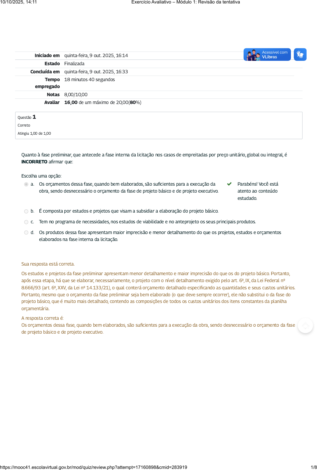 Iniciado em quinta-feira, 9 out. 2025, 16:14 Estado Finalizada Concluída em quinta-feira, 9 out. 2025, 16:33 Tempo empregado 18 minutos 40 segundos Notas 8,00/10,00 Avaliar 16,00 de um máximo de 20,00(80%) Questão 1 Correto Atingiu 1,00 de 1,00 Quanto à fase preliminar, que antecede a fase interna da licitação nos casos de empreitadas por preço unitário, global ou integral, é INCORRETO afirmar que: Escolha uma opção: a. Os orçamentos dessa fase, quando bem elaborados, são suficientes para a execução da obra, sendo desnecessário o orçamento da fase de projeto básico e de projeto executivo. Parabéns! Você está atento ao conteúdo estudado. b. É composta por estudos e projetos que visam a subsidiar a elaboração do projeto básico. c. Tem no programa de necessidades, nos estudos de viabilidade e no anteprojeto os seus principais produtos. d. Os produtos dessa fase apresentam maior imprecisão e menor detalhamento do que os projetos, estudos e orçamentos elaborados na fase interna da licitação. Sua resposta está correta. Os estudos e projetos da fase preliminar apresentam menor detalhamento e maior imprecisão do que os do projeto básico. Portanto, após essa etapa, há que se elaborar, necessariamente, o projeto com o nível detalhamento exigido pelo art. 6º, IX, da Lei Federal nº 8.666/93 (art. 6º, XXV, da Lei nº 14.133/21), o qual conterá orçamento detalhado especificando as quantidades e seus custos unitários. Portanto, mesmo que o orçamento da fase preliminar seja bem elaborado (o que deve sempre ocorrer), ele não substitui o da fase do projeto básico, que é muito mais detalhado, contendo as composições de todos os custos unitários dos itens constantes da planilha orçamentária. A resposta correta é: Os orçamentos dessa fase, quando bem elaborados, são suficientes para a execução da obra, sendo desnecessário o orçamento da fase de projeto básico e de projeto executivo. 10/10/2025, 14:11 Exercício Avaliativo – Módulo 1: Revisão da tentativa https://mooc41.escolavirtual.gov.br/mod/quiz/review.php?attempt=17160898&cmid=283919 1/8 Questão 2 Correto Atingiu 1,00 de 1,00 Sobre o programa de necessidades, pode-se afirmar que: Escolha uma opção: a. Documento em que se definem as características básicas do empreendimento bem como o seu padrão de acabamento, considerando-se a sua área de influência, a população atingida, a região beneficiada etc. Parabéns! Você está atento ao conteúdo estudado. b. Visa avaliar as alternativas possíveis para execução do empreendimento, definindo a melhor solução conceitual sob os aspectos legal, técnico, econômico e ambiental. c. Deve ser apresentado em desenhos, em números, e em escalas e detalhes suficientes para a compreensão da obra planejada, contemplando, em seu conteúdo, especificações técnicas, memorial descritivo e orçamento estimativo, sendo a última etapa antes da elaboração do projeto básico. d. Conjunto de elementos necessários e suficientes, com nível de precisão adequado, para caracterizar a obra ou serviço, ou complexo de obras ou serviços objeto da licitação, que assegurem a viabilidade técnica e o adequado tratamento do impacto ambiental do empreendimento, e que possibilite a avaliação do custo da obra e a definição dos métodos e do prazo de execução. Sua resposta está correta. O programa de necessidades é o documento em que se definem as características básicas do empreendimento bem como o seu padrão de acabamento, considerando-se a sua área de influência, a população atingida, a região beneficiada etc. A resposta correta é: Documento em que se definem as características básicas do empreendimento bem como o seu padrão de acabamento, considerando- se a sua área de influência, a população atingida, a região beneficiada etc. 10/10/2025, 14:11 Exercício Avaliativo – Módulo 1: Revisão da tentativa https://mooc41.escolavirtual.gov.br/mod/quiz/review.php?attempt=17160898&cmid=283919 2/8 Questão 3 Correto Atingiu 1,00 de 1,00 Sobre o anteprojeto, pode-se afirmar que: Escolha uma opção: a. Trata-se da representação técnica da opção aprovada nos estudos de viabilidade, tendo como objetivo subsidiar a elaboração do projeto básico. Parabéns! Você está atento ao conteúdo estudado. b. Para fins de cálculo do custo global da obra, deverá ser elaborado orçamento detalhado contendo a composição de todos os seus custos unitários. c. Apresenta orçamento com maior imprecisão em relação ao da etapa dos estudos de viabilidade. d. Nunca pode ser utilizado como base para o certame licitatório de uma obra pública, uma vez que o art. 7º, § 2º, da Lei Federal nº 8.666/93 assevera que as obras somente poderão ser licitadas quando houver projeto básico aprovado pela autoridade competente e disponível para exame dos interessados em participar do processo licitatório. Sua resposta está correta. Trata-se da representação técnica da opção aprovada nos estudos de viabilidade, tendo como objetivo subsidiar a elaboração do projeto básico; deve ser apresentado em desenhos, em números, e em escalas e detalhes suficientes para a compreensão da obra planejada, contemplando, em seu conteúdo, especificações técnicas, memorial descritivo e orçamento estimativo. Para fins de elaboração deste orçamento, o custo global da obra poderá ser aferido mediante orçamento sintético ou metodologia paramétrica. Orçamento na fase de anteprojeto apresenta maior precisão em relação ao elaborado no momento dos estudos de viabilidade, pois são levantadas as quantidades dos principais insumos e serviços com base nos desenhos e demais elementos do anteprojeto, e pesquisados os seus respectivos preços, preferencialmente, em sistemas de custos oficiais (orçamento sintético), sendo estimados por índices médios com base em obras similares somente os quantitativos ou custos para itens ou serviços que não estejam bem 
