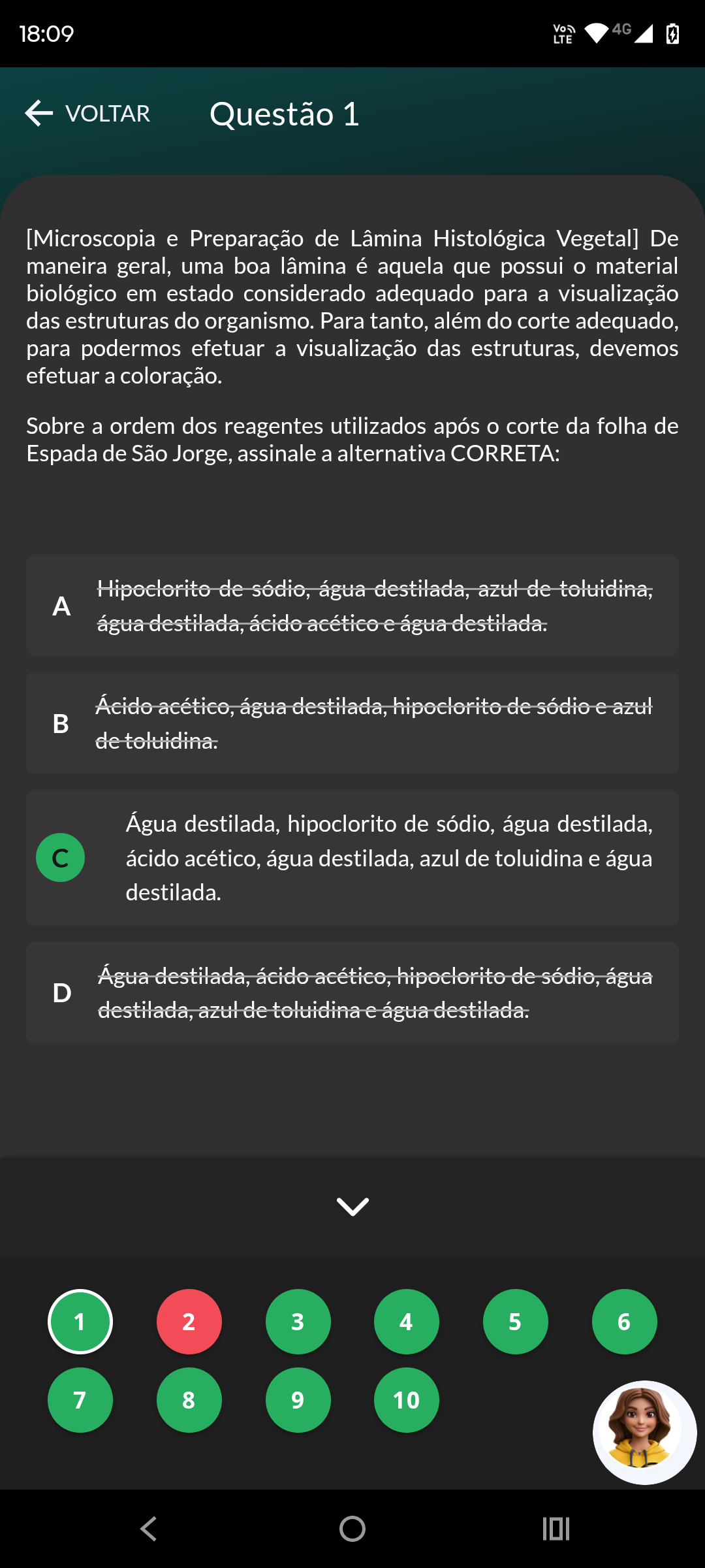 18:09 4G LTE VOLTAR Questão 1 [Microscopia e Preparação de Lâmina Histológica Vegetal] De maneira geral, uma boa lâmina é aquela que possui o material biológico em estado considerado adequado para a visualização das estruturas do organismo. Para tanto, além do corte adequado, para podermos efetuar a visualização das estruturas, devemos efetuar a coloração. Sobre a ordem dos reagentes utilizados após corte da folha de Espada de São Jorge, assinale a alternativa CORRETA: Hipoclorito de sódio, água destilada, azul de toluidina, água destilada, ácido acético e água destilada. Ácido acético, água destilada, hipoclorito de sódio e azul B de toluidina. Água destilada, hipoclorito de sódio, água destilada, ácido acético, água destilada, azul de toluidina e água destilada. Água destilada, ácido acético, hipoclorito de sódio, água D destilada, azul de toluidina e água destilada. 1 2 3 4 5 6 7 8 9 10
