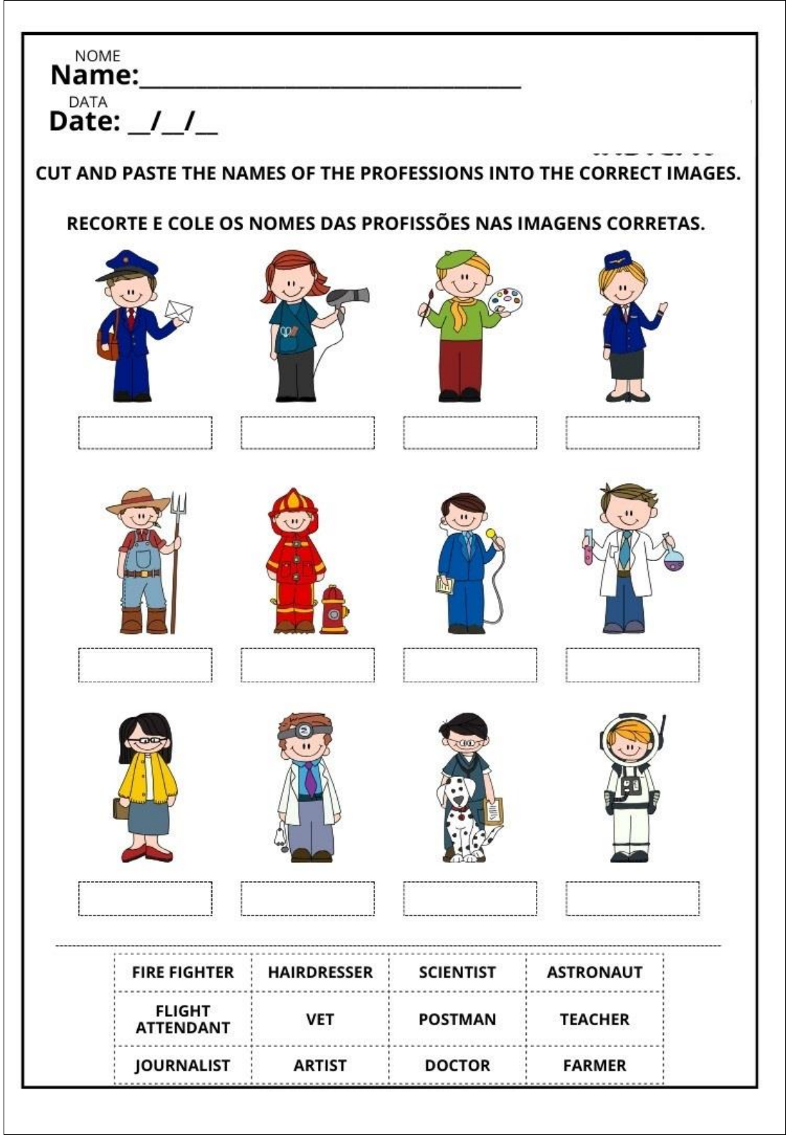 NOME Name: DATA Date: / / CUT AND PASTE THE NAMES OF THE PROFESSIONS INTO THE CORRECT IMAGES. RECORTE E COLE os NOMES DAS PROFISSÕES NAS IMAGENS CORRETAS. FIRE FIGHTER HAIRDRESSER SCIENTIST ASTRONAUT FLIGHT VET POSTMAN TEACHER ATTENDANT JOURNALIST ARTIST DOCTOR FARMER