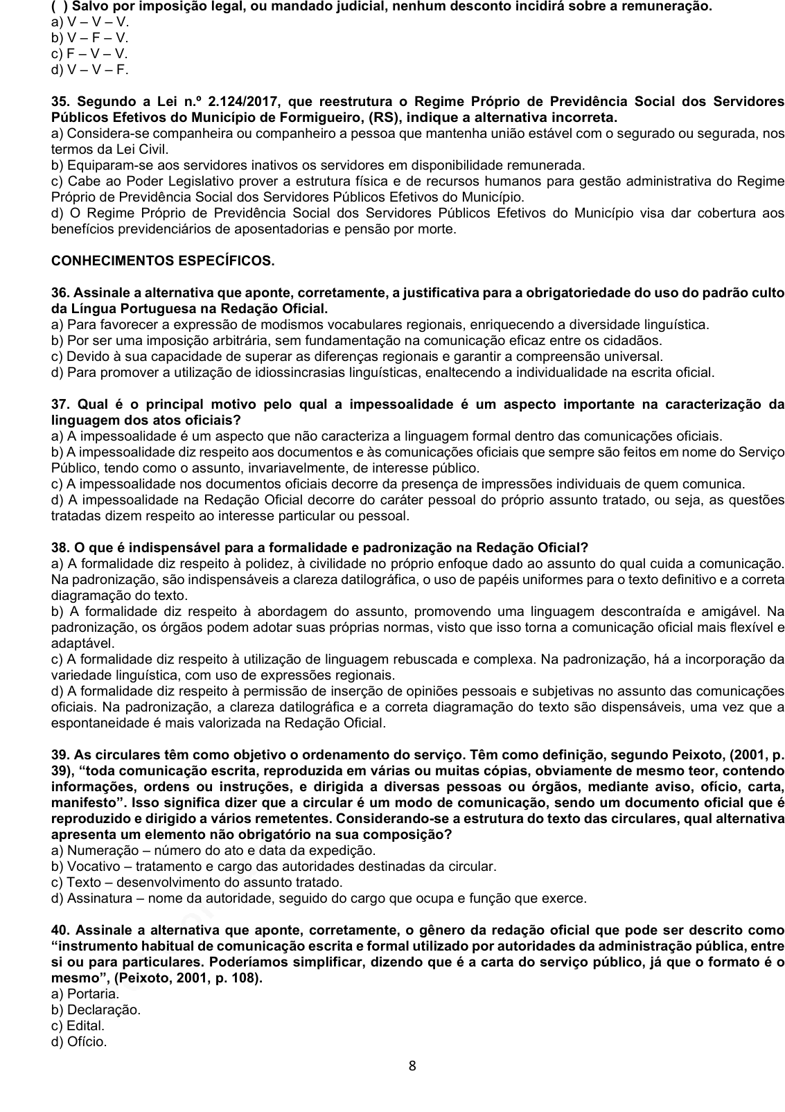 pcimarkpci MDAwMDowMDAwOjAwMDA6MDAwMDowMDAwOmZmZmY6YjFjODo3ZWI3:TW9uLCAxMyBPY3QgMjAyNSAxNjowMTo1MCAtMDMwMA== www.pciconcursos.com.br 8 ( ) Salvo por imposição legal, ou mandado judicial, nenhum desconto incidirá sobre a remuneração. a) V – V – V. b) V – F – V. c) F – V – V. d) V – V – F. 35. Segundo a Lei n.º 2.124/2017, que reestrutura o Regime Próprio de Previdência Social dos Servidores Públicos Efetivos do Município de Formigueiro, (RS), indique a alternativa incorreta. a) Considera-se companheira ou companheiro a pessoa que mantenha união estável com o segurado ou segurada, nos termos da Lei Civil. b) Equiparam-se aos servidores inativos os servidores em disponibilidade remunerada. c) Cabe ao Poder Legislativo prover a estrutura física e de recursos humanos para gestão administrativa do Regime Próprio de Previdência Social dos Servidores Públicos Efetivos do Município. d) O Regime Próprio de Previdência Social dos Servidores Públicos Efetivos do Município visa dar cobertura aos benefícios previdenciários de aposentadorias e pensão por morte. CONHECIMENTOS ESPECÍFICOS. 36. Assinale a alternativa que aponte, corretamente, a justificativa para a obrigatoriedade do uso do padrão culto da Língua Portuguesa na Redação Oficial. a) Para favorecer a expressão de modismos vocabulares regionais, enriquecendo a diversidade linguística. b) Por ser uma imposição arbitrária, sem fundamentação na comunicação eficaz entre os cidadãos. c) Devido à sua capacidade de superar as diferenças regionais e garantir a compreensão universal. d) Para promover a utilização de idiossincrasias linguísticas, enaltecendo a individualidade na escrita oficial. 37. Qual é o principal motivo pelo qual a impessoalidade é um aspecto importante na caracterização da linguagem dos atos oficiais? a) A impessoalidade é um aspecto que não caracteriza a linguagem formal dentro das comunicações oficiais. b) A impessoalidade diz respeito aos documentos e às comunicações oficiais que sempre são feitos em nome do Serviço Público, tendo como o assunto, invariavelmente, de interesse público. c) A impessoalidade nos documentos oficiais decorre da presença de impressões individuais de quem comunica. d) A impessoalidade na Redação Oficial decorre do caráter pessoal do próprio assunto tratado, ou seja, as questões tratadas dizem respeito ao interesse particular ou pessoal. 38. O que é indispensável para a formalidade e padronização na Redação Oficial? a) A formalidade diz respeito à polidez, à civilidade no próprio enfoque dado ao assunto do qual cuida a comunicação. Na padronização, são indispensáveis a clareza datilográfica, o uso de papéis uniformes para o texto definitivo e a correta diagramação do texto. b) A formalidade diz respeito à abordagem do assunto, promovendo uma linguagem descontraída e amigável. Na padronização, os órgãos podem adotar suas próprias normas, visto que isso torna a comunicação oficial mais flexível e adaptável. c) A formalidade diz respeito à utilização de linguagem rebuscada e complexa. Na padronização, há a incorporação da variedade linguística, com uso de expressões regionais. d) A formalidade diz respeito à permissão de inserção de opiniões pessoais e subjetivas no assunto das comunicações oficiais. Na padronização, a clareza datilográfica e a correta diagramação do texto são dispensáveis, uma vez que a espontaneidade é mais valorizada na Redação Oficial. 39. As circulares têm como objetivo o ordenamento do serviço. Têm como definição, segundo Peixoto, (2001, p. 39), “toda comunicação escrita, reproduzida em várias ou muitas cópias, obviamente de mesmo teor, contendo informações, ordens ou instruções, e dirigida a diversas pessoas ou órgãos, mediante aviso, ofício, carta, manifesto”. Isso significa dizer que a circular é um modo de comunicação, sendo um documento oficial que é reproduzido e dirigido a vários remetentes. Considerando-se a estrutura do texto das circulares, qual alternativa apresenta um elemento não obrigatório na sua composição? a) Numeração – número do ato e data da expedição. b) Vocativo – tratamento e cargo das autoridades destinadas da circular. c) Texto – desenvolvimento do assunto tratado. d) Assinatura – nome da autoridade, seguido do cargo que ocupa e função que exerce. 40. Assinale a alternativa que aponte, corretamente, o gênero da redação oficial que pode ser descrito como “instrumento habitual de comunicação escrita e formal utilizado por autoridades da administração pública, entre si ou para particulares. Poderíamos simplificar, dizendo que é a carta do serviço público, já que o formato é o mesmo”, (Peixoto, 2001, p. 108). a) Portaria. b) Declaração. c) Edital. d) Ofício. pcimarkpci MDAwMDowMDAwOjAwMDA6MDAwMDowMDAwOmZmZmY6YjFjODo3ZWI3:TW9uLCAxMyBPY3QgMjAyNSAxNjowMTo1MCAtMDMwMA== www.pciconcursos.com.br 9 41. Considerando-se as diretrizes para a redação de ata, qual é a orientação correta quanto à correção de erros ou omissões identificados quando o documento está sendo redigido? a) Emprega-se a palavra “digo” seguida da forma correta. b) Utiliza-se a expressão “em tempo” seguida da competente redação. c) Admite-se rasuras e emendas, desde que sejam justificadas por eventuais erros ou omissões na redação do documento. d) Abreviações podem ser utilizadas, mas apenas quando a redação da ata é feita via digitação. 42. Como pode ser definida a biblioteconomia? a) Pode ser definida como um ramo da literatura que se dedica ao estudo aprofundado de obras clássicas. b) Pode ser definida como uma disciplina, exclusivamente, voltada para a catalogação de livros em bibliotecas. c) Pode ser definida como um subconjunto da Ciência da Computação, focada na gestão de banco de dados bibliográficos. d) Pode ser definida como parte da bibliologia que tra