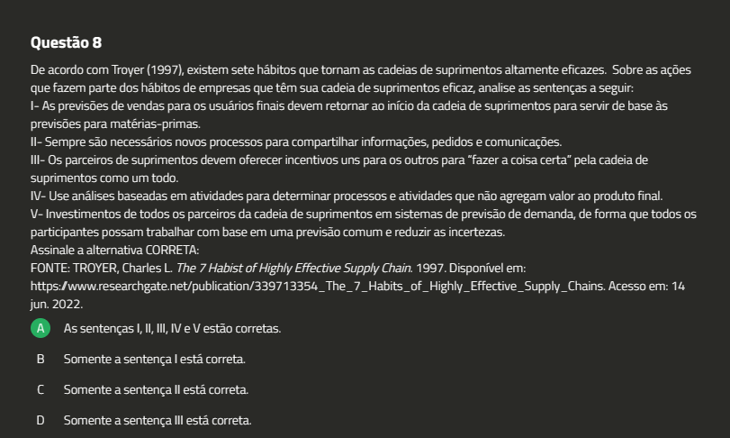 Questão 8 De acordo com Troyer (1997), existem sete hábitos que tornam as cadeias de suprimentos altamente eficazes. Sobre as ações que fazem parte dos hábitos de empresas que têm sua cadeia de suprimentos eficaz, analise as sentenças a seguir: I- As previsões de vendas para usuários finais devem retornar ao início da cadeia de suprimentos para servir de base às previsões para matérias-primas. II- Sempre são necessários novos processos para compartilhar informações, pedidos e comunicações. III- Os parceiros de suprimentos devem oferecer incentivos uns para outros para "fazer a coisa certa" pela cadeia de suprimentos como um todo. IV- Use análises baseadas em atividades para determinar processos e atividades que não agregam valor ao produto final. V- Investimentos de todos parceiros da cadeia de suprimentos em sistemas de previsão de demanda, de forma que todos participantes possam trabalhar com base em uma previsão comum e reduzir as incertezas. Assinale a alternativa CORRETA: FONTE: TROYER, Charles L. The 7 Habist of Highly Effective Supply Chain. 1997. Disponível em: 14 jun. 2022. A As sentenças I, II, III, IV e V estão corretas. B Somente a sentença I está correta. C Somente a sentença correta. D Somente a sentença III correta.