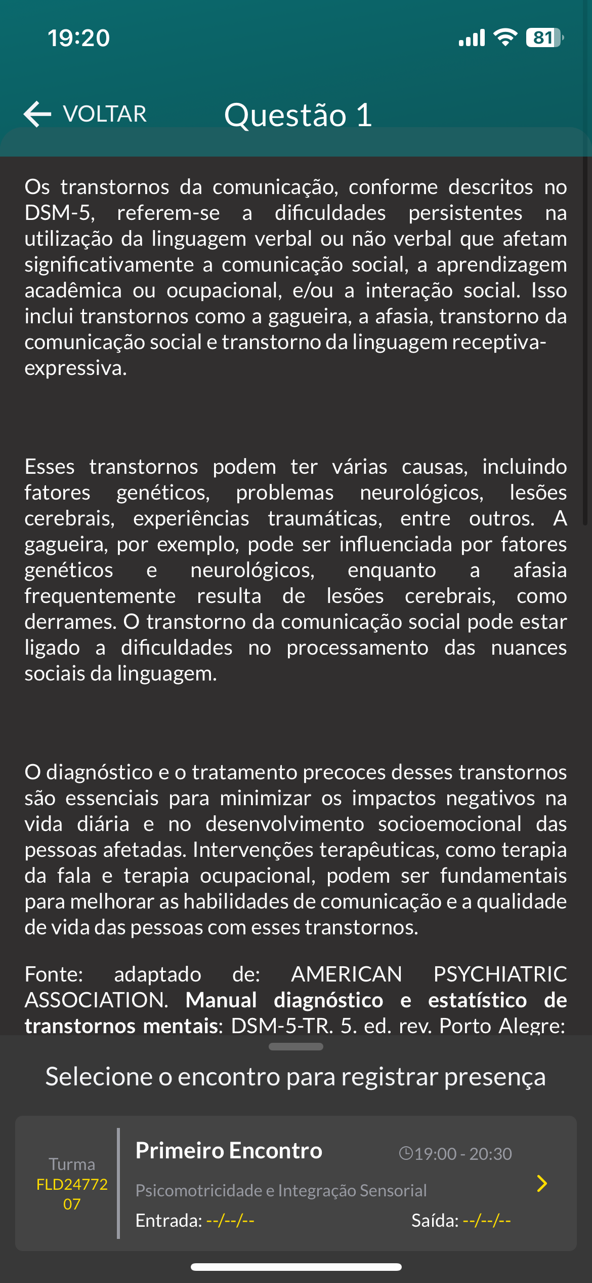 19:20 81 VOLTAR Questão 1 Os transtornos da comunicação, conforme descritos no DSM-5, referem-se a dificuldades persistentes na utilização da linguagem verbal ou não verbal que afetam significativamente a comunicação social, a aprendizagem acadêmica ou ocupacional, e/ou a interação social. Isso inclui transtornos como a gagueira, a afasia, transtorno da comunicação social e transtorno da linguagem receptiva- expressiva. Esses transtornos podem ter várias causas, incluindo fatores genéticos, problemas neurológicos, lesões cerebrais, experiências traumáticas, entre outros. A gagueira, por exemplo, pode ser influenciada por fatores genéticos e neurológicos, enquanto a afasia frequentemente resulta de lesões cerebrais, como derrames. transtorno da comunicação social pode estar ligado a dificuldades no processamento das nuances sociais da linguagem. diagnóstico e tratamento precoces desses transtornos são essenciais para minimizar os impactos negativos na vida diária e no desenvolvimento socioemocional das pessoas afetadas. Intervenções terapêuticas, como terapia da fala e terapia ocupacional, podem ser fundamentais para melhorar as habilidades de comunicação e a qualidade de vida das pessoas com esses transtornos. Fonte: adaptado de: AMERICAN PSYCHIATRIC ASSOCIATION. Manual diagnóstico e estatístico de transtornos mentais: DSM-5-TR. 5. ed. rev. Porto Alegre: Selecione encontro para registrar presença Primeiro Encontro 20:30 Turma FLD24772 Psicomotricidade e Integração Sensorial 07 Entrada: --/--/-- Saída: --/--/--