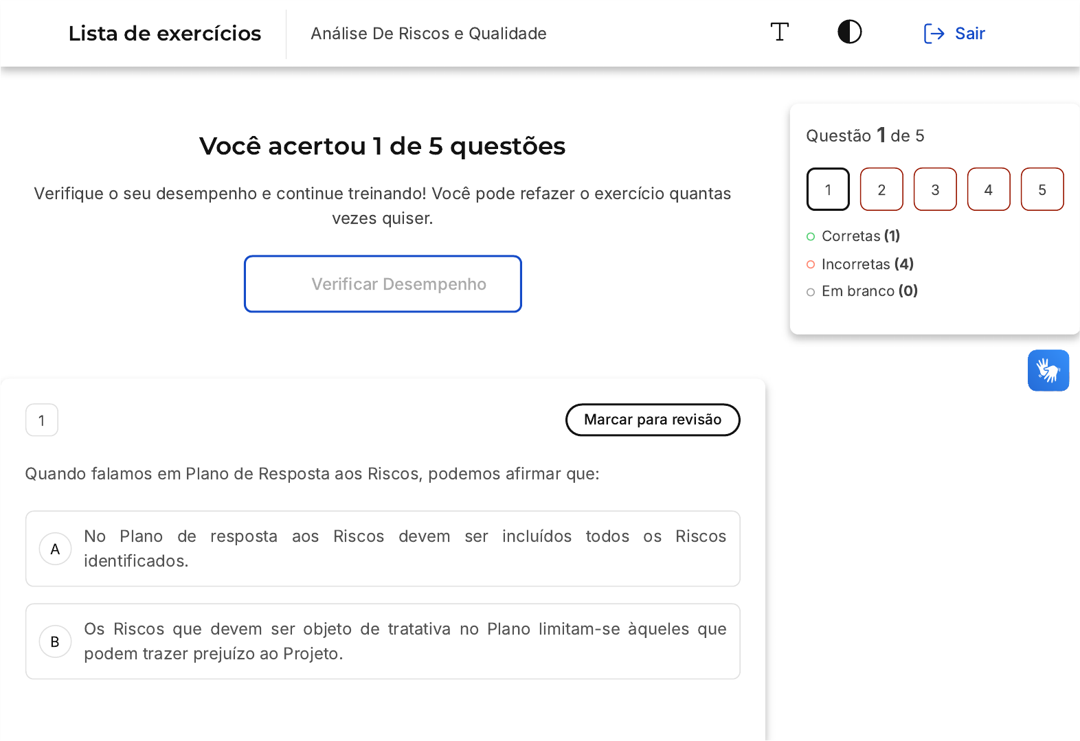 Você acertou 1 de 5 questões Verifique o seu desempenho e continue treinando! Você pode refazer o exercício quantas vezes quiser. Verificar Desempenho A B 1 Marcar para revisão Quando falamos em Plano de Resposta aos Riscos, podemos afirmar que: No Plano de resposta aos Riscos devem ser incluídos todos os Riscos identificados. Os Riscos que devem ser objeto de tratativa no Plano limitam-se àqueles que podem trazer prejuízo ao Projeto. Questão 1 de 5 Corretas (1) Incorretas (4) Em branco (0) 1 2 3 4 5 Lista de exercícios Análise De Riscos e Qualidade Sair C D E No que se refere às estratégias para lidar com o Risco, quando falamos em Prevenir estamos falando em diminuir a probabilidade de ocorrência. Compartilhar um Risco significa garantir a materialização de um risco positivo. Quando falamos em mitigar um Risco estamos falando de diminuir a probabilidade do Risco se materializar. Resposta correta Parabéns, você selecionou a alternativa correta. Confira o gabarito comentado! Gabarito Comentado A alternativa correta é a E, que afirma que quando falamos em mitigar um Risco, estamos nos referindo à diminuição da probabilidade do Risco se materializar. Mitigar um risco significa tomar medidas para reduzir a probabilidade de o risco ocorrer ou para reduzir o impacto caso o risco ocorra. Portanto, a afirmação está correta e é a melhor resposta para a pergunta. 2 Marcar para revisão A B C D E Sobre o processo de Monitoramento e Controle dos Riscos, podemos dizer que: uma vez os Riscos identificados, priorizados e incluídos no Plano de Respostas, podemos entender que o Processo está completo. os Riscos devem ser identificados o mais cedo possível no Ciclo do Projeto, pois uma vez identificados, estes Riscos não mudam durante a execução. cada Risco identificado, em algum momento, se transformará em uma Questão a ser resolvida, daí a importância do Monitoramento e Controle. é na fase de Proposta que todos os Riscos são efetivamente identificados, pois de outra forma não haveria como considerar no Orçamento. o Monitoramento e Controle dos Riscos deve ser contínuo, mesmo porque, por se tratar de um processo dinâmico, Riscos novos podem surgir. Resposta incorreta Opa! A alternativa correta é a letra E. Confira o gabarito comentado! Gabarito Comentado A alternativa correta que afirma que o Monitoramento e Controle dos Riscos deve ser contínuo. Isso ocorre porque o gerenciamento de riscos é um processo dinâmico e, portanto, novos riscos podem surgir a qualquer momento. Assim, é essencial que o A B C D E monitoramento e controle dos riscos seja um processo contínuo, para que possíveis novos riscos sejam identificados e gerenciados de maneira eficaz. 3 Marcar para revisão Quando falamos em Riscos e Questões, é certo dizer que: Riscos e Questões são palavras distintas para um mesmo conceito e tratam de ocorrências futuras que podem ou não ocorrer. um Risco sempre se tornará uma Questão a ser devidamente tratada. o grau de Severidade de uma Questão é obtido pelo produto da probabilidade pelo impacto. um Risco está sempre associado a uma probabilidade enquanto uma Questão trata de algo que já ocorreu. a priorização da Questão é obtida multiplicando a Probabilidade pelo Impacto. A B Resposta incorreta Opa! A alternativa correta é a letra D. Confira o gabarito comentado! Gabarito Comentado A alternativa correta que afirma que um Risco está sempre associado a uma probabilidade, enquanto uma Questão trata de algo que já ocorreu. Isso significa que um Risco é uma situação incerta que, se ocorrer, terá um efeito no objetivo do projeto. Por outro lado, uma Questão é um ponto ou matéria que é objeto de discussão, em particular um assunto ou problema a ser discutido ou resolvido, ou seja, algo que já ocorreu e precisa ser tratado. 4 Marcar para revisão Quando dizemos que Risco é uma condição incerta, significa que: o Risco pode ter um impacto negativo ou positivo no Projeto. o Risco é muito relativo e depende do tipo de Contrato feito entre as partes. C D E o Risco está sempre associado a uma Probabilidade. Assim, pode ou não se materializar. a incerteza quanto à ocorrência significa o desconhecimento quanto à gravidade do impacto. os Riscos, uma vez identificados com precisão, têm uma grande probabilidade de se materializar. Resposta incorreta Opa! A alternativa correta é a letra C. Confira o gabarito comentado! Gabarito Comentado Quando falamos que o risco é uma condição incerta, estamos nos referindo à sua natureza intrínseca de estar sempre associada a uma probabilidade. Isso significa que, apesar de identificado e analisado, o risco pode ou não se concretizar, dependendo de uma série de fatores. Portanto, a alternativa correta é: "O Risco está sempre associado a uma Probabilidade. Assim, pode ou não se materializar". 5 Marcar para revisão A B C D E Quando falamos em Análise Qualitativa e Matriz de Probabilidade e Impacto, podemos afirmar que: o resultado da análise qualitativa é a priorização dos Riscos. como resultado da análise qualitativa teremos os riscos devidamente quantificados com precisão. a priorização é feita com base no impacto que o Risco pode causar ao Projeto. os riscos identificados como sendo de maior impacto são automaticamente priorizados. se a probabilidade de ocorrência é alta, automaticamente este Risco deve ser priorizado. Resposta incorreta Opa! A alternativa correta é a letra A. Confira o gabarito comentado! Gabarito Comentado Na Análise Qualitativa, os riscos são avaliados e priorizados com base em sua probabilidade de ocorrência e impacto potencial no projeto. Portanto, o resultado dessa análise é a priorização dos riscos. As demais alternativas apresentam conceitos equivocados ou incompletos sobre a Análise Qualitativa e a Matriz de Probabilidade e Impacto.