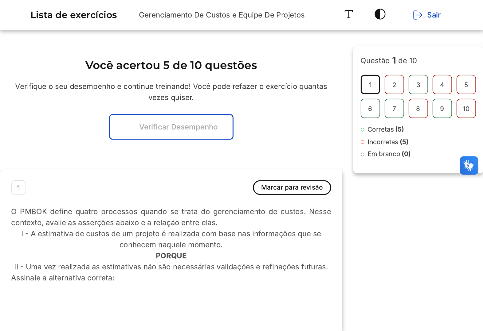 Você acertou 5 de 10 questões Verifique o seu desempenho e continue treinando! Você pode refazer o exercício quantas vezes quiser. Verificar Desempenho 1 Marcar para revisão O PMBOK define quatro processos quando se trata do gerenciamento de custos. Nesse contexto, avalie as asserções abaixo e a relação entre elas. I - A estimativa de custos de um projeto é realizada com base nas informações que se conhecem naquele momento. PORQUE II - Uma vez realizada as estimativas não são necessárias validações e refinações futuras. Assinale a alternativa correta: Questão 1 de 10 Corretas (5) Incorretas (5) Em branco (0) 1 2 3 4 5 6 7 8 9 10 Lista de exercícios Gerenciamento De Custos e Equipe De Projetos Sair A B C D E A asserção I é uma proposição falsa, e a II é uma proposição verdadeira. As asserções I e II são proposições verdadeiras, mas a II não é uma justificativa da I. As asserções I e II são proposições verdadeiras, e a II é uma justificativa da I. As asserções I e II são proposições falsas. A asserção I é uma proposição verdadeira, e a II é uma proposição falsa. Resposta correta Parabéns, você selecionou a alternativa correta. Confira o gabarito comentado! Gabarito Comentado Estimar custos é o processo de desenvolvimento de uma estimativa dos custos dos recursos que serão necessários para executar o projeto. A estimativa de custo é utilizada nas etapas iniciais do projeto, quando ainda não se tem ao certo todas as informações para que seja elaborado um orçamento completo. A estimativa de custo é um prognóstico baseado na informação conhecida no momento da sua elaboração. Ela vai sendo refinada ao longo do projeto, para refletir detalhes adicionais que vão A B C D E surgindo. São avaliações quantitativas dos prováveis custos necessários para executar o trabalho do projeto – podem ser apresentadas em formato resumido ou detalhado. 2 Marcar para revisão A realização de um projeto envolve várias partes interessadas, conhecidas como stakeholders, cada uma destas partes tem um papel importante para a realização do projeto e o seu sucesso. Nesta divisão de atividades e responsabilidades, quem está a cargo de realizar a aprovação formal do produto do projeto? Sponsor do Projeto Gerente do Projeto Gerente de Produto Equipe do Projeto Sponsor do Produto A B C Resposta incorreta Opa! A alternativa correta é a letra A. Confira o gabarito comentado! Gabarito Comentado Sponsor do projeto é o patrocinador financeiro do projeto que aprova formalmente o produto do projeto, seja nas etapas intermediárias, seja no encerramento do projeto e determina os riscos aceitáveis. 3 Marcar para revisão O que são "Informações Restritas"? São informações que somente podem ser acessadas dentro da organização. São informações acessadas apenas por alguns fornecedores da organização. São informações que não precisam ser protegidas. D E São informações que são destinadas a um grupo específico dentro da organização. São informações que são divulgadas nas mídias (TV e Internet). Resposta correta Parabéns, você selecionou a alternativa correta. Confira o gabarito comentado! Gabarito Comentado Informações restritas são aquelas que são destinadas a um grupo específico dentro da organização, e que não devem ser acessadas por pessoas que não fazem parte desse grupo. Isso porque essas informações podem conter dados confidenciais ou sensíveis, que podem ser usados para fins maliciosos se caírem em mãos erradas. 4 Marcar para revisão O PMBOK determina seis processos para o gerenciamento dos recursos. Qual desses processos é responsável pela elaboração da documentação de funções, responsabilidades e habilidades dos recursos? A B C D E Planejar o Gerenciamento dos Recursos Estimar os Recursos das Atividades Adquirir Recursos Desenvolver a Equipe Gerenciar a Equipe Resposta incorreta Opa! A alternativa correta é a letra A. Confira o gabarito comentado! Gabarito Comentado O processo de Planejar o Gerenciamento dos Recursos é responsável por definir as políticas, procedimentos e documentação para gerenciar os recursos de projeto. A documentação de funções, responsabilidades e habilidades dos recursos é parte do plano de gerenciamento de recursos. A B C D E 5 Marcar para revisão Em se tratando de conflitos em um projeto, qual a afirmativa abaixo está correta? Para solução de um conflito no projeto toda a equipe deve ser consultada. Conflitos em projetos devem ser ignorados, apenas o objetivo final do projeto deve ser considerado. O conflito pode ser benéfico ao projeto. Qualquer conflito na equipe do projeto deve ser solucionado pelo gerente de projetos. O conflito só acontece por incompetência do gerente de projetos. Resposta incorreta Opa! A alternativa correta é a letra C. Confira o gabarito comentado! Gabarito Comentado A B C O conflito pode ser benéfico ao projeto. Isso ocorre porque os conflitos podem levar a discussões produtivas, trazendo à tona diferentes perspectivas e ideias que podem melhorar o projeto. Além disso, a resolução de conflitos pode fortalecer a coesão da equipe, melhorando a comunicação e a colaboração entre os membros. Portanto, os conflitos não devem ser vistos apenas como algo negativo, mas também como uma oportunidade de crescimento e melhoria. 6 Marcar para revisão O gerente de projetos precisa ser um profissional multidisciplinar e completo porque ao mesmo tempo que precisa ter um bom nível de conhecimento técnico necessário para liderar as atividades do projeto, precisa também ter a capacidade de transmitir essas informações para todos os stakeholders (partes interessadas). Em qual atividade de gerenciamento de projeto é estimado que um gerente de projetos costuma dedicar cerca de 90% de todo o seu tempo e, por suas características, é chave para o sucesso do projeto? Gerenciamento das Comunicações Gerenciamento de Equipe