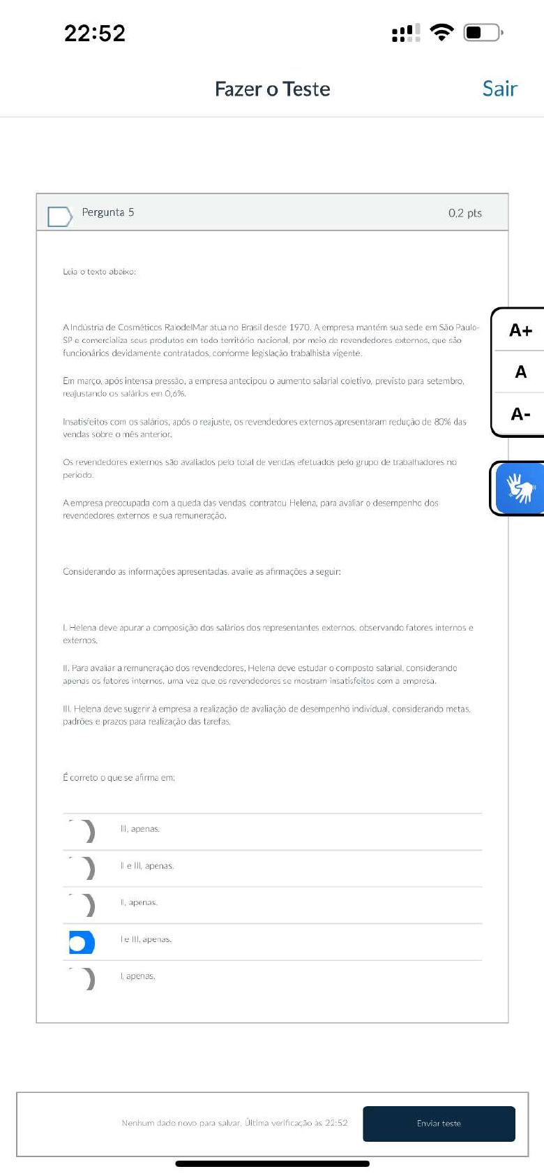 22:52 Fazer Teste Sair Pergunta 5 0,2 pts Leia texto abaixo: A Indústria de Cosméticos RaiodelMar atua no Brasil desde 1970. A empresa mantém sua sede em São Paulo- A+ SP e comercializa seus produtos em todo território nacional, por meio de revendedores externos, que são funcionários devidamente contratados, conforme legislação trabalhista vigente. A Em março, após intensa pressão, a empresa antecipou aumento salarial previsto para setembro, reajustando os salários em A- Insatisfeitos com salários, após reajuste, 05 revendedores externos apresentaram redução de 80% das vendas sobre mês anterior. Os revendedores externos são avaliados pelo total de vendas efetuados pelo grupo de trabalhadores no periodo. A empresa preocupada com a queda das vendas, contratou Helena, para avaliar desempenho dos revendedores externos e sua remuneração. Considerando as informações apresentadas, avalie as afirmações a seguir: Helena deve apurar a composição dos salários dos representantes externos, observando fatores internos e externos. II. Para avaliar a remuneração dos revendedores, Helena deve estudar composto considerando apenas fatores uma vez que revendedores se mostram insatisfeitos com a III. Helena deve sugerir à empresa a realização de avaliação de desempenho considerando metas. padrões e prazos para realização das tarefas. É correto que se afirma em: apenas. e le III. apenas. I, apenas. Nenhum dado novo para Última verificação às 22:52 Enviar teste22:52 Fazer Teste Sair A elevação dos salários e a transformação do setor de RH, em uma área estratégica para a organização, evidencia a importância das competências diferenciais para desempenho empresarial. Ao ser considerada uma área estratégica para a empresa, os profissionais de RH passam a exigir maior A expansão dos salários está diretamente associada à exigência da experiência na como forma de galgar postos mais elevados nas organizações e, consequentemente, melhores salários. A+ A A- Pergunta 4 0,2 pts Leia texto abaixo: José Castanha CEO da Indústria Moveleira Flor do Sul desde 2015. Preocupado com desempenho da empresa e satisfação dos funcionários, convidou Elizabete, gerente de Recursos Humanos da empresa, para uma reunião. Na reunião, José falou a Elizabete que acredita que a avaliação de desempenho é um fator importante para aprimorar conhecimentos e gerar melhores resultados para a empresa e, por este motivo, deseja que este tipo de processo seja implantado na empresa imediatamente. CEO revelou não dominar totalmente assunto desta forma, conta com os conhecimentos de Elizabete para encontrar a melhor metodologia a ser aplicada. deseja que modelo de avaliação de desempenho implantando na Moveleira propicie a avaliação dos funcionários por si mesmos e, também, por todas as pessoas com as quais interage em seu cotidiano no quer sejam seus pares, subordinados e superiores (se houver) e ainda por clientes. fornecedores e prestadores de serviços (quando for caso). Qual modelo de avaliação de desempenho que Elizabete deve implantar na empresa, atendendo à solicitação do CEO? Avaliação por competências. Avaliação 180 graus. Avaliação 360 Avaliação por Avaliação por grupos de relacionamentos. Pergunta 5 0,2 pts Leia texto abaixo:22:52 Fazer Teste Sair IVI IPCA acumulado (de maio de 2013 a abril de 2019) 41,01% Salário total (em reais) Salário-base (em reais) 3% 6% 17% 6% 6% 14% A+ ANALISTA 4562 4846 5168 A 32% -20% 43% 34% -16% 33% SUPERVISOR A- 12 109 9764 7944 5% -3% 19% 10% -6% 20% W GERENTE 19% -9% 16% 19% -0,33% 9% DIRETOR 2013 2015 2017 2019 2013 2015 2017 2019 A de investimentos áreas de recursos humanos não é resultado apenas da pequena melhora na economia mas de um movimento cada vez mais comum nas organizações: a transformação do RH em uma área estratégica. Para encarar que a posição mercado exige boa formação acadêmica por parte profissionais. Tanto que 81% das lideranças de RH pelo uma "Já se foi a tempo em que a função era de a estratégia pede formações complementares de alto nivel para que profissional tenha potencial de crescer dentro da diz Cristina diretora da consultoria Lee Hecht Harrison Mas não para conquistar diploma e parar de estudar aprendizado constante essencial para RH encarar as velozes mudanças no Além da educação formal a trajetória e a prática contam muitos "Para quem querendo se conectar com 0 mundo que vale é a Disponivel em:22:53 Fazer Teste Sair Pergunta 2 0,2 pts Leia texto abaixo: A Inteligência que antes parecia algo bem distante do cotidiano do trabalho e das tarefas mais corriqueiras, hoje é capaz de revolucionar ambiente corporativo em todas as suas áreas: do relacionamento interpessoal à prestação de serviços e oferecimento de produtos aos clientes. Para ajudar a promover essa transformação digital e humana, A+ empresas cada vez mais têm buscado ferramentas como um aplicativo que alia os conceitos da psicologia sistêmica organizacional à inovação tecnológica. [...] app permite que os próprios profissionais avaliem cotidianamente as contribuições de seus colegas A dentro de um leque de dimensões e fatores que buscam contribuir para resultados organizacionais. A plataforma digital ainda fornece dicas (feedforward) que direcionam a um processo de autodesenvolvimento mediante uso de Inteligência Artificial e A- algoritmos de People Analytics, a mais recente tendência em gestão de pessoas. "O aplicativo possibilita que eu enxergue, através dos olhos dos meus colegas, como eu tenho contribuído para a equipe e para a empresa, assim como as skills que eu posso aperfeiçoar. Disponível em: para-fortalecer-politicas-de-rh/ Acesso em: 29 fev. Considerando contexto apresentado, avalie as asserções abaixo e a relação proposta entre elas: 1.0 uso da Inteligência Artificial, incluindo a utilização de aplicativos, pode facilitar a realização da avaliação de 