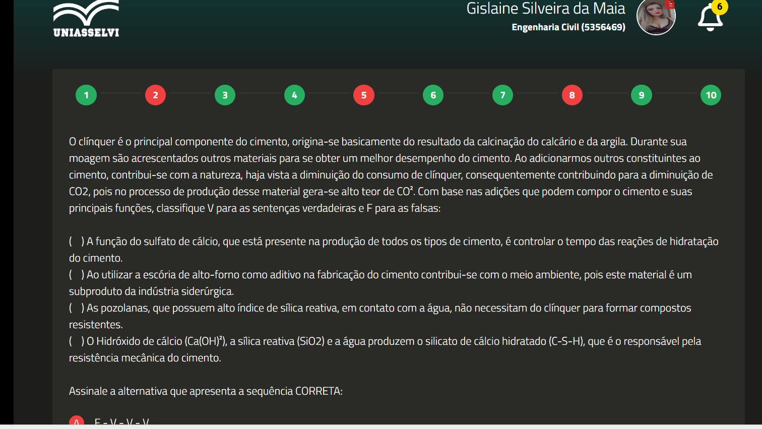 Gislaine Silveira da Maia 6 UNIASSELVI Engenharia Civil (5356469) 1 2 3 4 5 6 7 8 9 10 clínquer é 0 principal componente do cimento, origina-se basicamente do resultado da calcinação do calcário e da argila. Durante sua moagem são acrescentados outros materiais para se obter um melhor desempenho do cimento. Ao adicionarmos outros constituintes ao cimento, contribui-se com a natureza, haja vista a diminuição do consumo de clínquer, consequentemente contribuindo para a diminuição de pois no processo de produção desse material gera-se alto teor de Com base nas adições que podem compor 0 cimento e suas principais funções, classifique V para as sentenças verdadeiras e F para as falsas: ( ) A função do sulfato de cálcio, que está presente na produção de todos tipos de cimento, é controlar 0 tempo das reações de hidratação do cimento. Ao utilizar a escória de alto-forno como aditivo na fabricação do cimento contribui-se com 0 meio ambiente, pois este material é um subproduto da indústria siderúrgica. As pozolanas, que possuem alto índice de sílica reativa, em contato com a água, não necessitam do clínquer para formar compostos resistentes. ( ) 0 Hidróxido de cálcio a sílica reativa e a água produzem 0 silicato de cálcio hidratado (C-S-H), que é 0 responsável pela resistência mecânica do cimento. Assinale a alternativa que apresenta a sequência CORRETA: