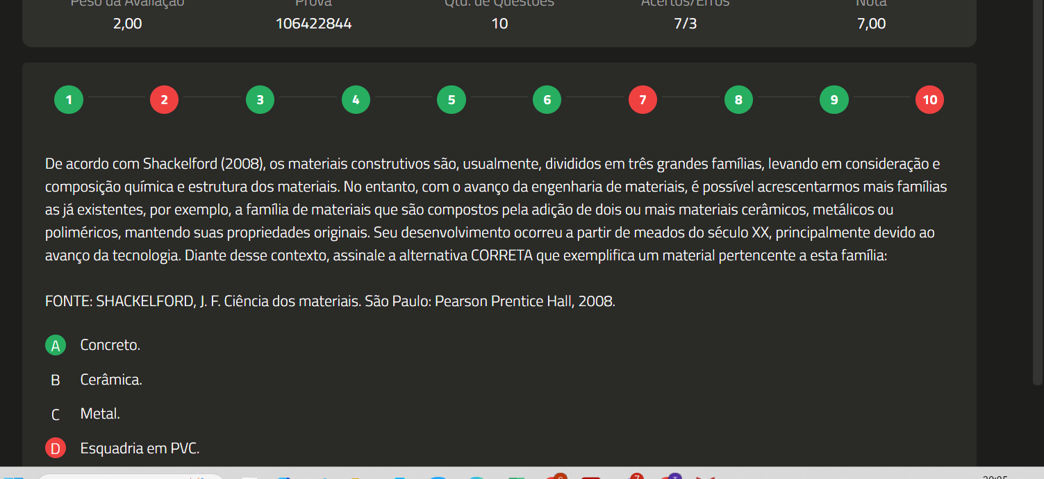 2,00 106422844 10 7/3 7,00 1 2 3 4 5 6 7 8 9 10 De acordo com Shackelford (2008), materiais construtivos são, usualmente, divididos em três grandes famílias, levando em consideração e composição química e estrutura dos materiais. No entanto, com 0 avanço da engenharia de materiais, é possível acrescentarmos mais famílias as já existentes, por exemplo, a família de materiais que são compostos pela adição de dois ou mais materiais cerâmicos, metálicos ou poliméricos, mantendo suas propriedades originais. Seu desenvolvimento ocorreu a partir de meados do século XX, principalmente devido ao avanço da tecnologia. Diante desse contexto, assinale a alternativa CORRETA que exemplifica um material pertencente a esta família: FONTE: SHACKELFORD, J.F. Ciência dos materiais. São Paulo: Pearson Prentice Hall, 2008. A Concreto. Cerâmica. Metal. D Esquadria em PVC.