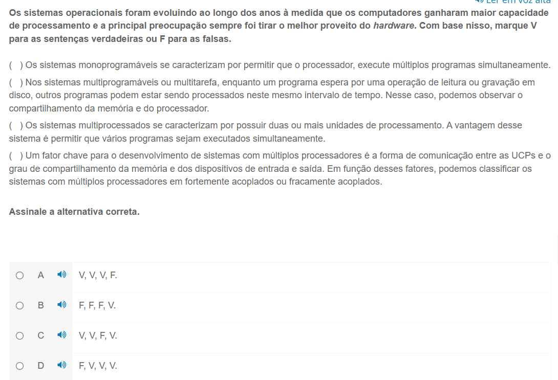 Os sistemas operacionais foram evoluindo ao longo dos anos à medida que computadores ganharam maior capacidade de processamento e a principal preocupação sempre foi tirar melhor proveito do hardware. Com base nisso, marque V para as sentenças verdadeiras ou F para as falsas. ( ) Os sistemas monoprogramáveis se caracterizam por permitir que processador, execute múltiplos programas simultaneamente. ( ) Nos sistemas multiprogramáveis ou multitarefa, enquanto um programa espera por uma operação de leitura ou gravação em disco, outros programas podem estar sendo processados neste mesmo intervalo de tempo. Nesse caso, podemos observar O compartilhamento da memória e do processador. Os sistemas multiprocessados se caracterizam por possuir duas ou mais unidades de processamento. A vantagem desse sistema é permitir que vários programas sejam executados simultaneamente. ( ) Um fator chave para desenvolvimento de sistemas com múltiplos processadores é a forma de comunicação entre as UCPs e grau de compartilhamento da memória e dos dispositivos de entrada e saída. Em função desses fatores, podemos classificar OS sistemas com múltiplos processadores em fortemente acoplados ou fracamente acoplados. Assinale a alternativa correta. A V,V,V,F. B F,F,F,V. C V,V,F,V. D F,V,V,V.