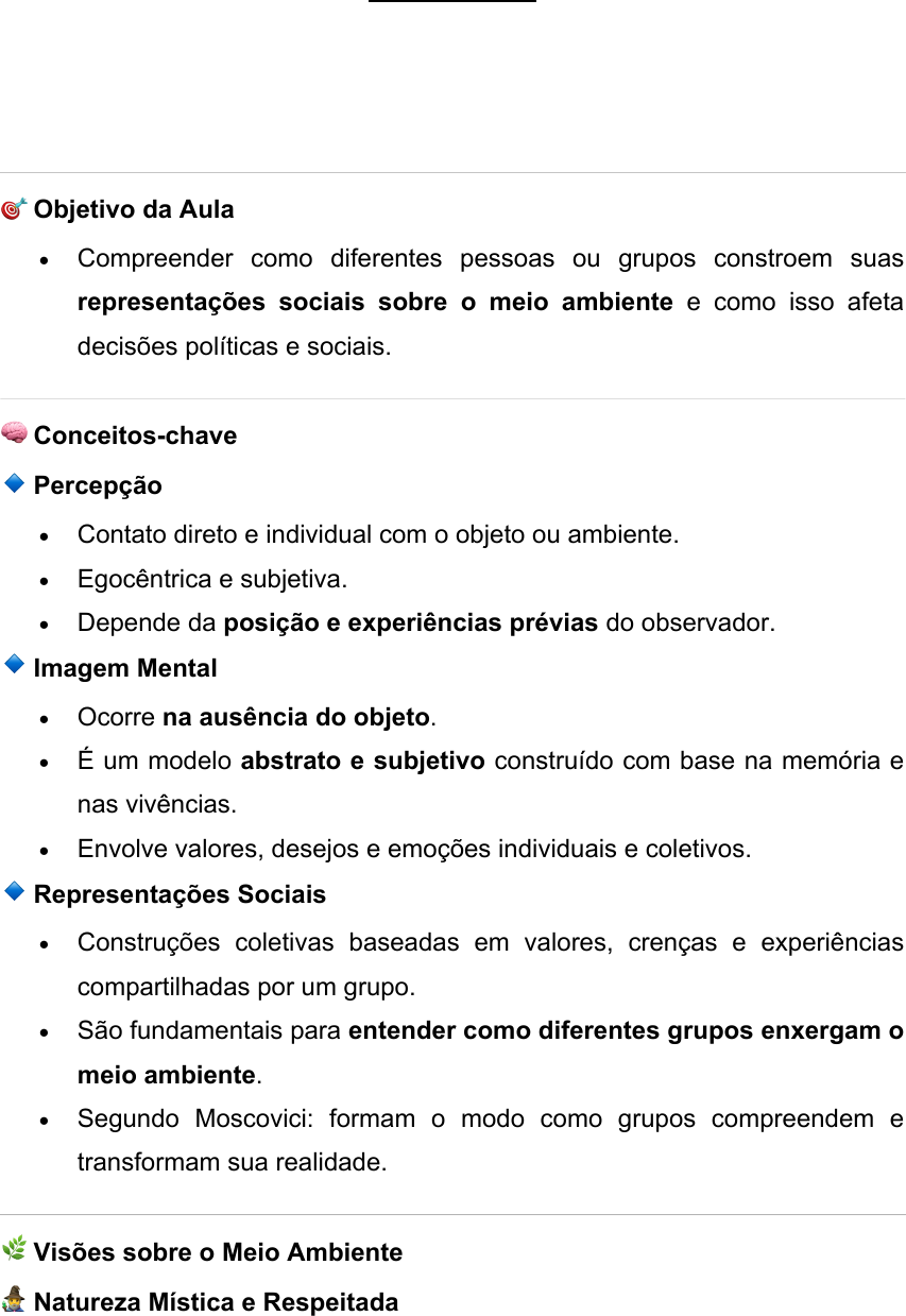 EDUAÇÃO AMBIENTAL RESUMO AP3 Aula 1 - Diferentes visões sobre meio ambiente: atividade de representação social 🎯 Objetivo da Aula • Compreender como diferentes pessoas ou grupos constroem suas representações sociais sobre o meio ambiente e como isso afeta decisões políticas e sociais. 🧠 Conceitos-chave 🔹 Percepção • Contato direto e individual com o objeto ou ambiente. • Egocêntrica e subjetiva. • Depende da posição e experiências prévias do observador. 🔹 Imagem Mental • Ocorre na ausência do objeto. • É um modelo abstrato e subjetivo construído com base na memória e nas vivências. • Envolve valores, desejos e emoções individuais e coletivos. 🔹 Representações Sociais • Construções coletivas baseadas em valores, crenças e experiências compartilhadas por um grupo. • São fundamentais para entender como diferentes grupos enxergam o meio ambiente. • Segundo Moscovici: formam o modo como grupos compreendem e transformam sua realidade. 🌿 Visões sobre o Meio Ambiente 🧙 Natureza Mística e Respeitada • Baseada em crenças populares e espiritualidade (exemplo: Mãe do Mato, Curupira). • Representa a natureza como sagrada, exigindo respeito e cuidado. 💼 Natureza como Recurso (Visão Utilitarista) • Visão antropocêntrica: natureza serve ao ser humano. • Base para o desenvolvimento econômico e exploração de recursos. • Frequentemente usada para justificar políticas de conservação com fins recreativos ou econômicos. 🙈 Visão de Exclusão • As pessoas não se sentem responsáveis pelos problemas ambientais. • Tendência a culpar o “outro” ou o governo, excluindo-se do processo. 📚 Educação Ambiental e Representações • Projetos de Educação Ambiental devem considerar as representações sociais locais. • Ignorar essas representações pode comprometer o sucesso das ações. • A participação da comunidade é essencial para criar um projeto compartilhado e eficaz. ✅ Conclusão • Percepção, imagem mental e representações sociais são formas de interação entre o ser humano e o ambiente. • Há múltiplas visões sobre meio ambiente, influenciadas por fatores culturais, históricos e sociais. • Conhecer essas visões é fundamental para promover uma educação ambiental democrática e efetiva. Aula 2 - Breve história das mudanças no ambiente 🎯 Objetivos da Aula • Compreender como o ser humano alterou o meio ambiente ao longo da história. • Relacionar essas mudanças às formas de organização social e econômica de cada época. 🕰 1. Sociedade Pré-histórica • Viviam da caça, pesca e coleta. • Baixo impacto ambiental, devido à: o População pequena. o Uso limitado de recursos. • Relação com a natureza era de dependência direta. 🌾 2. Revolução Agrícola (Neolítico) • Domínio da agricultura e domesticação de animais. • Formação dos primeiros povoados fixos. • Início do uso intensivo da terra. • Impacto ambiental começa a crescer: desmatamento, uso do solo, irrigação. 🏛 3. Antiguidade • Civilizações como Egito, Grécia e Roma criaram sistemas de: o Irrigação, o Agricultura intensiva, o Expansão urbana. • A natureza começa a ser vista como recurso a ser dominado. ⚒ 4. Idade Média • Retração urbana após a queda do Império Romano. • Agricultura de subsistência e economia rural predominam. • O impacto ambiental diminui em relação à Antiguidade. • Influência religiosa fortalece a visão da natureza como criação divina. 🌍 5. Idade Moderna • Expansão marítima europeia, colonização e início do capitalismo comercial. • Exploração intensa dos recursos naturais nas colônias. • Surgem os primeiros grandes impactos ambientais globais: desmatamentos, monoculturas, mineração. 🏭 6. Revolução Industrial (século XVIII e XIX) • Marco da transformação acelerada da relação entre sociedade e natureza. • Características: o Uso intensivo de carvão e petróleo. o Poluição do ar e da água. o Crescimento desordenado das cidades. • Início da degradação ambiental em larga escala. 💡 7. Era Contemporânea • A partir do século XX, os impactos se tornam visíveis e preocupantes: o Esgotamento de recursos. o Aquecimento global. o Perda da biodiversidade. • Surgem movimentos de preservação e educação ambiental (anos 60 em diante). ✅ Conclusão • A relação entre sociedade e natureza mudou profundamente ao longo do tempo. • O impacto ambiental cresce conforme os modos de produção e consumo se tornam mais intensos. • A compreensão dessa trajetória é essencial para pensar alternativas sustentáveis no presente. Aula 3 – Acidentes Ambientais 🎯 Objetivo da Aula • Apresentar acidentes ambientais causados por ações humanas na segunda metade do século XX. • Discutir suas causas, consequências e possibilidades de prevenção, com base no princípio da precaução. ⚠ Acidente ambiental: é mesmo acidente? • Embora o termo “acidente” sugira imprevisibilidade, grande parte dos desastres ambientais é previsível e poderia ser evitada. • Falhas humanas, falta de planejamento e negligência estão entre as causas mais comuns. 🧪 Tipos de Acidentes Ambientais 1. Desastres Naturais o Causados por fenômenos naturais (terremotos, furacões, etc.). o Difíceis de prevenir, mas possíveis de mitigar com planejamento. 2. Desastres Tecnológicos o Causados por atividades humanas (indústria, transporte, energia). o São geralmente previsíveis e evitáveis. 🛠 Gestão dos Acidentes Ambientais Duas fases principais: Prevenção Intervenção Identificar perigos Avaliar o acidente Avaliar riscos e consequências Acionar e mobilizar equipes Reduzir riscos Prestar assistência emergencial Planejar emergência Realizar a recuperação ambiental Treinar e capacitar 🌍 Principais Acidentes Tecnológicos do Século XX Data Local Evento 1956 Minamata (Japão) Contam