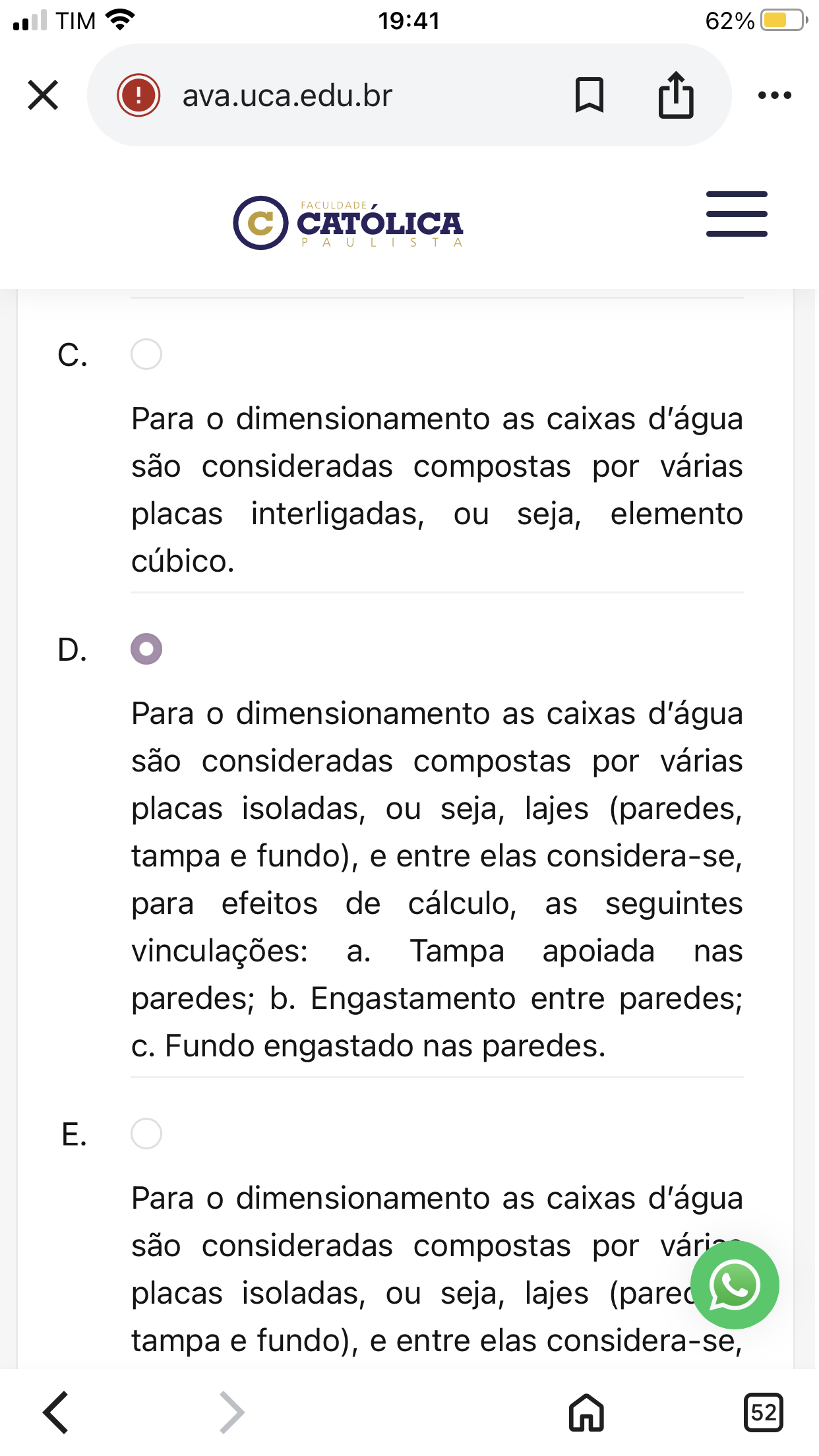 TIM 19:41 62% X ! ava.uca.edu.br FACULDADE CATOLICA PAULISTA C. Para dimensionamento as caixas d'água são consideradas compostas por várias placas interligadas, ou seja, elemento cúbico. D. Para dimensionamento as caixas d'água são consideradas compostas por várias placas isoladas, ou seja, lajes (paredes, tampa e fundo), e entre elas considera-se, para efeitos de cálculo, as seguintes vinculações: a. Tampa apoiada nas paredes; b. Engastamento entre paredes; Fundo engastado nas paredes. Para dimensionamento as caixas d'água são consideradas compostas por vária placas isoladas, ou seja, lajes tampa e fundo), e entre elas considera-se, 52