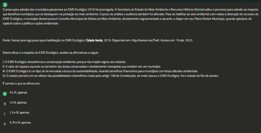 2 0 prazo para adesão dos municípios piauienses ao ICMS Ecológico 2019 foi prorrogada. A Secretaria de Estado do Meio Ambiente e Recursos Hídricos (Semar) adiou 0 processo para adesão ao imposto que beneficia municípios que se destaquem na proteção ao meio ambiente. 0 prazo de e auditoria também foi alterado. Para se habilitar ao selo ambiental com vistas à obtenção de recursos do ICMS Ecológico, 0 município possuir Conselho Municipal de Defesa do Meio Ambiente, devidamente regulamentado e atuante, e dispor em seu Plano Diretor Municipal, quando aplicável, de capitulo sobre a e ações ambientais. Fonte: Semar prorroga prazo para habilitação no ICMS Ecológico. Cidade Verde, 2019. Disponível em: Acesso em: 19 abr. 2023. Diante disso e a respeito do ICMS Ecológico, analise as afirmativas a seguir: ICMS Ecológico desestimula a conservação ambiental, porque não impõe regras aos estados. II. valor do repasse equivale ao tamanho das áreas conservadas e devidamente manejadas que existam em um município. III. 0 ICMS Ecológico é um tipo de lei vinculada a busca da sustentabilidade, levando benefícios financeiros para municípios com boas atitudes ambientais. IV. estado pioneiro em se utilizar das possibilidades e benefícios criada pelo artigo 158 da Constituição, de onde nasceu ICMS Ecológico, foi estado do Rio de Janeiro. E correto que se afirma em: II e III, apenas. B IV, apenas. C I, II e III, apenas. D II, III e IV, apenas.