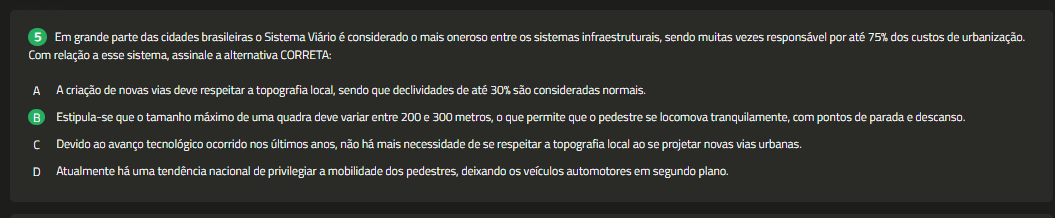 5 Em grande parte das cidades brasileiras Sistema Viário é considerado 0 mais oneroso entre sistemas infraestruturais, sendo muitas vezes responsável por até 75% dos custos de urbanização. Com relação a esse sistema, assinale a alternativa CORRETA: A A criação de novas vias deve respeitar a topografia local, sendo que declividades de até 30% são consideradas normais. Estipula-se que tamanho de uma quadra deve variar entre 200 e 300 metros, 0 que permite que pedestre se locomova tranquilamente, com pontos de parada e descanso. C Devido ao avanço tecnológico ocorrido nos últimos anos, não mais necessidade de se respeitar a topografia local ao se projetar novas vias urbanas. D Atualmente ha uma tendência nacional de privilegiar a mobilidade dos pedestres, deixando veículos automotores em segundo plano.