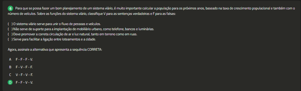 6 Para que se possa fazer um bom planejamento de um sistema viário, é muito importante calcular a população para próximos anos, baseado na taxa de crescimento populacional e também com 0 número de veículos. Sobre as funções do sistema viário, classifique V para as sentenças verdadeiras eF para as falsas: ( 10 sistema viário serve para unir fluxo de pessoas e veículos. ( ) Não serve de suporte para a implantação de mobiliário urbano, como telefone, bancos e luminárias. Deve promover a correta circulação de ar e luz natural, tanto em terreno como em ruas. Serve para facilitar a ligação entre loteamentos e a cidade. Agora, assinale a alternativa que apresenta a sequência CORRETA: A F-F-F-V. B C V-F-V-F. D F-F-V-V.