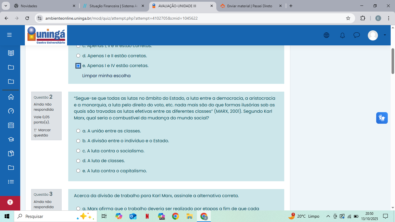Novidades X Situação Financeira Sistema A AVALIAÇÃO-UNIDADE Enviar material Passei Direto X + X ambienteonline.uninga.br/mod/quiz/attempt.php?attempt=41027058cmid=104562 E uningá Centro Universitário d. Apenas I e II estão corretas. e. Apenas I e IV estão corretas. Limpar minha escolha Questão 2 "Segue-se que todas as lutas no âmbito do Estado, a luta entre a democracia, a aristocracia Ainda não e a monarquia, a luta pelo direito do voto, etc. nada mais são do que formas ilusórias sob as respondida quais são travadas as lutas efetivas entre as diferentes classes" (MARX, 2001). Segundo Karl Vale 0,05 Marx, qual seria O combustível da mudança do mundo social? ponto(s). Marcar a. A união entre as classes. questão b. A divisão entre O indivíduo e O Estado. C. A luta contra O socialismo. d. A luta de classes. e. A luta contra capitalismo. Questão 3 Acerca da divisão de trabalho para Karl Marx, assinale a alternativa correta. Ainda não respondida a. Marx afirma que trabalho deveria ser realizado por etapas a fim de que cada N 1 20:50 Pesquisar E 20°C Limpo 13/10/2025