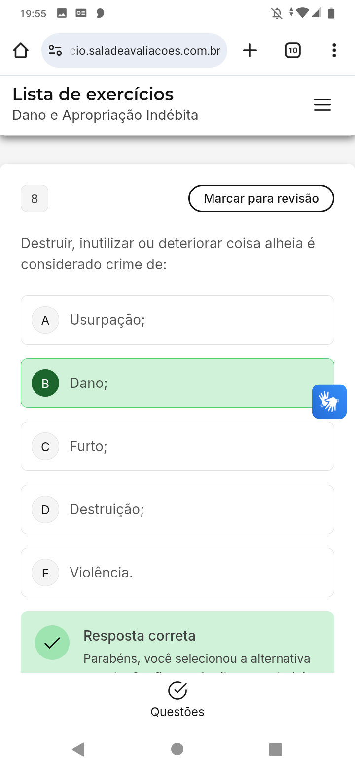 19:55 cio.saladeavaliacoes.com.br + 10 Lista de exercícios Dano e Apropriação Indébita 8 Marcar para revisão Destruir, inutilizar ou deteriorar coisa alheia é considerado crime de: A Usurpação; Dano; C Furto; D Destruição; Violência. Resposta correta Parabéns, você selecionou a alternativa Questões