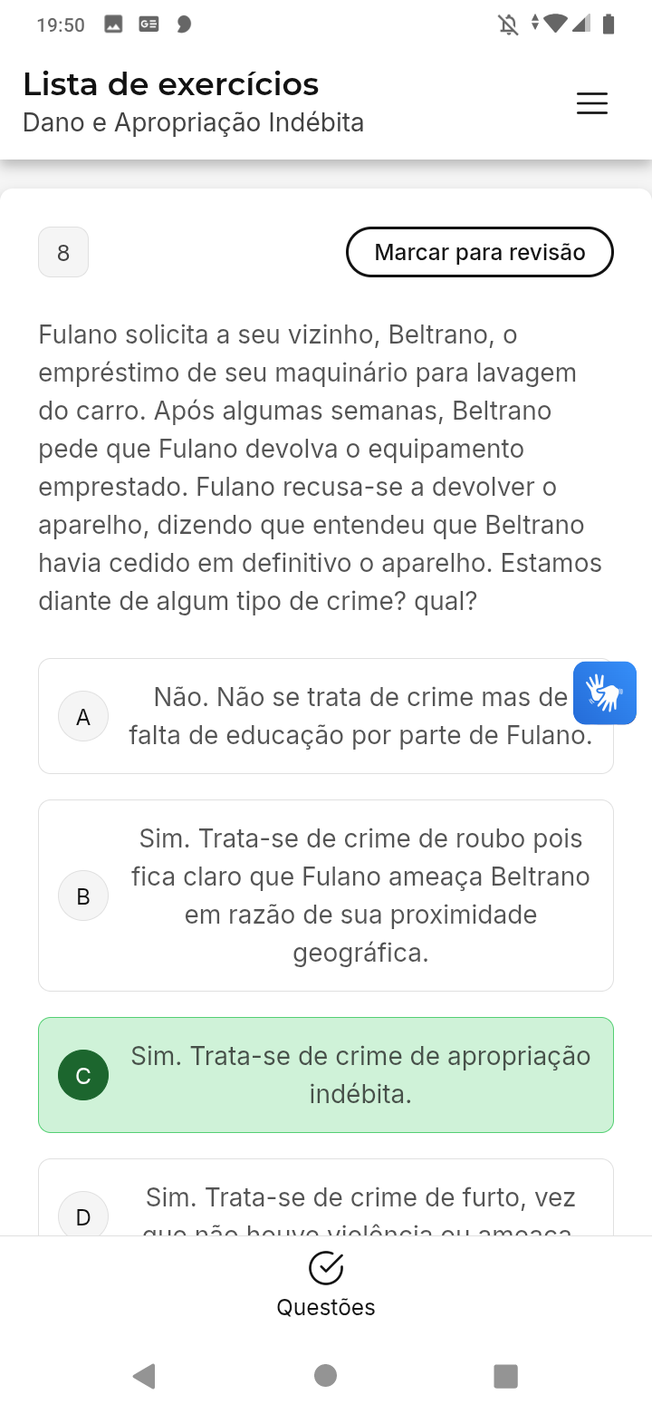 19:50 Lista de exercícios Dano e Apropriação Indébita 8 Marcar para revisão Fulano solicita a seu vizinho, Beltrano, o empréstimo de seu maquinário para lavagem do carro. Após algumas semanas, Beltrano pede que Fulano devolva o equipamento emprestado. Fulano recusa-se a devolver o aparelho, dizendo que entendeu que Beltrano havia cedido em definitivo o aparelho. Estamos diante de algum tipo de crime? qual? Não. Não se trata de crime mas de A falta de educação por parte de Fulano. Sim. Trata-se de crime de roubo pois fica claro que Fulano ameaça Beltrano em razão de sua proximidade geográfica. Sim. Trata-se de crime de apropriação indébita. Sim. Trata-se de crime de furto, vez D não Questões