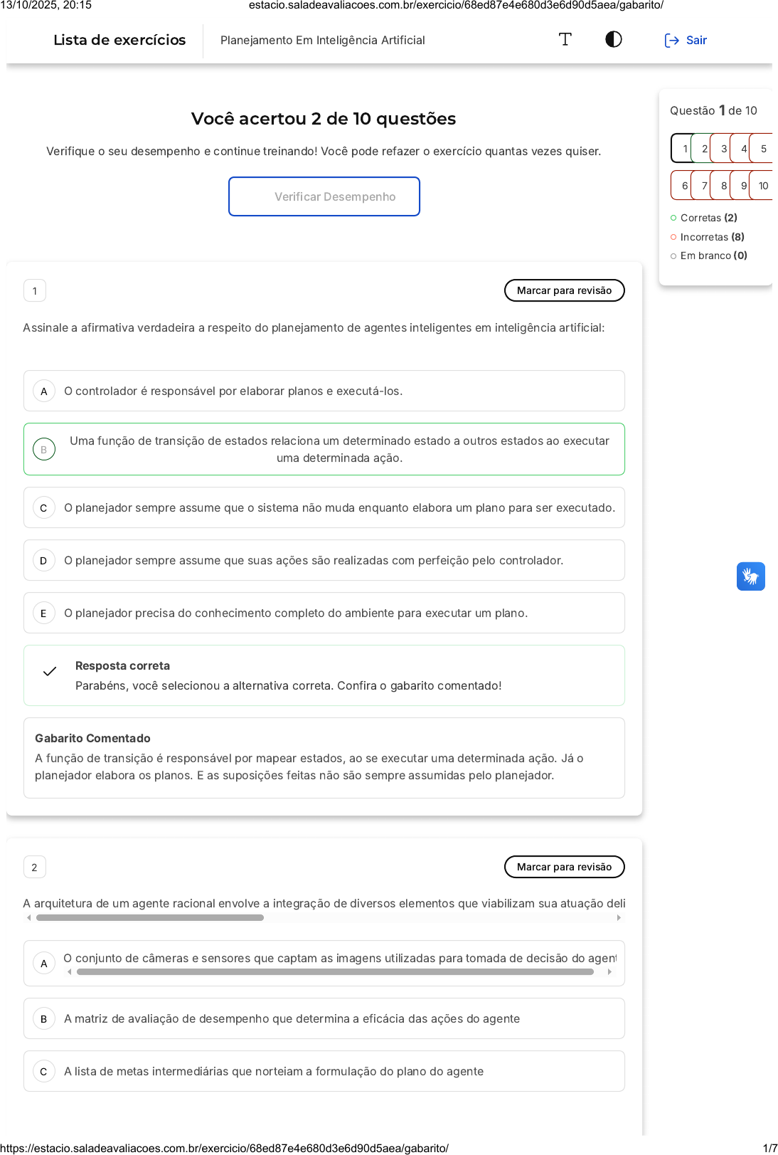 Você acertou 2 de 10 questões Verifique o seu desempenho e continue treinando! Você pode refazer o exercício quantas vezes quiser. Verificar Desempenho A B C D E A B C 1 Marcar para revisão Assinale a afirmativa verdadeira a respeito do planejamento de agentes inteligentes em inteligência artificial: O controlador é responsável por elaborar planos e executá-los. Uma função de transição de estados relaciona um determinado estado a outros estados ao executar uma determinada ação. O planejador sempre assume que o sistema não muda enquanto elabora um plano para ser executado. O planejador sempre assume que suas ações são realizadas com perfeição pelo controlador. O planejador precisa do conhecimento completo do ambiente para executar um plano. Resposta correta Parabéns, você selecionou a alternativa correta. Confira o gabarito comentado! Gabarito Comentado A função de transição é responsável por mapear estados, ao se executar uma determinada ação. Já o planejador elabora os planos. E as suposições feitas não são sempre assumidas pelo planejador. 2 Marcar para revisão A arquitetura de um agente racional envolve a integração de diversos elementos que viabilizam sua atuação deli O conjunto de câmeras e sensores que captam as imagens utilizadas para tomada de decisão do agent A matriz de avaliação de desempenho que determina a eficácia das ações do agente A lista de metas intermediárias que norteiam a formulação do plano do agente Questão 1 de 10 Corretas (2) Incorretas (8) Em branco (0) 1 2 3 4 5 6 7 8 9 10 Lista de exercícios Planejamento Em Inteligência Artificial Sair 13/10/2025, 20:15 estacio.saladeavaliacoes.com.br/exercicio/68ed87e4e680d3e6d90d5aea/gabarito/ https://estacio.saladeavaliacoes.com.br/exercicio/68ed87e4e680d3e6d90d5aea/gabarito/ 1/7 D E A B C D E O sistema de exibição de comandos que permite ao agente interagir fisicamente com o ambiente O conjunto de restrições ambientais que definem o comportamento permitido no ambiente Resposta correta Parabéns, você selecionou a alternativa correta. Confira o gabarito comentado! Gabarito Comentado Atuadores são os componentes responsáveis por permitir que o agente execute ações no ambiente. Eles estão diretamente associados à 3 Marcar para revisão Considere o problema dos robôs autônomos do porto. Considere um dos estados do problema definido na figura a seguir: state = {attached(p1,loc1), attached(p2,loc1), in(c1,p1), in(c3,p1), top(c3,p1), on(c3,c1), on(c1,pallet), in(c2,p2), top(c2,p2), on(c2,pallet), belong(crane1,loc1), empty(crane1), adjacent(loc1,loc2), adjacent(loc2, loc1), at(r1,loc2), occupied(loc2), unloaded(r1)} Após o robô entrar na plataforma loc1. Considere a ação a = load(crane1,loc1,c3,r1). Assinale a afirmativa verdadeira: Ação é aplicável no estado da figura. Ação não é aplicável e somente o átomo holding(k,c) da pré-condição não é verdadeiro. Ação não é aplicável e os átomos holding(k,c) e at(r,l) da pré-condição não são verdadeiro. Ação não é aplicável e somente o átomo belong(k,c) da pré-condição não é verdadeiro. Ação não é aplicável e somente o átomo unload(r) da pré-condição não é verdadeiro. Resposta incorreta Opa! A alternativa correta é a letra B. Confira o gabarito comentado! Gabarito Comentado Com o robô entrando na plataforma loc1, o guindaste ainda não está segurando o container, por isso ação não é aplicável. Assim: Ação não é aplicável e somente o átomo holding(k,c) da pré-condição não é verdadeiro. 13/10/2025, 20:15 estacio.saladeavaliacoes.com.br/exercicio/68ed87e4e680d3e6d90d5aea/gabarito/ https://estacio.saladeavaliacoes.com.br/exercicio/68ed87e4e680d3e6d90d5aea/gabarito/ 2/7 A B C D E 4 Marcar para revisão Considere um robô inteligente desenvolvido para jogar futebol. Em relação a classificação do ambiente, marque a alternativa verdadeira: Os jogadores não fazem parte do ambiente do agente. O ambiente é multiagente. O ambiente é discreto. O ambiente é estático. Não há necessidade de uma medida de performance do agente. Resposta incorreta Opa! A alternativa correta é a letra B. Confira o gabarito comentado! Gabarito Comentado Nas aplicações inteligentes, os agentes inteligentes são capazes de perceber seu ambiente por meio de sensores e assim agir sobre esse ambiente por meio de atuadores. Na questão esse agente inteligente é um robô atuando em um ambiente multiagente, pois os outros jogadores podem mudar o estado completo do ambiente. 5 Marcar para revisão Considere o pseudocódigo de implementação da Busca por Retrocesso, abaixo: Selecione a afirmativa verdadeira: 13/10/2025, 20:15 estacio.saladeavaliacoes.com.br/exercicio/68ed87e4e680d3e6d90d5aea/gabarito/ https://estacio.saladeavaliacoes.com.br/exercicio/68ed87e4e680d3e6d90d5aea/gabarito/ 3/7 A B C D E A B C D E Para implementar a heurística que seleciona uma variável não atribuída, de modo a selecionar a variável mais restrita, podemos modificar a função PickUnassignedVariable(V). Para implementar a heurística que seleciona uma variável não atribuída, de modo a selecionar a variável mais restrita, podemos modificar a função Domain(V). Para implementar a heurística que percorre os valores possíveis das Variáveis, na ordem cujo os valores restringem menos seus vizinhos, podemos modificar a função PickUnassignedVariable(V). No pior caso, esse algoritmo é de ordem O(n²). No pior caso, esse algoritmo é de O(n). Resposta incorreta Opa! A alternativa correta é a letra A. Confira o gabarito comentado! Gabarito Comentado Na implementação da busca por retrocesso, se o objetivo é selecionar a variável que não foi atribuída, porém a variável mais restrita, teremos que mudar a função que tem por objetivo selecionar a variável em questão, e essa função é a PickUnassugnedVariable. 6 Marcar para revisão A respeito dos métodos de planejamento vistos: planejamento