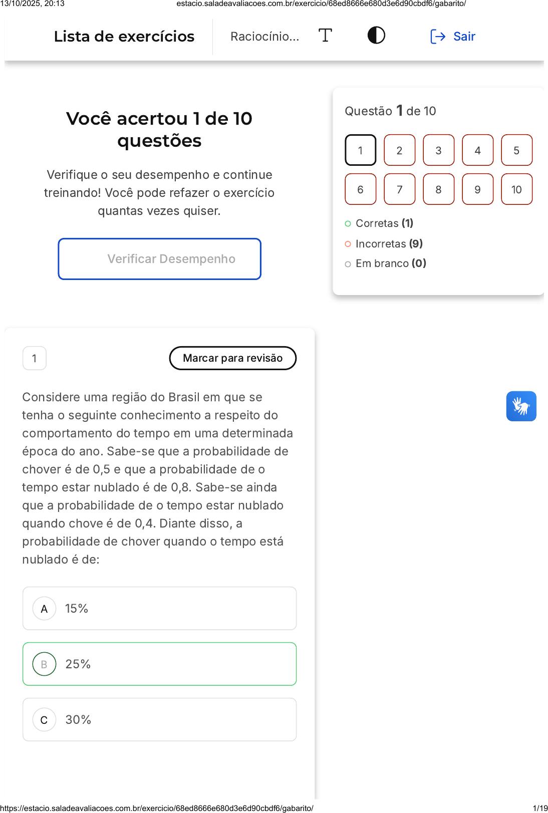 Você acertou 1 de 10 questões Verifique o seu desempenho e continue treinando! Você pode refazer o exercício quantas vezes quiser. Verificar Desempenho A B C 1 Marcar para revisão Considere uma região do Brasil em que se tenha o seguinte conhecimento a respeito do comportamento do tempo em uma determinada época do ano. Sabe-se que a probabilidade de chover é de 0,5 e que a probabilidade de o tempo estar nublado é de 0,8. Sabe-se ainda que a probabilidade de o tempo estar nublado quando chove é de 0,4. Diante disso, a probabilidade de chover quando o tempo está nublado é de: 15% 25% 30% Questão 1 de 10 Corretas (1) Incorretas (9) Em branco (0) 1 2 3 4 5 6 7 8 9 10 Lista de exercícios Raciocínio… Sair 13/10/2025, 20:13 estacio.saladeavaliacoes.com.br/exercicio/68ed8666e680d3e6d90cbdf6/gabarito/ https://estacio.saladeavaliacoes.com.br/exercicio/68ed8666e680d3e6d90cbdf6/gabarito/ 1/19 D E 40% 50% Resposta correta Parabéns, você selecionou a alternativa correta. Confira o gabarito comentado! Gabarito Comentado A solução desse problema envolve a aplicação direta do Teorema de Bayes. Antes disso, porém, é preciso identificar os eventos envolvidos na situação apresentada: A = chuva B = tempo nublado Em seguida, identifica-se as probabilidades fornecidas: P(A) = 0,5 P(B) = 0,8 P(B | A) = 0,4 Com isso, têm-se disponíveis todos os elementos necessários para calcular P(A | B) que corresponde à probabilidade de chover, dado que o tempo está nublado. Agora, basta aplicar a regra de Bayes: 2 Marcar para revisão Considere um conjunto nebuloso A definido em um universo de discurso X = [0, 100]. Sabendo 13/10/2025, 20:13 estacio.saladeavaliacoes.com.br/exercicio/68ed8666e680d3e6d90cbdf6/gabarito/ https://estacio.saladeavaliacoes.com.br/exercicio/68ed8666e680d3e6d90cbdf6/gabarito/ 2/19 A B C D E que A é um conjunto triangular, cujos vértices são a = 20, b = 60 e c = 80, o grau de inclusão de x = 70 no conjunto A é: 0,2 0,3 0,4 0,5 0,6 Resposta incorreta Opa! A alternativa correta é a letra D. Confira o gabarito comentado! Gabarito Comentado 3 Marcar para revisão Seja S uma variável nebulosa com a seguinte descrição: 13/10/2025, 20:13 estacio.saladeavaliacoes.com.br/exercicio/68ed8666e680d3e6d90cbdf6/gabarito/ https://estacio.saladeavaliacoes.com.br/exercicio/68ed8666e680d3e6d90cbdf6/gabarito/ 3/19 A B C D E Supondo a inferência usando o método de corte para a implicação e a condensação pelo centro de gravidade e considerando que os valores de x estão discretizados de 10 em 10, o valor de saída obtido é: 10 32 25 7 16 Resposta incorreta Opa! A alternativa correta é a letra E. Confira o gabarito comentado! Gabarito Comentado Como as regras combinam seus antecedentes por meio do operador AND, o valor de inclusão no conjunto que está no consequente é dado pelo mínimo entre os graus de inclusão nos antecedentes. Portanto, após a execução das regras, os resultados obtidos são: C2(0,20) e 13/10/2025, 20:13 estacio.saladeavaliacoes.com.br/exercicio/68ed8666e680d3e6d90cbdf6/gabarito/ https://estacio.saladeavaliacoes.com.br/exercicio/68ed8666e680d3e6d90cbdf6/gabarito/ 4/19 A B C1(0,60). Considerando o método de corte para a implicação, a região de resposta obtida é representada pelo gráfico a seguir: 4 Marcar para revisão Um método de inferência probabilística bastante simples, é aquele que usa como base de conhecimento a distribuição de probabilidade conjunta total das variáveis aleatórias que descrevem o domínio de interesse. Sobre esse método de inferência, analise as afirmações a seguir: I - Permite estimar a probabilidade de ocorrência de qualquer evento relacionado ao domínio em análise. II - Apesar da simplicidade, seu uso pode se tornar inviável em situações em que há muitas variáveis envolvidas. III - A identificação de independências entre as variáveis aleatórias pode simplificar a construção da distribuição conjunta total. Estão corretas apenas as afirmações: I II 13/10/2025, 20:13 estacio.saladeavaliacoes.com.br/exercicio/68ed8666e680d3e6d90cbdf6/gabarito/ https://estacio.saladeavaliacoes.com.br/exercicio/68ed8666e680d3e6d90cbdf6/gabarito/ 5/19 C D E II e III I e III I, II e III Resposta incorreta Opa! A alternativa correta é a letra E. Confira o gabarito comentado! Gabarito Comentado A afirmação I está correta, pois, a distribuição de probabilidade conjunta total fornece um valor de probabilidade de ocorrência para cada combinação possível de valores de todas as variáveis aleatórias do problema. Logo, por meio de uma consulta à distribuição é possível responder quaisquer perguntas sobre o domínio em análise. A afirmação II também está correta, pois, a quantidade de probabilidades a estimar para construir a distribuição conjunta total cresce de forma exponencial com a quantidade de variáveis. Por exemplo, para n variáveis binárias, têm-se 2 probabilidades a estimar. Além disso, para muitas dessas probabilidades não há conhecimento disponível que permita estimáa-las com um mínimo de confiabilidade. Por fim, a afirmação III também está correta. A identificação de independências entre as variáveis permite a fatoração da distribuição conjunta total e isso pode n 13/10/2025, 20:13 estacio.saladeavaliacoes.com.br/exercicio/68ed8666e680d3e6d90cbdf6/gabarito/ https://estacio.saladeavaliacoes.com.br/exercicio/68ed8666e680d3e6d90cbdf6/gabarito/ 6/19 diminuir significativamente a quantidade de probabilidades a estimar. 5 Marcar para revisão (COPPIN, 2010 - adaptado) Imagine que em uma cidade há duas companhias de táxi, sendo que uma usa táxis amarelos e a outra táxis brancos. A companhia de táxis amarelos tem 90 carros e a de brancos, apenas 10. Foi relatado um incidente de atropelamento, com fuga do motorista, e uma testemunha ocular declarou estar certa de que o carro envolvido no acidente era um táxi branco. Devido ao mau tempo no momento do incidente, que po