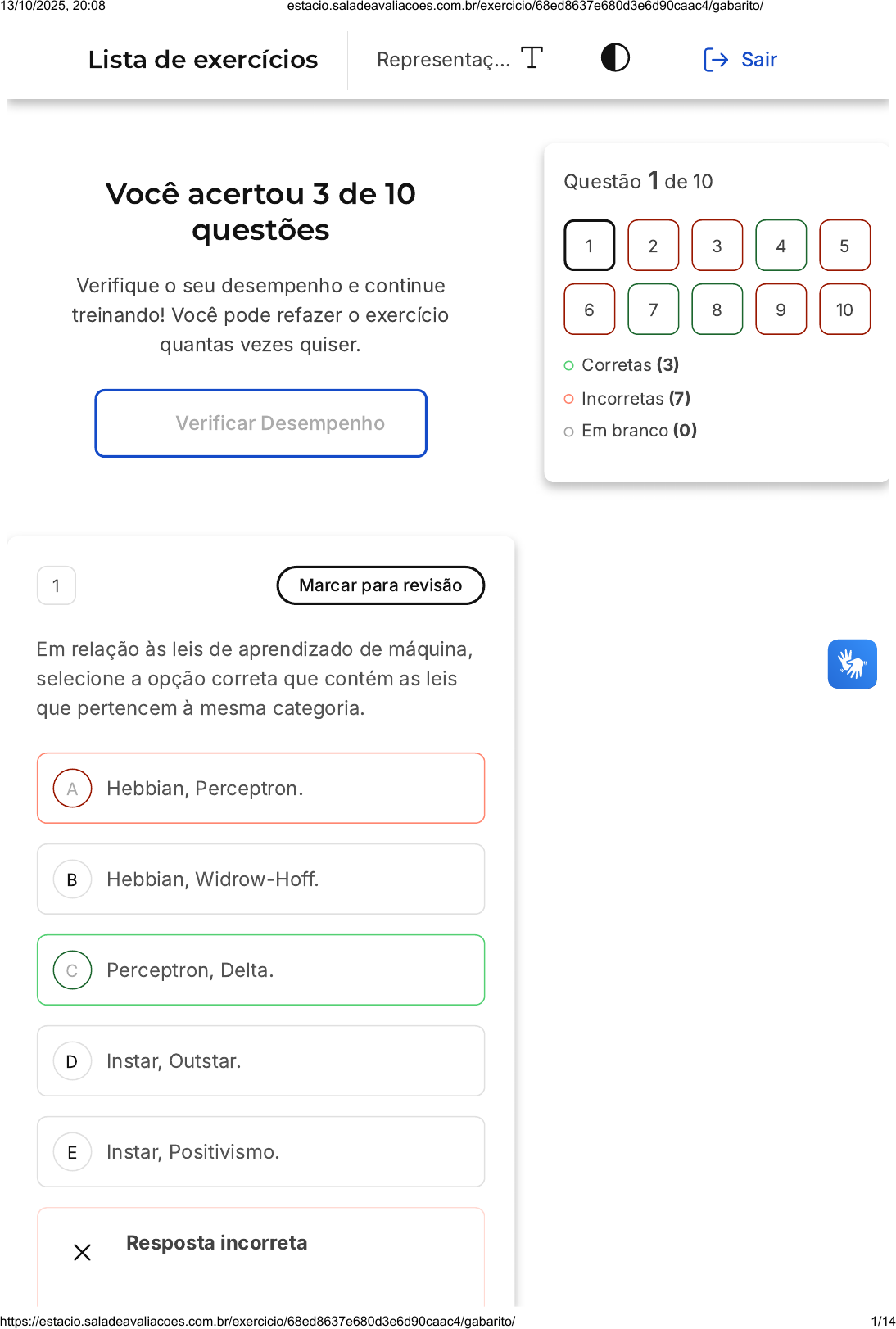 Você acertou 3 de 10 questões Verifique o seu desempenho e continue treinando! Você pode refazer o exercício quantas vezes quiser. Verificar Desempenho A B C D E 1 Marcar para revisão Em relação às leis de aprendizado de máquina, selecione a opção correta que contém as leis que pertencem à mesma categoria. Hebbian, Perceptron. Hebbian, Widrow-Hoff. Perceptron, Delta. Instar, Outstar. Instar, Positivismo. Resposta incorreta Questão 1 de 10 Corretas (3) Incorretas (7) Em branco (0) 1 2 3 4 5 6 7 8 9 10 Lista de exercícios Representaç… Sair 13/10/2025, 20:08 estacio.saladeavaliacoes.com.br/exercicio/68ed8637e680d3e6d90caac4/gabarito/ https://estacio.saladeavaliacoes.com.br/exercicio/68ed8637e680d3e6d90caac4/gabarito/ 1/14 A B Opa! A alternativa correta é a letra C. Confira o gabarito comentado! Gabarito Comentado Os métodos de aprendizado de máquina podem ser divididos em duas categorias principais: aprendizado supervisionado e aprendizado não supervisionado. No aprendizado supervisionado, uma solução alvo é fornecida no conjunto de treinamento, enquanto no aprendizado não supervisionado, nenhuma solução alvo é fornecida. Diversas regras de aprendizado de redes neurais se enquadram em uma dessas categorias. No contexto desta questão, apenas os métodos Perceptron e Delta pertencem à mesma categoria, que é a de regras de aprendizado supervisionado. 2 Marcar para revisão Um dos métodos mais conhecidos para treinamento de uma rede neural é o backpropagation. Em relação a esse método, selecione a opção correta sobre suas características. Trata-se de um método com baixa dependência dos ajustes dos parâmetros e dos dados de treinamento. É um método sofisticado que atua especificamente sobre a camada intermediária para ajustar os pesos. 13/10/2025, 20:08 estacio.saladeavaliacoes.com.br/exercicio/68ed8637e680d3e6d90caac4/gabarito/ https://estacio.saladeavaliacoes.com.br/exercicio/68ed8637e680d3e6d90caac4/gabarito/ 2/14 C D E Tem como principal característica o ajuste dos pesos durante o processamento da camada de entrada para a camada de saída. É um método aplicado a redes neurais de múltiplas camadas. É um método exato que, ao final do treinamento, garante que o modelo é capaz de generalizar classificações. Resposta incorreta Opa! A alternativa correta é a letra D. Confira o gabarito comentado! Gabarito Comentado O backpropagation é um algoritmo de treinamento amplamente utilizado em redes neurais. Sua principal característica é a capacidade de ajustar os pesos das conexões em redes de múltiplas camadas, a partir da camada de saída até a camada de entrada, por meio de um processo iterativo de otimização. Esse ajuste é feito com o objetivo de minimizar a diferença entre a saída prevista pela rede e a saída desejada. 3 Marcar para revisão As redes neurais são úteis para modelar e resolver diversas categorias de problemas. 13/10/2025, 20:08 estacio.saladeavaliacoes.com.br/exercicio/68ed8637e680d3e6d90caac4/gabarito/ https://estacio.saladeavaliacoes.com.br/exercicio/68ed8637e680d3e6d90caac4/gabarito/ 3/14 A B C D E Nesse sentido, selecione a opção correta a respeito das aplicações das redes neurais. São indicadas para substituir os profissionais em atividades complexas e eventuais. São capazes de desenvolver processos criativos sem a necessidade de base de conhecimento. Problemas linearmente separáveis estão entre as categorias que podem ser modelados por redes neurais. São aplicadas em contextos em que há limitação de dados. Devem ser aplicadas para demonstração de teoremas. Resposta incorreta Opa! A alternativa correta é a letra C. Confira o gabarito comentado! Gabarito Comentado As redes neurais são modelos computacionais que auxiliam profissionais em atividades complexas, ao invés de substituí-los. Elas extraem conhecimento de uma base de treinamento, sendo, portanto, limitadas ao contexto desse treinamento. As redes neurais artificiais podem ser aplicadas a diversas categorias de problemas, especialmente aqueles de classificação. Quando os problemas de 13/10/2025, 20:08 estacio.saladeavaliacoes.com.br/exercicio/68ed8637e680d3e6d90caac4/gabarito/ https://estacio.saladeavaliacoes.com.br/exercicio/68ed8637e680d3e6d90caac4/gabarito/ 4/14 A B C D E classificação são linearmente separáveis, ou seja, podem ser separados por linhas, temos um exemplo clássico de situação que pode ser resolvida por modelos de redes neurais. Portanto, a alternativa correta é a que afirma que problemas linearmente separáveis estão entre as categorias que podem ser modelados por redes neurais. É importante lembrar que as redes neurais devem ser aplicadas a situações para as quais foram treinadas e são adequadas para tratar de problemas probabilísticos. 4 Marcar para revisão É possível aplicar algoritmos de inteligência artificial em equipamentos que utilizam informações vagas com uma habilidade que simulam a intuição humana. Nesse sentido, selecione a opção correta sobre essa técnica de Inteligência Artificial. Lógica booleana. Lógica de segunda ordem. Lógica fuzzy. Lógica das sentenças. Lógica de primeira ordem. 13/10/2025, 20:08 estacio.saladeavaliacoes.com.br/exercicio/68ed8637e680d3e6d90caac4/gabarito/ https://estacio.saladeavaliacoes.com.br/exercicio/68ed8637e680d3e6d90caac4/gabarito/ 5/14 Resposta correta Parabéns, você selecionou a alternativa correta. Confira o gabarito comentado! Gabarito Comentado A lógica booleana, também conhecida como lógica das sentenças, opera com valores lógicos binários, ou seja, verdadeiro ou falso. As lógicas de primeira e de segunda ordem, embora sejam fundamentais em muitos aspectos da inteligência artificial, não são adequadas para lidar com a incerteza ou com informações vagas. Por outro lado, a lógica fuzzy é uma técnica de Inteligência Artificial que permite a manipulação de informações imprecisas ou vagas, simulando a capacidade humana d