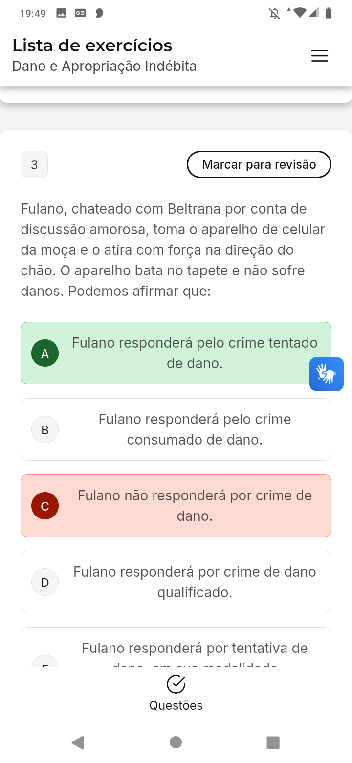 19:49 GE Lista de exercícios Dano e Apropriação Indébita 3 Marcar para revisão Fulano, chateado com Beltrana por conta de discussão amorosa, toma aparelho de celular da moça e o atira com força na direção do chão. aparelho bata no tapete e não sofre danos. Podemos afirmar que: Fulano responderá pelo crime tentado A de dano. Fulano responderá pelo crime consumado de dano. Fulano não responderá por crime de dano. Fulano responderá por crime de dano D qualificado. Fulano responderá por tentativa de Questões