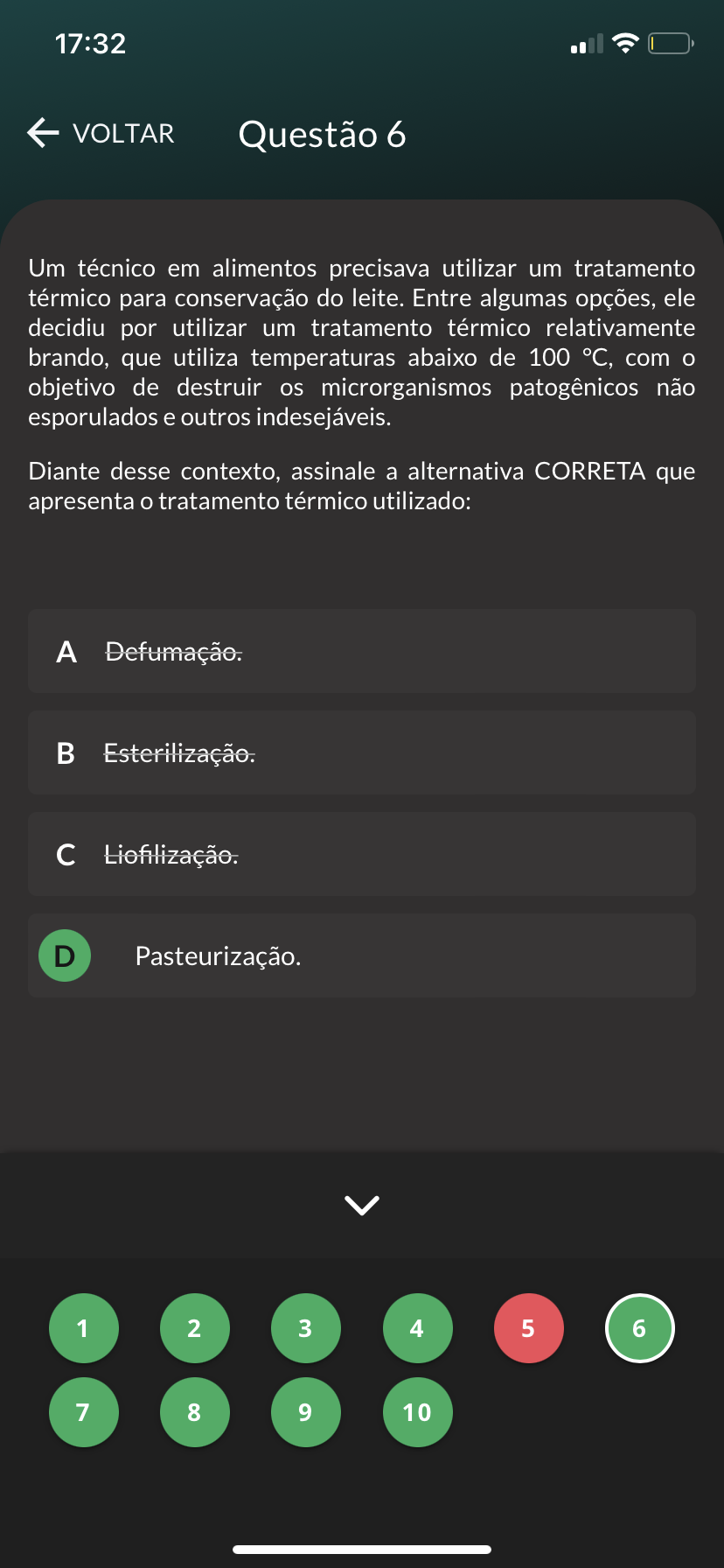17:32 VOLTAR Questão 6 Um técnico em alimentos precisava utilizar um tratamento térmico para conservação do leite. Entre algumas opções, ele decidiu por utilizar um tratamento térmico relativamente brando, que utiliza temperaturas abaixo de 100 com o objetivo de destruir os microrganismos patogênicos não esporulados e outros indesejáveis. Diante desse contexto, assinale a alternativa CORRETA que apresenta o tratamento térmico utilizado: A Defumação. Esterilização. c Liofilização. D Pasteurização. 1 2 3 4 5 6 7 8 9 10