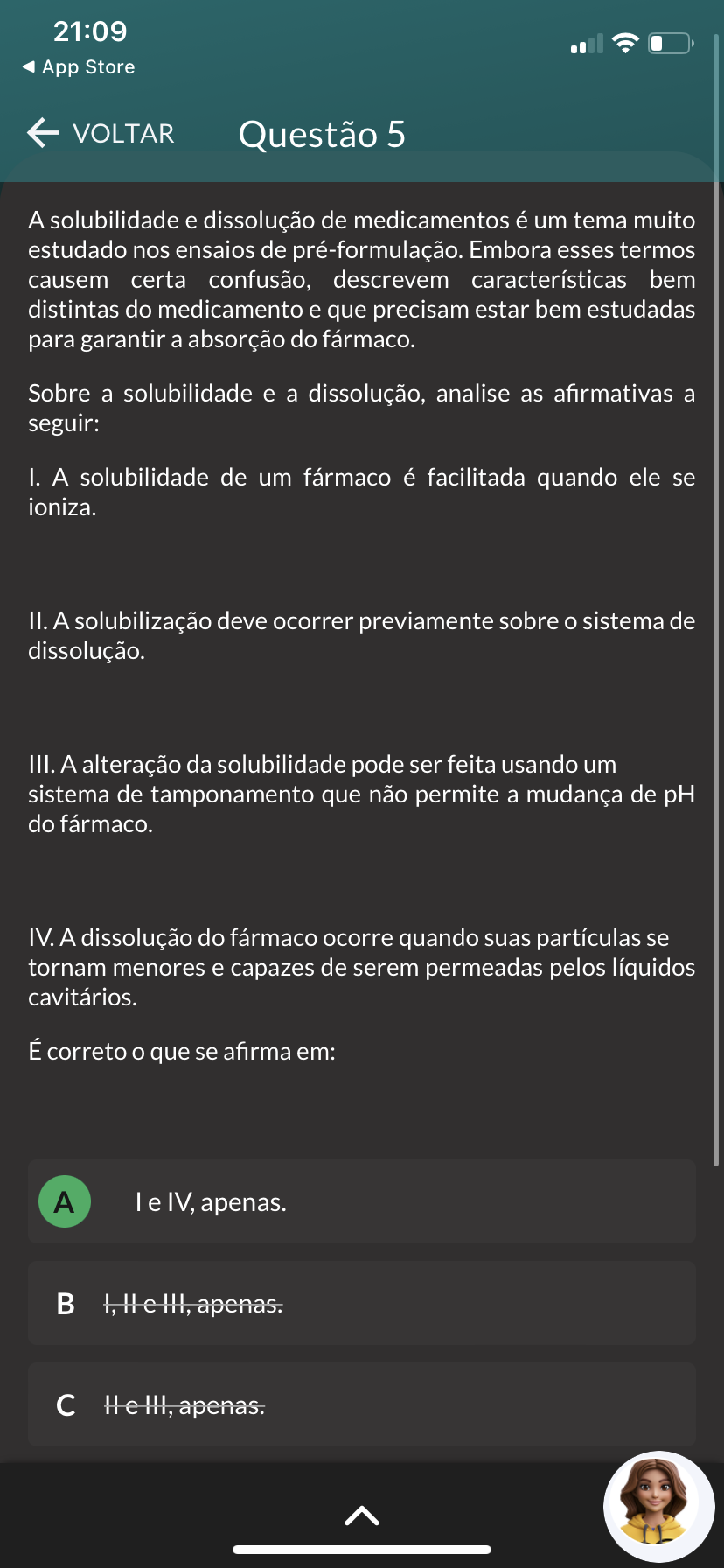 21:09 App Store VOLTAR Questão 5 A solubilidade e dissolução de medicamentos é um tema muito estudado nos ensaios de pré-formulação. Embora esses termos causem certa confusão, descrevem características bem distintas do medicamento e que precisam estar bem estudadas para garantir a absorção do fármaco. Sobre a solubilidade e a dissolução, analise as afirmativas a seguir: I. A solubilidade de um fármaco é facilitada quando ele se ioniza. II. A solubilização deve ocorrer previamente sobre sistema de dissolução. III. A alteração da solubilidade pode ser feita usando um sistema de tamponamento que não permite a mudança de pH do fármaco. IV. A dissolução do fármaco ocorre quando suas partículas se tornam menores e capazes de serem permeadas pelos líquidos cavitários. É correto o que se afirma em: A le IV, apenas. c