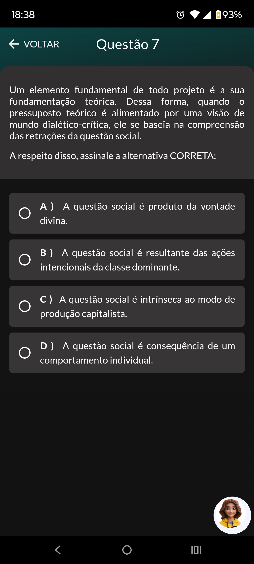 18:38 93% VOLTAR Questão 7 Um elemento fundamental de todo projeto é a sua fundamentação teórica. Dessa forma, quando pressuposto teórico é alimentado por uma visão de mundo dialético-crítica, ele se baseia na compreensão das retrações da questão social. respeito disso, assinale a alternativa CORRETA: A) A questão social é produto da vontade divina. B) A questão social é resultante das ações intencionais da classe dominante. C) A questão social é intrínseca ao modo de produção capitalista. A questão social é consequência de um comportamento individual.