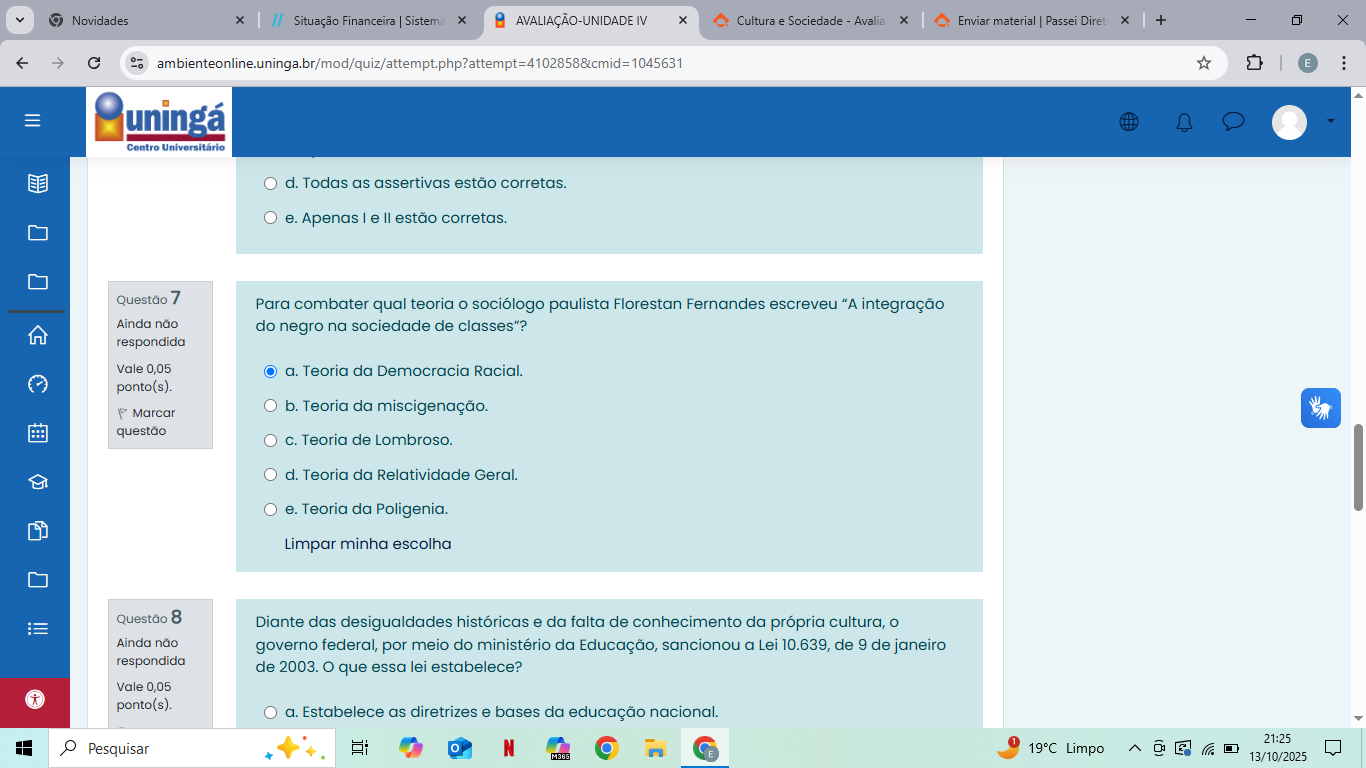 Novidades Situação Financeira AVALIAÇÃO-UNIDADE IV Cultura e Sociedade Avalia Enviar material Passei Diret X + X E uningá Centro Universitário d. Todas as assertivas estão corretas. e. Apenas I e II estão corretas. Questão 7 Para combater qual teoria sociólogo paulista Florestan Fernandes escreveu "A integração Ainda não do negro na sociedade de classes"? respondida Vale 0,05 a. Teoria da Democracia Racial. ponto(s). Marcar b. Teoria da miscigenação. questão C. Teoria de Lombroso. d. Teoria da Relatividade Geral. e. Teoria da Poligenia. Limpar minha escolha Questão 8 Diante das desigualdades históricas e da falta de conhecimento da própria cultura, O Ainda não governo federal, por meio do ministério da Educação, sancionou a Lei 10.639, de 9 de janeiro respondida de 2003. que essa lei estabelece? Vale 0,05 ponto(s). a. Estabelece as diretrizes e bases da educação nacional. 21:25 Pesquisar 19°C Limpo M365 13/10/2025