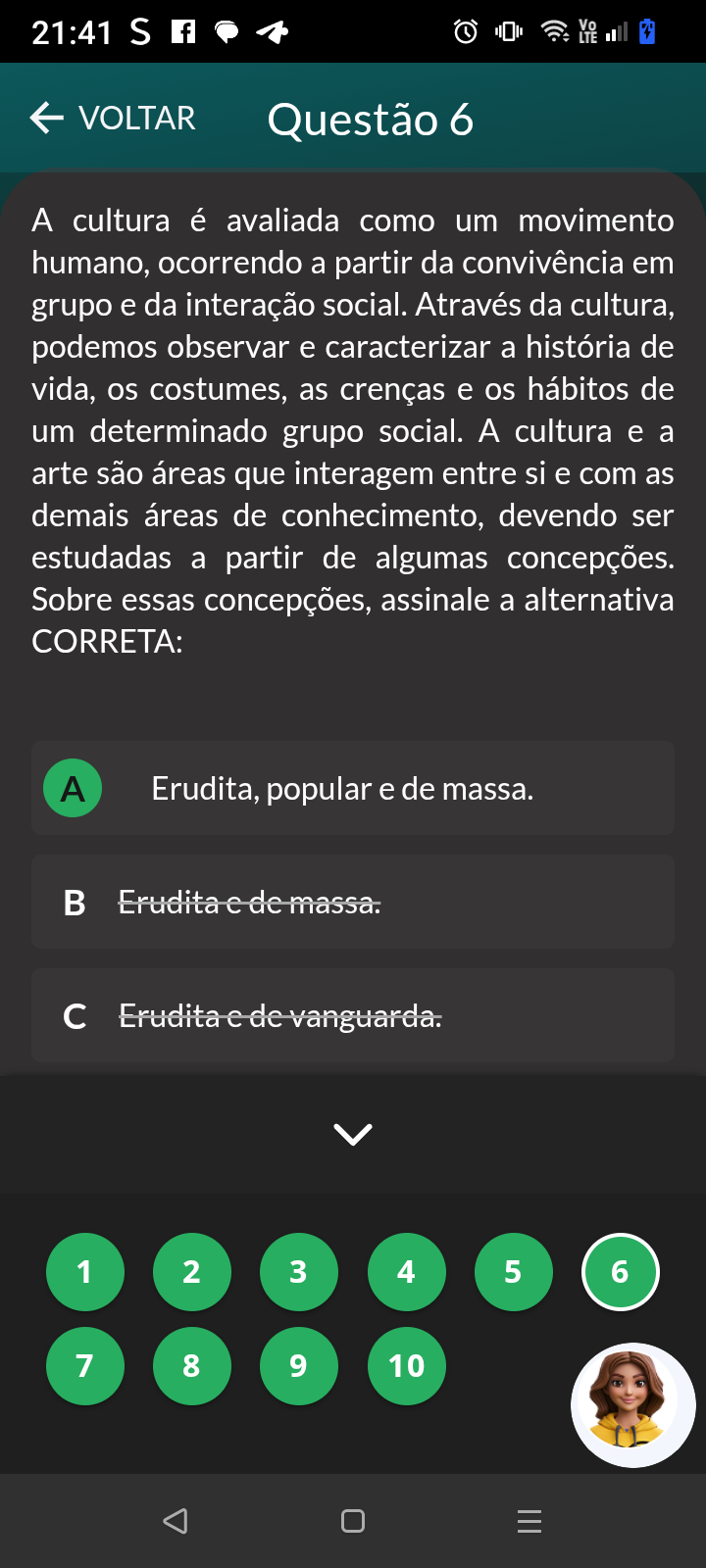 21:41 S f VOLTAR Questão 6 A cultura é avaliada como um movimento humano, ocorrendo a partir da convivência em grupo e da interação social. Através da cultura, podemos observar e caracterizar a história de vida, os costumes, as crenças e os hábitos de um determinado grupo social. A cultura e a arte são áreas que interagem entre si e com as demais áreas de conhecimento, devendo ser estudadas a partir de algumas concepções. Sobre essas concepções, assinale a alternativa CORRETA: A Erudita, popular e de massa. Erudita e de massa. c Erudita e de vanguarda. 1 2 3 4 5 6 7 8 9 10