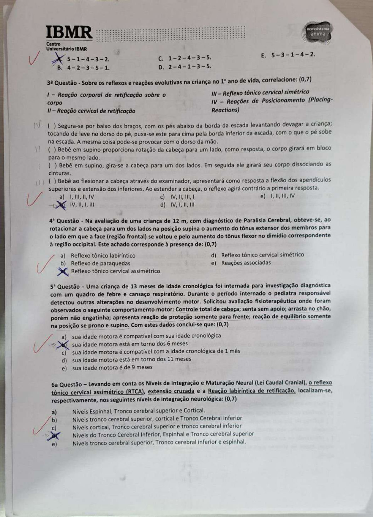 IBMR Centro Universitário IBMR 5-1-4-3-2. C. 1-2-4-3-5. E. 5-3-1-4-2. B. 4-2-3-5-1. D. 2-4-1-3-5. Questão Sobre os reflexos e reações evolutivas na criança no 1° ano de vida, correlacione: (0,7) - Reação corporal de retificação sobre III Reflexo tônico cervical simétrico corpo IV Reações de Posicionamento (Placing- Reação cervical de retificação Reactions) Segura-se por baixo dos braços, com os pés abaixo da borda da escada levantando devagar a criança; tocando de leve no dorso do pé, puxa-se este para cima pela borda inferior da escada, com que pé sobe na escada. A mesma coisa pode-se provocar com dorso da mão. Bebê em supino proporciona rotação da cabeça para um lado, como resposta, corpo girará em bloco para mesmo lado. Bebê em supino, gira-se a cabeça para um dos lados. Em seguida ele girará seu corpo dissociando as cinturas. Bebê ao flexionar a cabeça através do examinador, apresentará como resposta a flexão dos apendículos superiores e extensão dos inferiores. Ao estender a cabeça, reflexo agirá contrário a primeira resposta. a) I, III, II, IV c) IV, III, e) I, II, III, IV IV, II, I, III d) IV, I, II, Questão Na avaliação de uma criança de 12 m, com diagnóstico de Paralisia Cerebral, obteve-se, ao rotacionar a cabeça para um dos lados na posição supina aumento do tônus extensor dos membros para lado em que a face (região frontal) se voltou e pelo aumento do tônus flexor no dimídio correspondente à região occipital. Este achado corresponde à presença de: (0,7) a) Reflexo tônico labiríntico d) Reflexo tônico cervical simétrico b) Reflexo de paraquedas e) Reações associadas Reflexo tônico cervical assimétrico Questão Uma criança de 13 meses de idade cronológica foi internada para investigação diagnóstica com um quadro de febre e cansaço respiratório. Durante período internado pediatra responsável detectou outras alterações no desenvolvimento motor. Solicitou avaliação fisioterapêutica onde foram observados seguinte comportamento motor: Controle total de cabeça; senta sem apoio; arrasta no chão, porém não engatinha; apresenta reação de proteção somente para frente; reação de equilíbrio somente na posição se prono e supino. Com estes dados conclui-se que: (0,7) a) sua idade motora é compatível com sua idade cronológica sua idade motora está em torno dos 6 meses c) sua idade motora é compatível com a idade cronológica de 1 mês d) sua idade motora está em torno dos 11 meses e) sua idade motora é de 9 meses 6a Questão Levando em conta os Níveis de Integração e Maturação Neural (Lei Caudal Cranial), reflexo tônico cervical assimétrico (RTCA), extensão cruzada e a Reação labiríntica de retificação, localizam-se, respectivamente, nos seguintes níveis de integração neurológica: (0,7) a) Níveis Espinhal, Tronco cerebral superior e Cortical. b) Níveis tronco cerebral superior, cortical e Tronco Cerebral inferior c) Níveis cortical, Tronco cerebral superior e tronco cerebral inferior Níveis do Tronco Cerebral Inferior, Espinhal e Tronco cerebral superior e) Níveis tronco cerebral superior, Tronco cerebral inferior e espinhal.