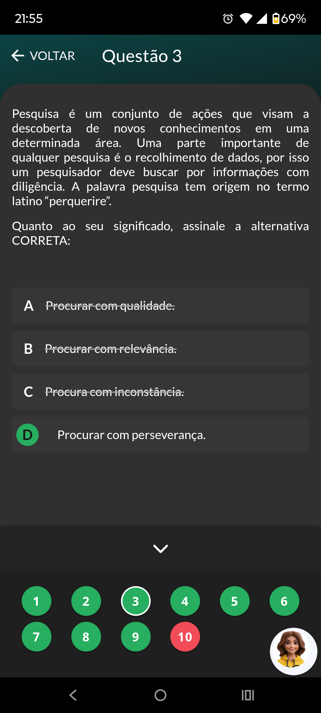 21:55 69% VOLTAR Questão 3 Pesquisa é um conjunto de ações que visam a descoberta de novos conhecimentos em uma determinada área. Uma parte importante de qualquer pesquisa é recolhimento de dados, por isso um pesquisador deve buscar por informações com diligência. A palavra pesquisa tem origem no termo latino "perquerire". Quanto ao seu significado, assinale a alternativa CORRETA: A Procurar com qualidade. Procurar com relevância. c Procura com inconstância. D Procurar com perseverança. 1 2 3 4 5 6 7 8 9 10