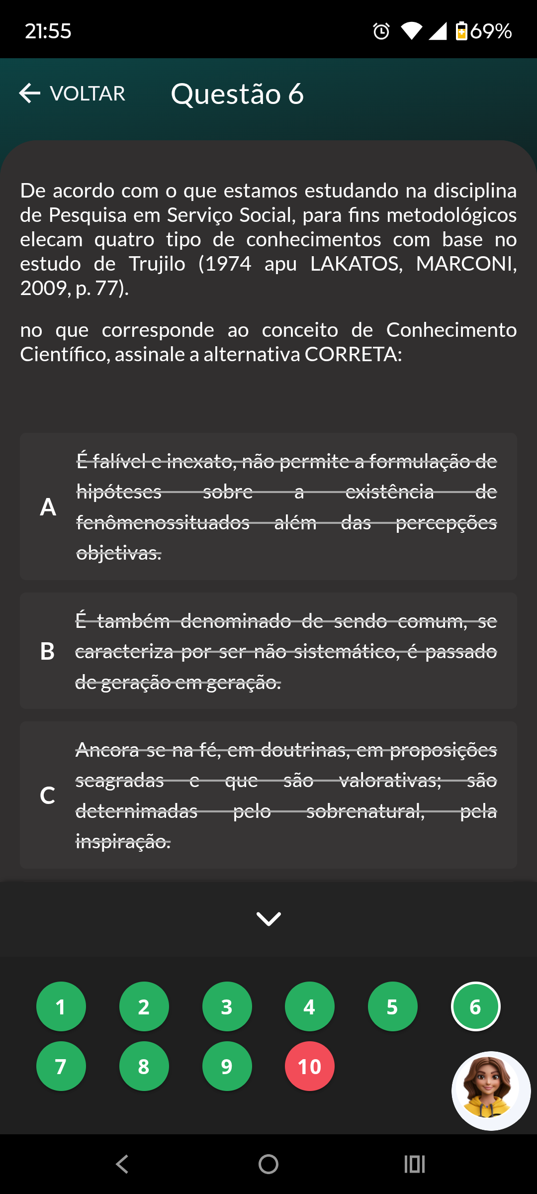 21:55 69% VOLTAR Questão 6 De acordo com que estamos estudando na disciplina de Pesquisa em Serviço Social, para fins metodológicos elecam quatro tipo de conhecimentos com base no estudo de Trujilo (1974 apu LAKATOS, MARCONI, 2009, p. 77). no que corresponde ao conceito de Conhecimento Científico, assinale a alternativa CORRETA: É falível inexato, não permite a formulação de hipóteses sobre a existência de A fenômenossituados além das percepções objetivas. É também denominado de sendo comum, se caracteriza por ser não sistemático, é passado de geração geração. Ancora se na fé, doutrinas, em proposições seagradas e que são valorativas; são c deternimadas pelo sobrenatural, pela inspiração. 1 2 3 4 5 6 7 8 9 10