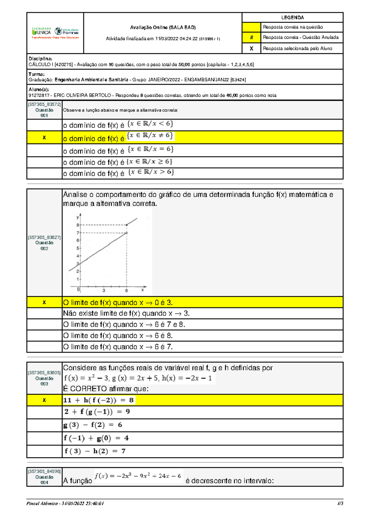 LEGENDA FACULDADE Online (SALA EAD) correla na questão UNICA Promines Transformendo finalizada em 11/03/2022 04:24:22 / 1) # correla - Questão Anulada X selecionada pelo CÁLCULO I [420275] Avaliação 10 peso total de 50,00 pantas Turma: Graduação: Engenharia e Grupo: JANEIRO/2022 [63424] Aluno(a): 91272817 ERIC OLIVEIRA BERTOLO Respondeu correlas, um de 40,00 pantas cama nota Questão Observe a lunção abaixo e marque a 001 domínio de f(x) é {x E R/x