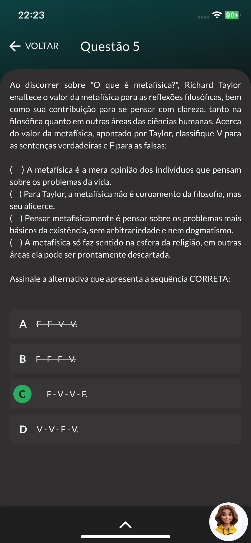 22:23 904 VOLTAR Questão 5 Ao discorrer sobre "O que é metafísica?", Richard Taylor enaltece o valor da metafísica para as reflexões filosóficas, bem como sua contribuição para se pensar com clareza, tanto na filosófica quanto em outras áreas das ciências humanas. Acerca do valor da metafísica, apontado por Taylor, classifique V para as sentenças verdadeiras e F para as falsas: A metafísica é a mera opinião dos indivíduos que pensam sobre os problemas da vida. Para Taylor, a metafísica não é coroamento da filosofia, mas seu alicerce. Pensar metafisicamente é pensar sobre os problemas mais básicos da existência, sem arbitrariedade e nem dogmatismo. A metafísica só faz sentido na esfera da religião, em outras áreas ela pode ser prontamente descartada. Assinale a alternativa que apresenta a sequência CORRETA: A F-V-V-F. D