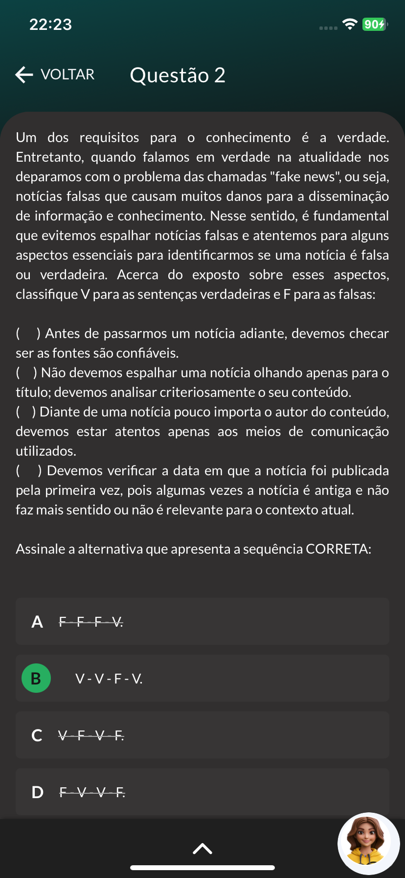 22:23 904 VOLTAR Questão 2 Um dos requisitos para conhecimento é a verdade. Entretanto, quando falamos em verdade na atualidade nos deparamos com o problema das chamadas "fake news", ou seja, notícias falsas que causam muitos danos para a disseminação de informação e conhecimento. Nesse sentido, é fundamental que evitemos espalhar notícias falsas e atentemos para alguns aspectos essenciais para identificarmos se uma notícia é falsa ou verdadeira. Acerca do exposto sobre esses aspectos, classifique V para as sentenças verdadeiras e F para as falsas: ( ) Antes de passarmos um notícia adiante, devemos checar ser as fontes são confiáveis. Não devemos espalhar uma notícia olhando apenas para o título; devemos analisar criteriosamente seu conteúdo. Diante de uma notícia pouco importa autor do conteúdo, devemos estar atentos apenas aos meios de comunicação utilizados. ( ) Devemos verificar a data em que a notícia foi publicada pela primeira vez, pois algumas vezes a notícia é antiga e não faz mais sentido ou não é relevante para contexto atual. Assinale a alternativa que apresenta a sequência CORRETA: A B V-V-F-V. c D