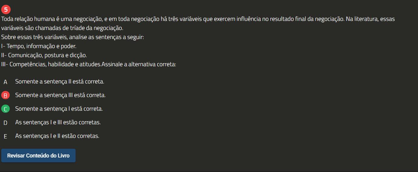 5 Toda relação humana é uma negociação, e em toda negociação há três variáveis que exercem influência no resultado final da negociação. Na literatura, essas variáveis são chamadas de tríade da negociação. Sobre essas três variáveis, analise as sentenças a seguir: I- Tempo, informação e poder. II- Comunicação, postura e dicção. III- Competências, habilidade e atitudes.Assinale a alternativa correta: A Somente a sentença está correta. Somente a sentença III está correta. Somente a sentença está correta. D As sentenças I e III estão corretas. E As sentenças I e estão corretas. Revisar Conteúdo do Livro