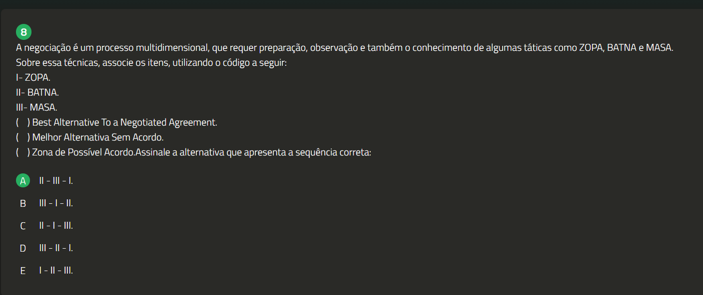 8 A negociação é um processo multidimensional, que requer preparação, observação e também conhecimento de algumas táticas como ZOPA, BATNA e MASA. Sobre essa técnicas, associe itens, utilizando 0 código a seguir: I- ZOPA. II- BATNA. III- MASA. Best Alternative To a Negotiated Agreement. Melhor Alternativa Sem Acordo. ( ) Zona de Possível Acordo.Assinale a alternativa que apresenta a sequência correta: A III I. III I II. I III. D III I. E III.