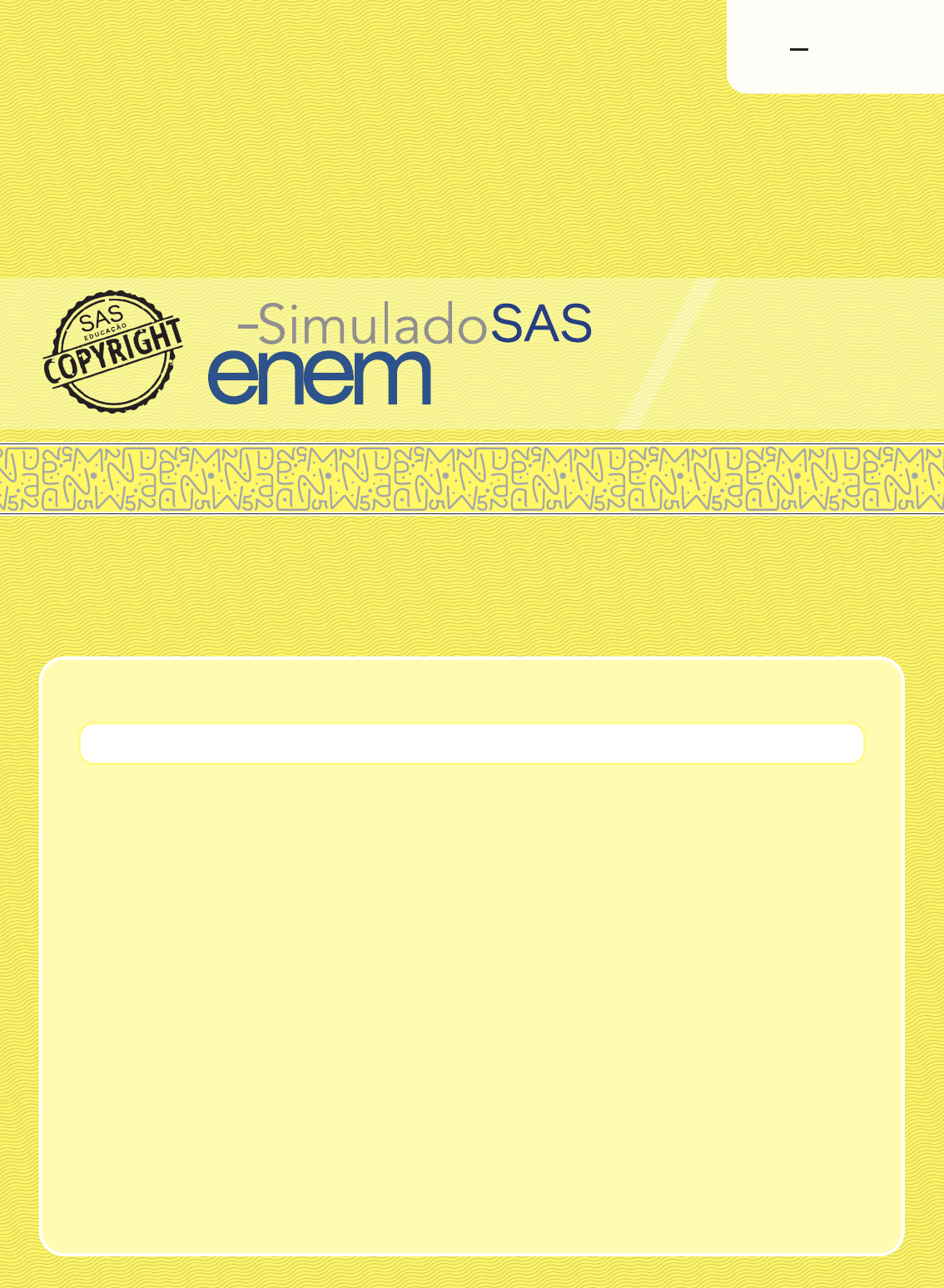 Período de aplicação: 10/05/2025 a 12/05/2025 EXAME NACIONAL DO ENSINO MÉDIO PROVA DE LINGUAGENS, CÓDIGOS E SUAS TECNOLOGIAS E REDAÇÃO PROVA DE CIÊNCIAS HUMANAS E SUAS TECNOLOGIAS Este simulado é protegido por direitos autorais do SAS Educação e seu uso é exclusivo às instituições de ensino parceiras e aos alunos da plataforma, não podendo ser reproduzido, copiado ou compartilhado sem autorização expressa, por escrito, sob pena de caracterização de ato ilícito pela violação de direitos autorais. 1o DIA 1. Este CADERNO DE QUESTÕES contém 90 questões numeradas de 01 a 90 e a Proposta de Redação, dispostas da seguinte maneira: a) questões de número 01 a 45, relativas à área de Linguagens, Códigos e suas Tecnologias; b) Proposta de Redação; c) questões de número 46 a 90, relativas à área de Ciências Humanas e suas Tecnologias. ATENÇÃO: as questões de 01 a 05 são relativas à língua estrangeira. Você deverá responder apenas às questões relativas à língua estrangeira (inglês ou espanhol) escolhida no seu CARTÃO-RESPOSTA. 2. Confira se a quantidade e a ordem das questões do seu CADERNO DE QUESTÕES estão de acordo com as instruções anteriores. Caso o caderno esteja incompleto, tenha defeito ou apresente qualquer divergência, comunique ao aplicador da sala para que ele tome as providências cabíveis. 3. Para cada uma das questões objetivas, são apresentadas 5 opções. Apenas uma responde corretamente à questão. 4. O tempo disponível para estas provas é de cinco horas e trinta minutos. 5. Reserve tempo suficiente para preencher o CARTÃO-RESPOSTA e a FOLHA DE REDAÇÃO. ATENÇÃO: ao preencher o cartão-resposta, marque o caderno que utilizou para a realização do simulado. 6. Os rascunhos e as marcações assinaladas no CADERNO DE QUESTÕES não serão considerados na avaliação. 7. Somente serão corrigidas as redações transcritas na FOLHA DE REDAÇÃO. 8. Quando terminar as provas, acene para chamar o aplicador e entregue este CADERNO DE QUESTÕES e o CARTÃO-RESPOSTA/FOLHA DE REDAÇÃO. 9. Você não poderá se ausentar da sala de provas levando consigo o CADERNO DE QUESTÕES antes do prazo estabelecido e/ou o CARTÃO-RESPOSTA a qualquer tempo. ATENÇÃO: transcreva no espaço apropriado do seu CARTÃO-RESPOSTA, com sua caligrafia usual, considerando as letras maiúsculas e minúsculas, a seguinte frase: Desistir é coragem difícil LEIA ATENTAMENTE AS INSTRUÇÕES SEGUINTES: CADERNO 2 AMARELO 2o 2025202520252025 TODOS OS DIREITOS TODOS OS DIREITOS RESERVADOS RESERVADOS 01_2025_2oENEM_1oDIA_MIOLO_LC_M2.indd 101_2025_2oENEM_1oDIA_MIOLO_LC_M2.indd 1 12/02/2025 14:11:2412/02/2025 14:11:24 2 Copyright © 2025 de SAS Educação – Todos os direitos reservados. 20252025 Exame Nacional do Ensino Médio LINGUAGENS, CÓDIGOS E SUAS TECNOLOGIAS E REDAÇÃO 1o DIA CADERNO 2 AMARELO 20252025 LINGUAGENS, CÓDIGOS E SUAS TECNOLOGIAS Questões de 01 a 45 Questões de 01 a 05 (opção inglês) QUESTÃO 01 Up till now, the math of my life has been pretty simple: friends plus family plus sports. What more could I ask for, right? But lately, my outside has been changing and my inside keeps telling me more is on the way. Trouble is, I’m not sure I’m ready. GRIMES, Nikki. “New Math”. Disponível em: https://www.poetryfoundation.org. Acesso em: 27 out. 2024. No poema, ao abordar o seu processo de amadurecimento, o eu lírico reflete acerca das A A inseguranças ocasionadas por vivências do passado. B B complexidades das relações familiares e de amizade. C C dificuldades de conciliar as diferentes áreas da vida. D D incertezas diante das transformações pessoais. E E mudanças na forma de lidar com a aparência. QUESTÃO 02 HILBURN, S. The Argyle Sweater. Disponível em: https://www.washingtonpost.com. Acesso em: 26 out. 2024. No cartum, a expressão “I’m doomed” indica que a personagem A A entende o tratamento como algo concluído. B B considera a situação como sendo irreversível. C C analisa a importância de fazer uma autorreflexão. D D tem um sentimento de tédio por estar na consulta. E E cogita uma outra abordagem para lidar com os medos. 01_2025_2oENEM_1oDIA_MIOLO_LC_M2.indd 201_2025_2oENEM_1oDIA_MIOLO_LC_M2.indd 2 12/02/2025 14:11:2512/02/2025 14:11:25 20252025 Exame Nacional do Ensino Médio 3 Copyright © 2025 de SAS Educação – Todos os direitos reservados. LINGUAGENS, CÓDIGOS E SUAS TECNOLOGIAS E REDAÇÃO 1o DIA CADERNO 2 AMARELO20252025 QUESTÃO 03 At eight o’clock Joseph and Kenneth come into the store. They come almost every Tuesday. It’s become a routine among the three of us without our ever having acknowledged it as such. Sometimes only one of them comes. Sometimes neither of them. No questions are asked because nothing is expected. Seventeen years ago we were all new immigrants working as valets at the Capitol Hotel. According to the plaque outside the main entrance, the hotel was built to resemble the Medicis’ family house in Italy. On weekends tourists lined the rooftop to stare at the snipers perched on the White House roof. It was there that Kenneth became Ken the Kenyan and Joseph, Joe from the Congo. I was skinnier then than I am now, and as our manager said, I didn’t need a nickname to remind him I was Ethiopian. Mengestu, Dinaw. The beautiful things that heaven bears. Londres: Penguin Books, 2007. No trecho, a fala do gestor mencionada pelo narrador demonstra uma atitude de A A reprodução de estereótipo negativo relacionando aparência e lugar de origem. B B oferecimento de oportunidades de trabalho a imigrantes nos Estados Unidos. C C proteção aos funcionários diante do preconceito de turistas estadunidenses. D D manifestação de incômodo com os apelidos atribuídos ao funcionário. E E crítica à individualidade dos subordinados nativos e dos imigrantes. QUESTÃO 04 A R O U N D COULD BE IF HAD ALL STUDENTS LIFTED OUT OF POVERTY READING I N P O O R COUNTRIES BASIC SKILLS 17