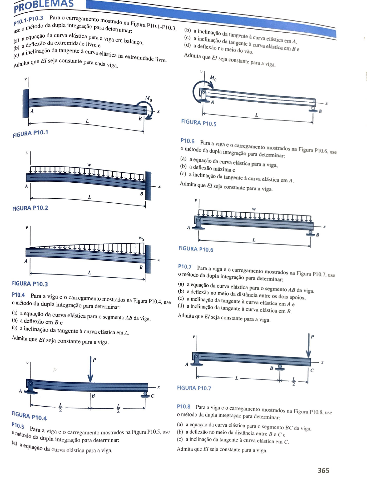 PROBLEMAS P10.1-P10.3 use o método da dupla integração para determinar: Para o carregamento mostrado na Figura (c) (b) a inclinação da tangente à curva elástica a equação da curva elástica para a viga em balanço, (a) a deflexão da extremidade livre e (d) a deflexão no meio do vão. a inclinação da tangente à curva elástica em em e (b) (c) a inclinação da tangente à curva elástica na extremidade livre. Admita que El seja constante para a viga. Admita que seja constante para cada viga. M₀ M₀ A x A L L FIGURA P10.5 FIGURA P10.1 P10.6 Para a viga e o carregamento mostrados na Figura use o método da dupla integração para determinar: v (a) a equação da curva elástica para a viga, (b) a deflexão máxima e (c) a inclinação da tangente à curva elástica em A. x Admita que El seja constante para a viga. A B L FIGURA P10.2 A L FIGURA P10.6 x A P10.7 Para a viga e o carregamento mostrados na Figura use L o método da dupla integração para determinar: FIGURA P10.3 (a) a equação da curva elástica para o segmento AB da viga, (b) a deflexão no meio da distância entre os dois apoios, P10.4 Para a viga e o carregamento mostrados na Figura P10.4, use (c) a inclinação da tangente à curva elástica em A e o método da dupla integração para determinar: (d) a inclinação da tangente à curva elástica em B. (a) a equação da curva elástica para o segmento AB da viga, Admita que El seja constante para a viga. (b) a deflexão em e (c) a inclinação da tangente à curva elástica em A. P Admita que seja constante para a viga. P A C L 2 x FIGURA P10.7 A P10.8 Para a viga e o carregamento mostrados na Figura use 2 2 o método da dupla integração para determinar: FIGURA P10.4 (a) a equação da curva elástica para o segmento BC da viga, P10.5 Para a viga e o carregamento mostrados na Figura P10.5, use (b) a deflexão no meio da distância entre B e 0 método da dupla integração para determinar: (c) a inclinação da tangente à curva elástica em C. (a) a equação da curva elástica para a viga, Admita que El seja constante para a viga. 365P ção para determinar a deflexão em A. Admita L 2,5 P e 30 kN/m. x P A W C D L 4L L FIGURA P10.8 A L P10.9 Para a viga e o carregamento mostrados na Figura P10.9, use o método da dupla integração para determinar: FIGURA P10.12 (a) a equação da curva elástica para o segmento AB da viga, (b) a deflexão no meio da distância entre A e e P10.13 Para a viga de aço em balanço [E 200 I 129 (c) a inclinação da tangente à curva elástica em mm⁴] mostrada na Figura P10.13, use o método da dupla Admita que El seja constante para a viga. ção 10⁶ para determinar a deflexão em Admita m, M₀ m e 15 kN/m. P W x A L A L 4 L FIGURA P10.9 P10.10 Para a viga e o carregamento mostrados na Figura P10.10, FIGURA P10.13 use o método da dupla integração para determinar: P10.14 Para a viga de aço em balanço [E 200 GPa; 129 (a) a equação da curva elástica para o segmento AC da viga, 10⁶ mm⁴] mostrada na Figura P10.14, use o método da dupla integn ção para determinar a deflexão em A. Admita L = 2,5 deflexão em B e (c) (b) a a inclinação da tangente à curva elástica em e 90 kN/m. Admita que El seja constante para a viga. P x C D B A A L L L L FIGURA P10.10 FIGURA P10.14 viga de aço simplesmente apoiada [E 200 GPa; P10.11 X Para 10⁶ mm⁴] a mostrada na Figura P10.11, Admita use o método L 4 da P du- P10.15 Para a viga e o carregamento mostrados na Figura pla I integração 129 para determinar a deflexão em B. m, use o método da dupla integração para determinar: 60 kN e W 40 kN/m. (a) a equação da curva elástica para a viga em balanço, (c) a inclinação da tangente à curva elástica na extremidade (b) a deflexão na extremidade livre e P Admita que El seja constante para a viga. x C A L L 2 2 B A FIGURA P10.11 L Para a viga de aço em balanço [E = 200 GPa; I 129 X P10.12 10⁶ mm⁴] mostrada na Figura P10.12, use o método da dupla integra- FIGURA P10.15 366Para a viga e o carregamento mostrados na Figura P10.16, v P10.16 método da dupla integração para determinar: W use equação da curva elástica para a viga em balanço, x (a) a a deflexão na extremidade livre e A (b) a inclinação da tangente à curva elástica na extremidade livre. L L Admita (c) que El seja constante para a viga. 2 2 FIGURA P10.18 v P10.19 Para a viga e o carregamento mostrados na Figura P10.19, use o método da dupla integração para determinar: x (a) a equação da curva elástica para toda a viga, A (b) a deflexão em Ce L (c) a inclinação da tangente à curva elástica em B. Admita que El seja constante para a viga. FIGURA P10.16 P10.17 Para a viga e o carregamento mostrados na Figura P10.17, W use o método da dupla integração para determinar: (a) a equação da curva elástica para a viga em balanço, x (b) a deflexão em B, A C (c) a deflexão na extremidade livre e 3L L (d) a inclinação da tangente à curva elástica na extremidade livre. Admita que El seja constante para a viga. FIGURA P10.19 P10.20 Para a viga e o carregamento mostrados na Figura P10.20, v use o método da dupla integração para determinar: (a) a equação da curva elástica para a viga, (b) o local da deflexão máxima e x (c) a deflexão máxima na viga. A Admita que El seja constante para a viga. L L 2 2 FIGURA P10.17 P10.18 Para a viga e o carregamento mostrados na Figura P10.18, use método da dupla integração para determinar: x A (a) a equação da curva elástica para a viga e (b) a deflexão em L Admita que seja constante para a viga. FIGURA P10.20 10.5 DEFLEXÕES POR INTEGRAÇÃO DAS EQUAÇÕES DO ESFORÇO CORTANTE OU DO CARREGAMENTO Na Seção 10.3, a equação da curva elástica foi obtida integrando a equação diferencial d²v El M (10.1) e aplicando as condições de contorno apropriadas para que fossem encontrados os valores das duas constantes de integração. De maneira similar, a equação da curva elástica pode