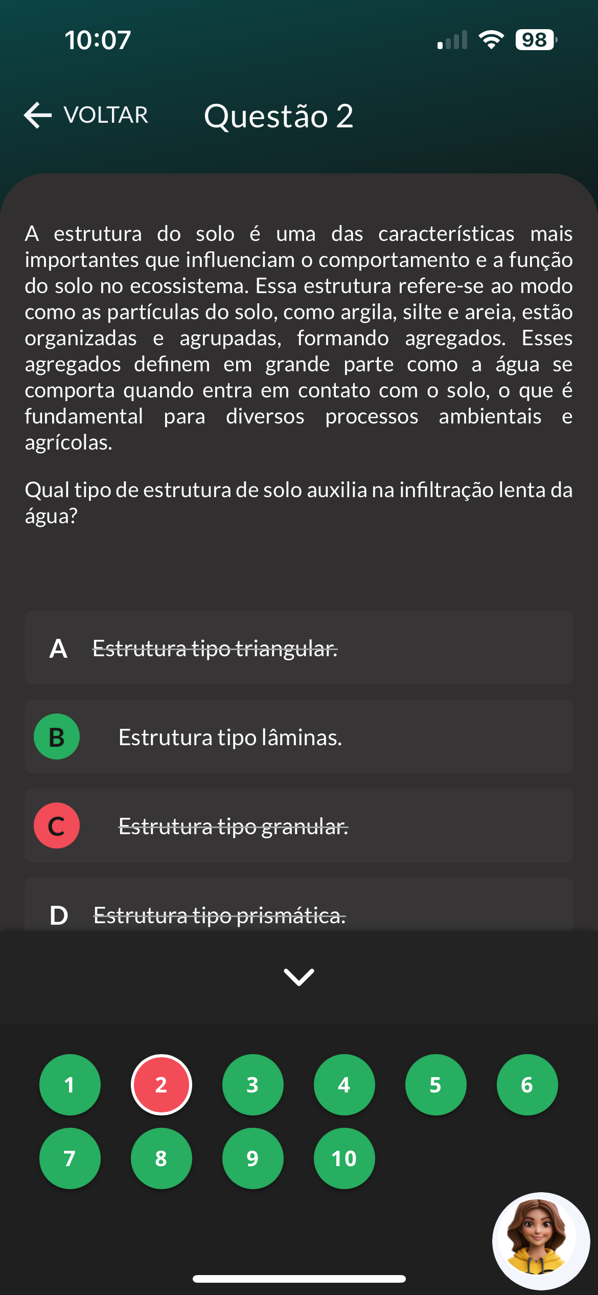 10:07 98 VOLTAR Questão 2 A estrutura do solo é uma das características mais importantes que influenciam comportamento e a função do solo no ecossistema. Essa estrutura refere-se ao modo como as partículas do solo, como argila, silte e areia, estão organizadas e agrupadas, formando agregados. Esses agregados definem em grande parte como a água se comporta quando entra em contato com solo, que é fundamental para diversos processos ambientais e agrícolas. Qual tipo de estrutura de solo auxilia na infiltração lenta da água? A Estrutura tipo triangular. B Estrutura tipo lâminas. Estrutura tipo granular. D Estrutura tipo prismática. 1 2 3 4 5 6 7 8 9 10