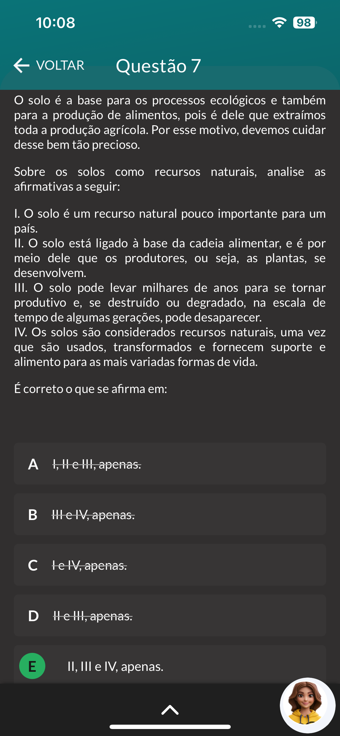 10:08 98 VOLTAR Questão 7 solo é a base para os processos ecológicos e também para a produção de alimentos, pois é dele que extraímos toda a produção agrícola. Por esse motivo, devemos cuidar desse bem tão precioso. Sobre os solos como recursos naturais, analise as afirmativas a seguir: I. solo é um recurso natural pouco importante para um país. II. solo está ligado à base da cadeia alimentar, e é por meio dele que os produtores, ou seja, as plantas, se desenvolvem. III. solo pode levar milhares de anos para se tornar produtivo e, se destruído ou degradado, na escala de tempo de algumas gerações, pode desaparecer. IV. Os solos são considerados recursos naturais, uma vez que são usados, transformados e fornecem suporte e alimento para as mais variadas formas de vida. É correto que se afirma em: A c D E II, III e IV, apenas.