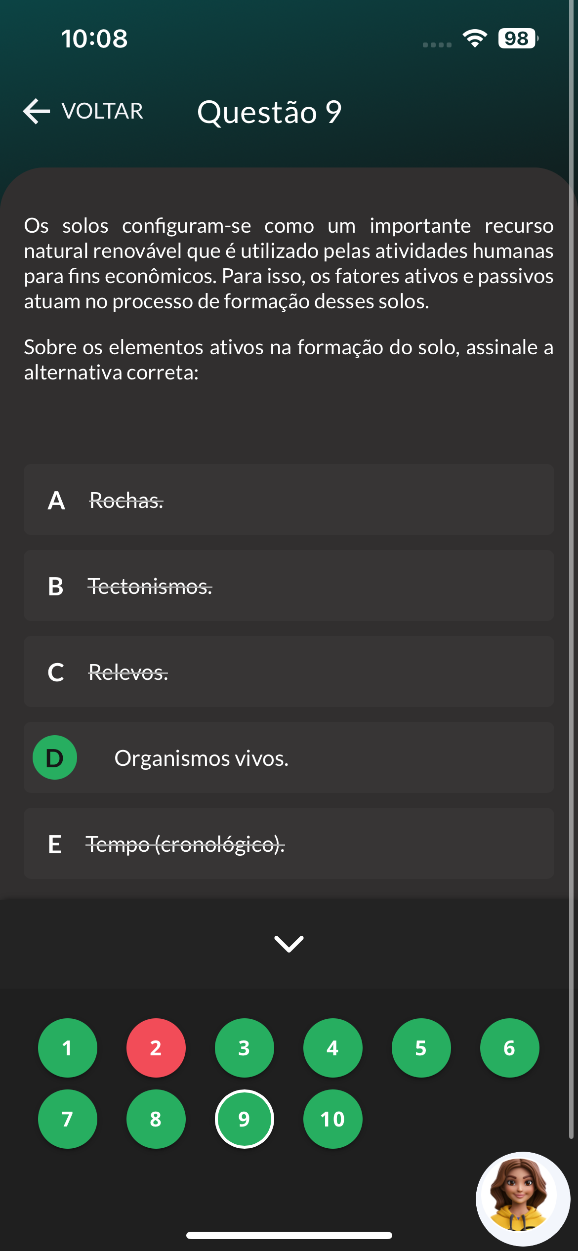 10:08 98 VOLTAR Questão 9 Os solos configuram-se como um importante recurso natural renovável que é utilizado pelas atividades humanas para fins econômicos. Para isso, os fatores ativos e passivos atuam no processo de formação desses solos. Sobre os elementos ativos na formação do solo, assinale a alternativa correta: A Rochas. Tectonismos. c Relevos. D Organismos vivos. E Tempo (cronológico). 1 2 3 4 5 6 7 8 9 10
