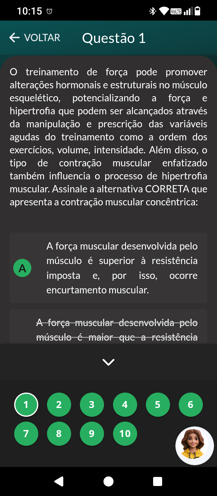 10:15 VOLTAR Questão 1 treinamento de força pode promover alterações hormonais e estruturais no músculo esquelético, potencializando a força e hipertrofia que podem ser alcançados através da manipulação e prescrição das variáveis agudas do treinamento como a ordem dos exercícios, volume, intensidade. Além disso, tipo de contração muscular enfatizado também influencia processo de hipertrofia muscular. Assinale a alternativa CORRETA que apresenta a contração muscular concêntrica: A força muscular desenvolvida pelo músculo é superior à resistência A imposta e, por isso, ocorre encurtamento muscular. A força muscular desenvolvida pelo músculo é maior que a resistência 1 2 3 4 5 6 7 8 9 10