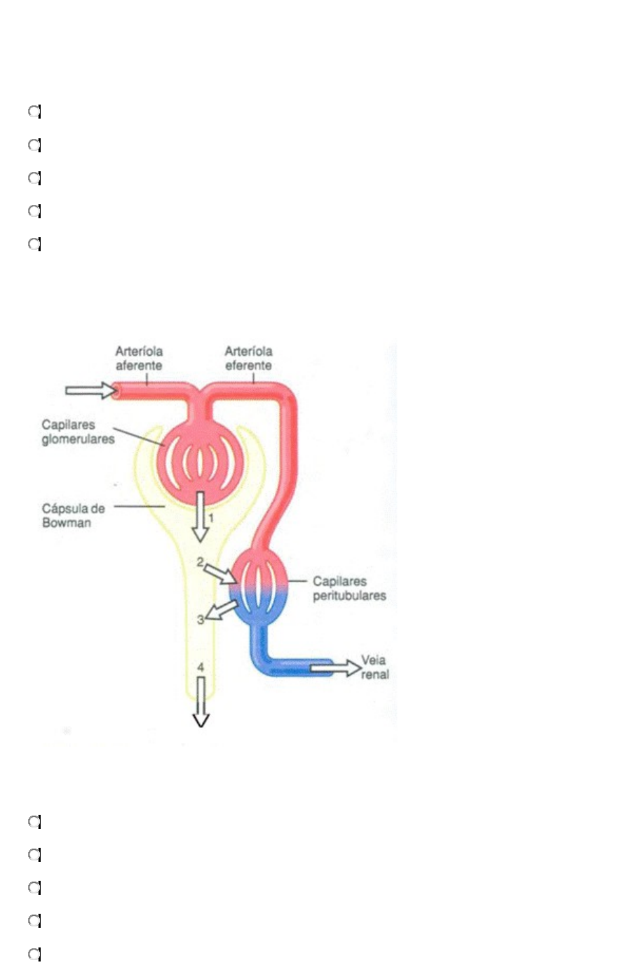 PERGUNTA 1 1. A formação da urina começa com a ________________ de grandes quantidades de líquidos através dos capilares ________________ para o interior de ______________. Assinale a alternativa que preenche as lacunas: a. Absorção, peritubulares e túbulo proximal. b. Filtração, tubulares e túbulo distal. c. Filtração, glomerulares e cápsula de Bowman. d. Reabsorção, glomerulares e cápsula de Bowman. e. Absorção, tubulares e cápsula de Bowman. PERGUNTA 2 Com base na figura, indique as etapas da formação da urina apontadas nos números 1 a 4: Fonte: acervo próprio a. 1. Filtração; 2. Reabsorção; 3. Secreção e 4. Excreção. b. 1. Reabsorção; 2. Filtração; 3. Excreção e 4. Secreção. c. 1. Secreção; 2. Reabsorção; 3. Filtração e 4. Excreção. d. 1. Filtração; 2. Eliminação; 3. Reabsorção e 4. Excreção. e. 1. Filtração; 2. Absorção; 3. Reabsorção e 4. Eliminação. PERGUNTA 3 Dentre as inúmeras funções dos rins, não podemos citar: a. Excreção de resíduos de metabolismo e substâncias tóxicas como fármacos. b. Regulação hidroeletrolítica. c. Regulação da pressão arterial. d. Regulação acidobásico. e. Regulação da secreção suprarrenal. PERGUNTA 4 A função primordial do sistema renal visa, entre outros fatores, a manter a homeostasia entre os fluidos dentro de cada compartimento corpóreo e esse papel é desempenhado por um ajuste fino entre alguns hormônios que regulam quanto os rins devem eliminar ou reabsorver determinada substância. Diante disso, assinale verdadeiro ou falso: ( ) A angiotensina atua como um potente vasoconstritor auxiliando no controle renal da pressão arterial. ( ) O ADH é um hormônio secretado pelas glândulas suprarrenais e regula a reabsorção de Na+ e excreção de K+. ( ) A aldosterona atua diretamente aumentando a reabsorção de água com a finalidade de aumentar o volume sanguíneo, diminuindo a pressão arterial. a. V, V e F. b. V, F e F. c. F, F e V. d. F, V e F. e. V, F e V. PERGUNTA 5 Qual dos seguintes fatores, quando reduzido, tende a aumentar a pressão do pulso? a. Pressão sistólica. b. Volume sistólico. c. Complacência arterial. d. Retorno venoso. e. Volume plasmático. PERGUNTA 6 Qual das alterações seria esperada em um paciente com diabetes insípido decorrente da falta de secreção de hormônio antidiurético (ADH)? a. Equilíbrio na concentração de osmolaridade no plasma; equilíbrio na concentração de potássio no plasma; diminuição de renina plasma e aumento no volume de urina. b. Equilíbrio na concentração de osmolaridade no plasma; equilíbrio na concentração de potássio no plasma; aumento de renina plasma e aumento no volume de urina. c. Aumento na concentração de osmolaridade no plasma; aumento na concentração de potássio no plasma; aumento de renina plasma e aumento no volume de urina. d. Aumento na concentração de osmolaridade no plasma; aumento na concentração de potássio no plasma; equilíbrio de renina plasma e equilíbrio no volume de urina. e. Diminuição na concentração de osmolaridade no plasma; diminuição na concentração de potássio no plasma; diminuição de renina plasma e equilíbrio no volume de urina. PERGUNTA 7 Qual das opções poderia provavelmente levar à hiponatremia? a. Secreção excessiva de hormônio antidiurético. b. Restrição na ingestão de líquidos. c. Secreção excessiva de aldosterona. d. Administrado de 2 L de soluto de cloreto de sódio a 3%. e. Administrado de 2 L de soluto de cloreto de sódio a 0,9%. PERGUNTA 8 Em um leito vascular muscular, o diâmetro de uma arteríola pré-capilar está aumentado. De qual dos seguintes fatores se espera que tenha diminuído? a. Taxa de filtrado capilar. b. Condutância vascular. c. Fluxo sanguíneo capilar. d. Pressão hidrostática capilar. e. Resistência arteriolar. PERGUNTA 9 Um homem de 50 anos de idade relata história de hipertensão há três anos. Queixa-se de fadiga e câimbras musculares esporádicas. Não há história familiar de hipertensão. O paciente não teve outro problema médico significativo no passado. O exame físico revelou pressão arterial de 168/104 mmHg. Os exames laboratoriais complementares indicam que o paciente tem hiperaldosteronismo primário. Qual dos seguintes conjuntos de achados se espera encontrar nesse homem com hipertensão por hiperaldosteronismo primário? a. Aumento do líquido extracelular; aumento da atividade de renina no plasma e aumento da concentração de potássio no plasma. b. Aumento do líquido extracelular; diminuição da atividade de renina no plasma e aumento da concentração de potássio no plasma. c. Aumento do líquido extracelular; diminuição da atividade de renina no plasma e diminuição da concentração de potássio no plasma. d. Aumento do líquido extracelular; aumento da atividade de renina no plasma e diminuição da concentração de potássio no plasma. e. Diminuição do líquido extracelular; diminuição da atividade de renina no plasma e diminuição da concentração de potássio no plasma. PERGUNTA 10 1. A figura representa a variação da velocidade e da pressão sanguínea ao longo de diferentes vasos. Fonte: acervo próprio Assinale a alternativa correta: a. No interior das artérias, a velocidade é alta para compensar a baixa pressão do sangue. b. No interior das veias, a velocidade é quase nula para compensar a alta pressão do sangue. c. No interior das arteríolas, capilares e vênulas; a velocidade e a pressão são nulas. d. A baixa velocidade do sangue no interior dos capilares facilita as trocas de substâncias entre os capilares e as células. e. A existência de válvulas e a contração dos músculos esqueléticos em torno das artérias ocasionam a diminuição da velocidade do fluxo sanguíneo em direção ao coração. image2.gif image1.wmf image3.gif