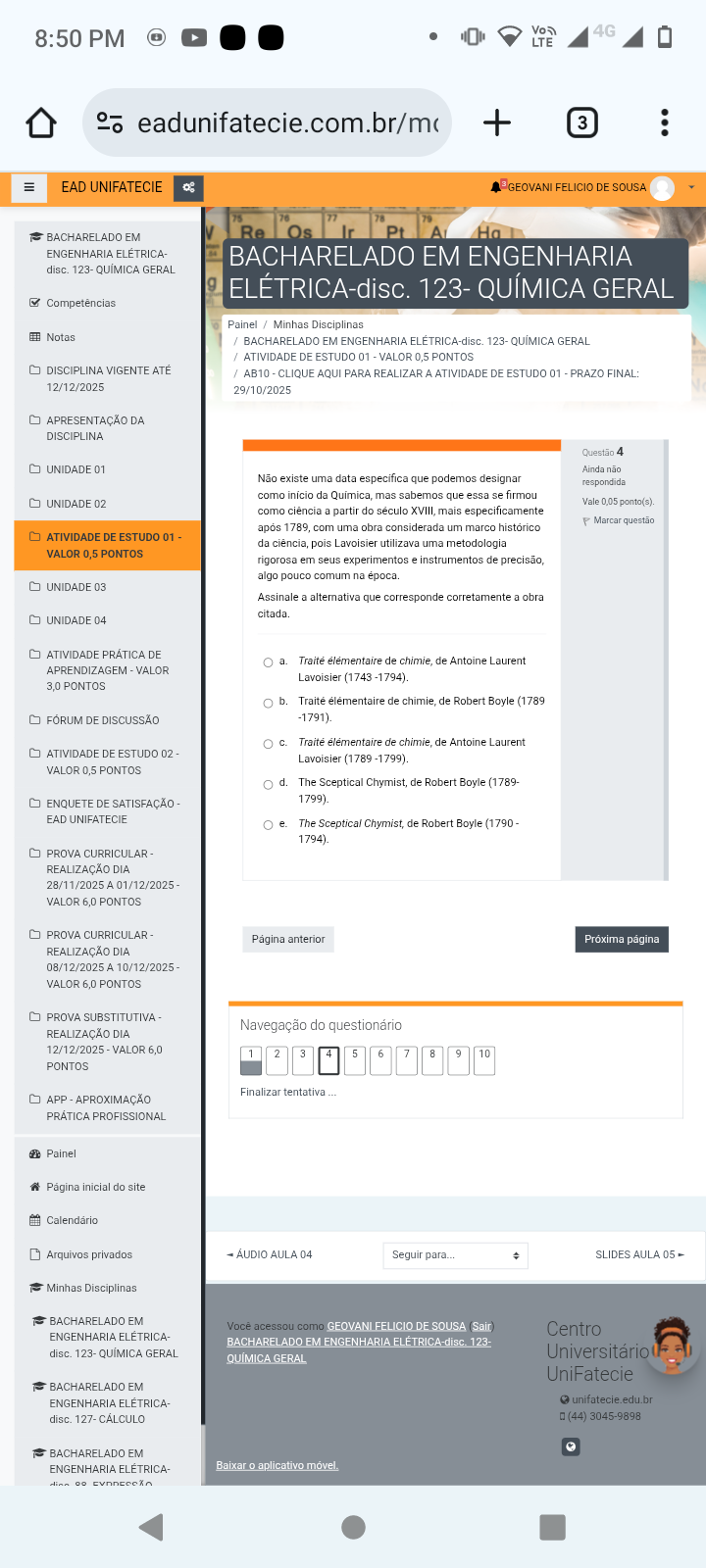 8:50 PM 4G LTE + 3 EAD UNIFATECIE 8 GEOVANI FELICIO DE SOUSA 75 76 77 78 79 BACHARELADO EM Re Os Ir Pt Ha ENGENHARIA ELÉTRICA- BACHARELADO EM ENGENHARIA disc. 123- QUÍMICA GERAL g ELÉTRICA-disc. 123- QUÍMICA GERAL Competências Painel / Minhas Disciplinas Notas / BACHARELADO EM ENGENHARIA 123- QUÍMICA GERAL / ATIVIDADE DE ESTUDO 01 VALOR 0,5 PONTOS DISCIPLINA VIGENTE ATÉ / AB10 CLIQUE AQUI PARA REALIZAR A ATIVIDADE DE ESTUDO 01 PRAZO FINAL: 12/12/2025 29/10/2025 APRESENTAÇÃO DA DISCIPLINA Questão 4 UNIDADE 01 Ainda não Não existe uma data especifica que podemos designar respondida como da Quimica, mas sabemos que essa se firmou UNIDADE 02 Vale 0,05 ponto(s). como ciencia a partir do século XVIII, mais especificamente Marcar questão após com uma obra considerada um marco historico ATIVIDADE DE ESTUDO 01 da pois Lavoisier utilizava uma metodologia VALOR 0,5 PONTOS rigorosa em seus experimentos e instrumentos de precisão, algo pouco comum na UNIDADE 03 Assinale a alternativa que corresponde corretamente a obra UNIDADE 04 ATIVIDADE PRÁTICA DE a. Traité élémentaire de chimie, de Antoine Laurent APRENDIZAGEM VALOR Lavoisier 3,0 PONTOS b. élémentaire de chimie, de Robert Boyle (1789 FORUM DE DISCUSSÃO -1791). Traité élémentaire de chimie, de Antoine Laurent ATIVIDADE DE ESTUDO 02 Lavoisier (1789 -1799). VALOR 0,5 PONTOS d. The Sceptical Chymist, de Robert Boyle (1789- ENQUETE DE SATISFAÇÃO 1799). EAD UNIFATECIE e. The Sceptical Chymist, de Robert Boyle (1790 1794). PROVA CURRICULAR REALIZAÇÃO DIA 28/11/2025 A 01/12/2025 VALOR 6,0 PONTOS PROVA CURRICULAR anterior Próxima página REALIZAÇÃO DIA 08/12/2025 A 10/12/2025 VALOR 6,0 PONTOS PROVA SUBSTITUTIVA Navegação do questionário REALIZAÇÃO DIA 12/12/2025 VALOR 6,0 1 2 3 4 5 6 7 8 9 10 PONTOS Finalizar tentativa APP APROXIMAÇÃO PROFISSIONAL Painel inicial do site Arquivos privados AUDIO AULA 04 Seguir para... SLIDES AULA 05 Minhas Disciplinas BACHARELADO EM acessou como GEOVANI FELICIO Sair Centro ENGENHARIA ELÉTRICA- BACHARELADO EM ENGENHARIA 123- disc. 123- QUÍMICA GERAL QUÍMICA GERAL UniFatecie BACHARELADO EM ENGENHARIA ELÉTRICA- unifatecie.edu.br disc. 127- CALCULO 0 (44) 3045-9898 BACHARELADO EM ENGENHARIA ELÉTRICA- Baixar aplicativo 00