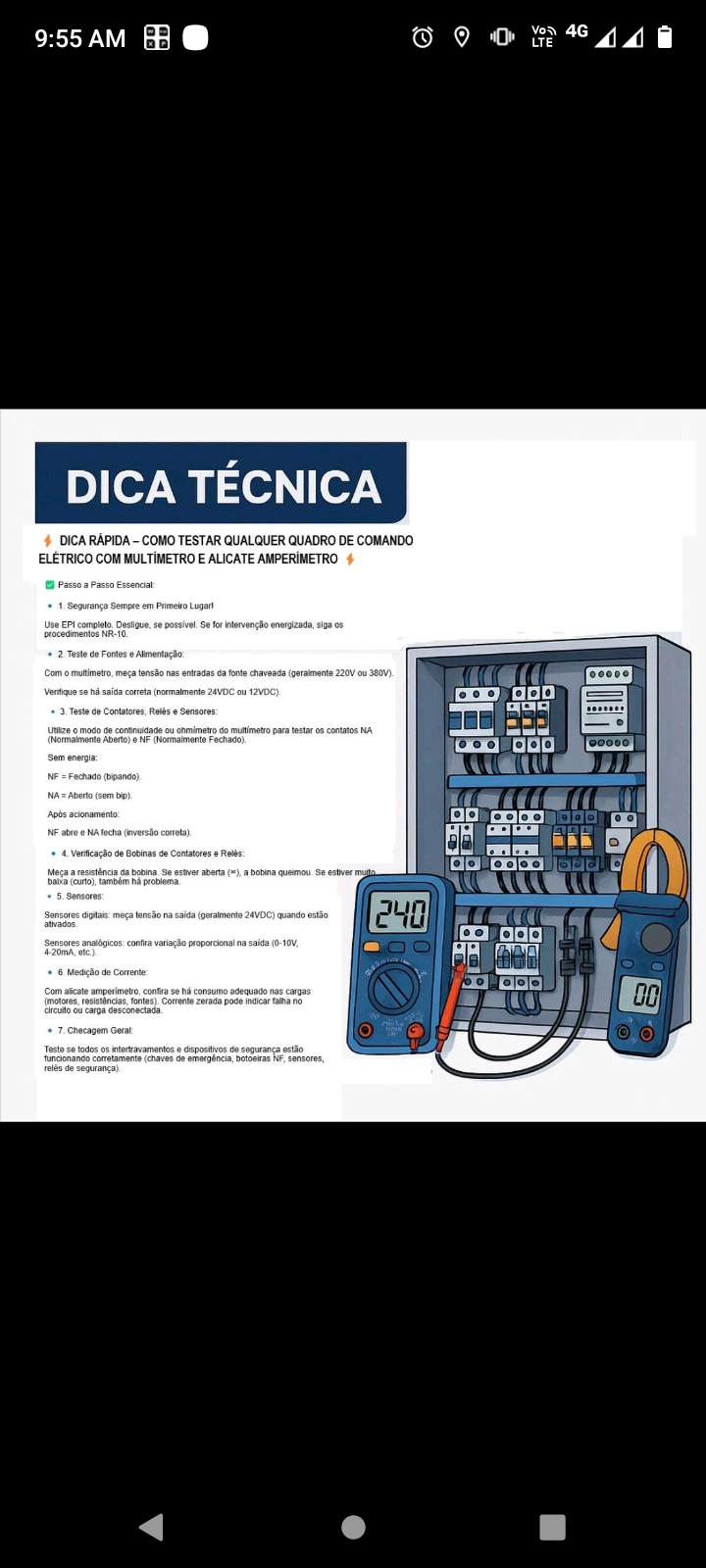 9:55 AM 4G LTE DICA TÉCNICA DICA RÁPIDA COMO TESTAR QUALQUER QUADRO DE COMANDO ELÉTRICO COM MULTIMETRO E ALICATE AMPERIMETRO Passo Passo 1. Segurança Sempre em Primeiro Use EPI se Se for intervenção siga os procedimentos NR-10. Teste de Fontes e Alimentação: Com 0 meça tensão nas entradas da fonte chaveada (geralmente 220V ou 380V). ..... Verifique se saida correta (normalmente 24VDC ou 12VDC) 3. Teste de Reles e Utilize 0 modo de continuidade ou ohmimetro do multimetro para testar contatos NA (Normalmente Aberto) NF (Normalmente 0 Sem energia: NF = Fechado (bipando) NA = Aberto (sem bip). NF abre e NA fecha (inversão correta) 4. Verificação de Bobinas de Contatores e Reles: Meça a resistência da bobina Se estiver aberta a bobina Se estiver também problema 5. Sensores meça tensão na (geralmente 24VDC) quando estão 240 ativados Sensores confira variação proporcional na saida 4-20mA Medição de Corrente Com alicate confira se ha consumo adequado nas cargas fontes) Corrente zerada pode indicar no 00 circuito ou carga desconectada 7. Checagem Geral Teste se todos os intertravamentos e dispositivos de segurança estão funcionando corretamente (chaves de botoeiras de