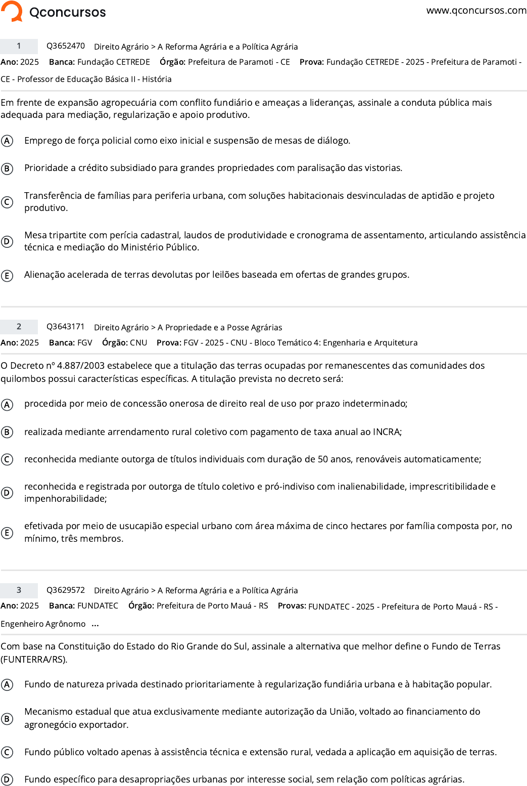 www.qconcursos.com Ano: 2025 Banca: Fundação CETREDE Órgão: Prefeitura de Paramoti - CE Em frente de expansão agropecuária com conflito fundiário e ameaças a lideranças, assinale a conduta pública mais adequada para mediação, regularização e apoio produtivo. A Emprego de força policial como eixo inicial e suspensão de mesas de diálogo. B Prioridade a crédito subsidiado para grandes propriedades com paralisação das vistorias. C Transferência de famílias para periferia urbana, com soluções habitacionais desvinculadas de aptidão e projeto produtivo. D Mesa tripartite com perícia cadastral, laudos de produtividade e cronograma de assentamento, articulando assistência técnica e mediação do Ministério Público. E Alienação acelerada de terras devolutas por leilões baseada em ofertas de grandes grupos. Ano: 2025 Banca: FGV Órgão: CNU O Decreto nº 4.887/2003 estabelece que a titulação das terras ocupadas por remanescentes das comunidades dos quilombos possui características específicas. A titulação prevista no decreto será: A procedida por meio de concessão onerosa de direito real de uso por prazo indeterminado; B realizada mediante arrendamento rural coletivo com pagamento de taxa anual ao INCRA; C reconhecida mediante outorga de títulos individuais com duração de 50 anos, renováveis automaticamente; D reconhecida e registrada por outorga de título coletivo e pró-indiviso com inalienabilidade, imprescritibilidade e impenhorabilidade; E efetivada por meio de usucapião especial urbano com área máxima de cinco hectares por família composta por, no mínimo, três membros. Ano: 2025 Banca: FUNDATEC Órgão: Prefeitura de Porto Mauá - RS Com base na Constituição do Estado do Rio Grande do Sul, assinale a alternativa que melhor define o Fundo de Terras (FUNTERRA/RS). A Fundo de natureza privada destinado prioritariamente à regularização fundiária urbana e à habitação popular. B Mecanismo estadual que atua exclusivamente mediante autorização da União, voltado ao financiamento do agronegócio exportador. C Fundo público voltado apenas à assistência técnica e extensão rural, vedada a aplicação em aquisição de terras. D Fundo específico para desapropriações urbanas por interesse social, sem relação com políticas agrárias. 1 Q3652470 >Direito Agrário A Reforma Agrária e a Política Agrária Prova: Fundação CETREDE - 2025 - Prefeitura de Paramoti - CE - Professor de Educação Básica II - História 2 Q3643171 >Direito Agrário A Propriedade e a Posse Agrárias Prova: FGV - 2025 - CNU - Bloco Temático 4: Engenharia e Arquitetura 3 Q3629572 >Direito Agrário A Reforma Agrária e a Política Agrária Provas: FUNDATEC - 2025 - Prefeitura de Porto Mauá - RS - Engenheiro Agrônomo ... https://www.qconcursos.com/ https://www.qconcursos.com/questoes-de-concursos/bancas/fundacao-cetrede https://www.qconcursos.com/questoes-de-concursos/institutos/prefeitura-de-paramoti-ce https://www.qconcursos.com/questoes-de-concursos/bancas/fgv https://www.qconcursos.com/questoes-de-concursos/institutos/cnu https://www.qconcursos.com/questoes-de-concursos/bancas/fundatec https://www.qconcursos.com/questoes-de-concursos/institutos/prefeitura-de-porto-maua-rs https://www.qconcursos.com/questoes-de-concursos/questoes/5bf371bf-a7 https://www.qconcursos.com/questoes-de-concursos/disciplinas/direito-direito-agrario https://www.qconcursos.com/questoes-de-concursos/disciplinas/direito-direito-agrario/a-reforma-agraria-e-a-politica-agraria https://www.qconcursos.com/questoes-de-concursos/provas/fundacao-cetrede-2025-prefeitura-de-paramoti-ce-professor-de-educacao-basica-ii-historia https://www.qconcursos.com/questoes-de-concursos/provas/fundacao-cetrede-2025-prefeitura-de-paramoti-ce-professor-de-educacao-basica-ii-historia https://www.qconcursos.com/questoes-de-concursos/questoes/e8ec92ad-a3 https://www.qconcursos.com/questoes-de-concursos/disciplinas/direito-direito-agrario https://www.qconcursos.com/questoes-de-concursos/disciplinas/direito-direito-agrario/a-propriedade-e-a-posse-agrarias https://www.qconcursos.com/questoes-de-concursos/provas/fgv-2025-cnu-bloco-tematico-4-engenharia-e-arquitetura https://www.qconcursos.com/questoes-de-concursos/questoes/dbfc8f5d-9e https://www.qconcursos.com/questoes-de-concursos/disciplinas/direito-direito-agrario https://www.qconcursos.com/questoes-de-concursos/disciplinas/direito-direito-agrario/a-reforma-agraria-e-a-politica-agraria https://www.qconcursos.com/questoes-de-concursos/provas/fundatec-2025-prefeitura-de-porto-maua-rs-engenheiro-agronomo https://www.qconcursos.com/questoes-de-concursos/provas/fundatec-2025-prefeitura-de-porto-maua-rs-engenheiro-agronomo E Instrumento do Estado destinado a prover recursos para assentamentos agrários e para a concessão de crédito fundiário. Ano: 2025 Banca: AMAUC Órgão: Consórcio Lambari A Lei n° 11.952/2009 discorre sobre a regularização fundiária das ocupações incidentes em terras situadas em áreas da União, no âmbito da Amazônia Legal. Para a regularização da ocupação fundiária em áreas rurais, nos termos desta Lei, o ocupante e seu cônjuge ou companheiro deverão atender a alguns requisitos. Dentre eles, assinale a alternativa CORRETA. A Pode ou não ser brasileiro nato ou naturalizado. B Não praticar cultura efetiva. C Ser proprietário de imóvel rural em qualquer parte do território nacional. D Não ter sido beneficiado por programa de reforma agrária, ressalvadas as situações admitidas pelo Ministério do Desenvolvimento Agrário. E Comprovar o exercício de ocupação e exploração direta, mansa e pacífica, por si ou por seus antecessores, anterior a 22 de julho de 2023. Ano: 2025 Banca: OBJETIVA Órgão: Prefeitura de Guadalupe - PI Baseando-se na Lei nº 8.171/1991 − Política Agrícola, o crédito rural é essencial para o financiamento da agricultura, sendo oferecido por todas as instituições financeiras, sem distinçã